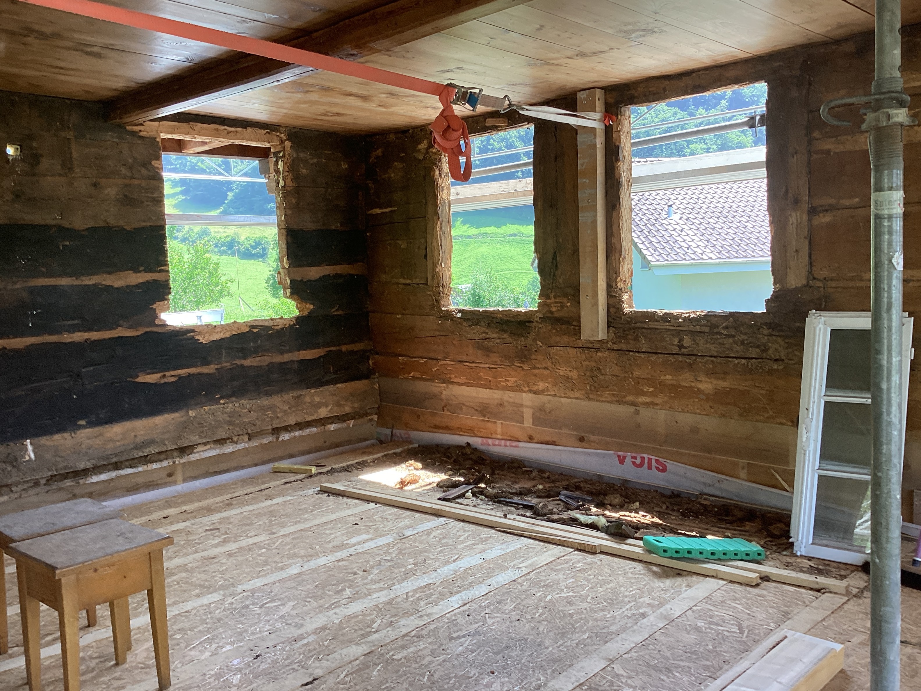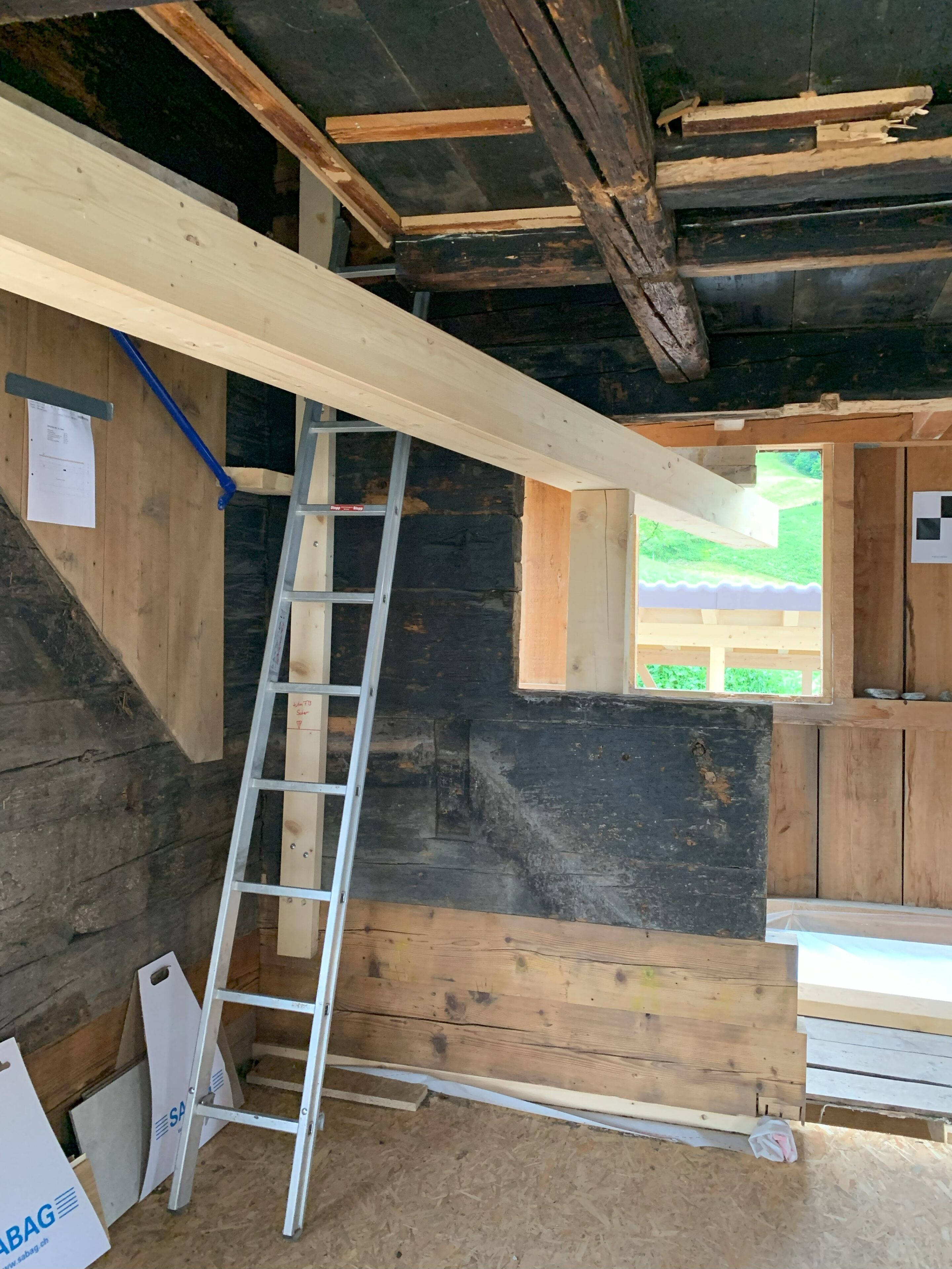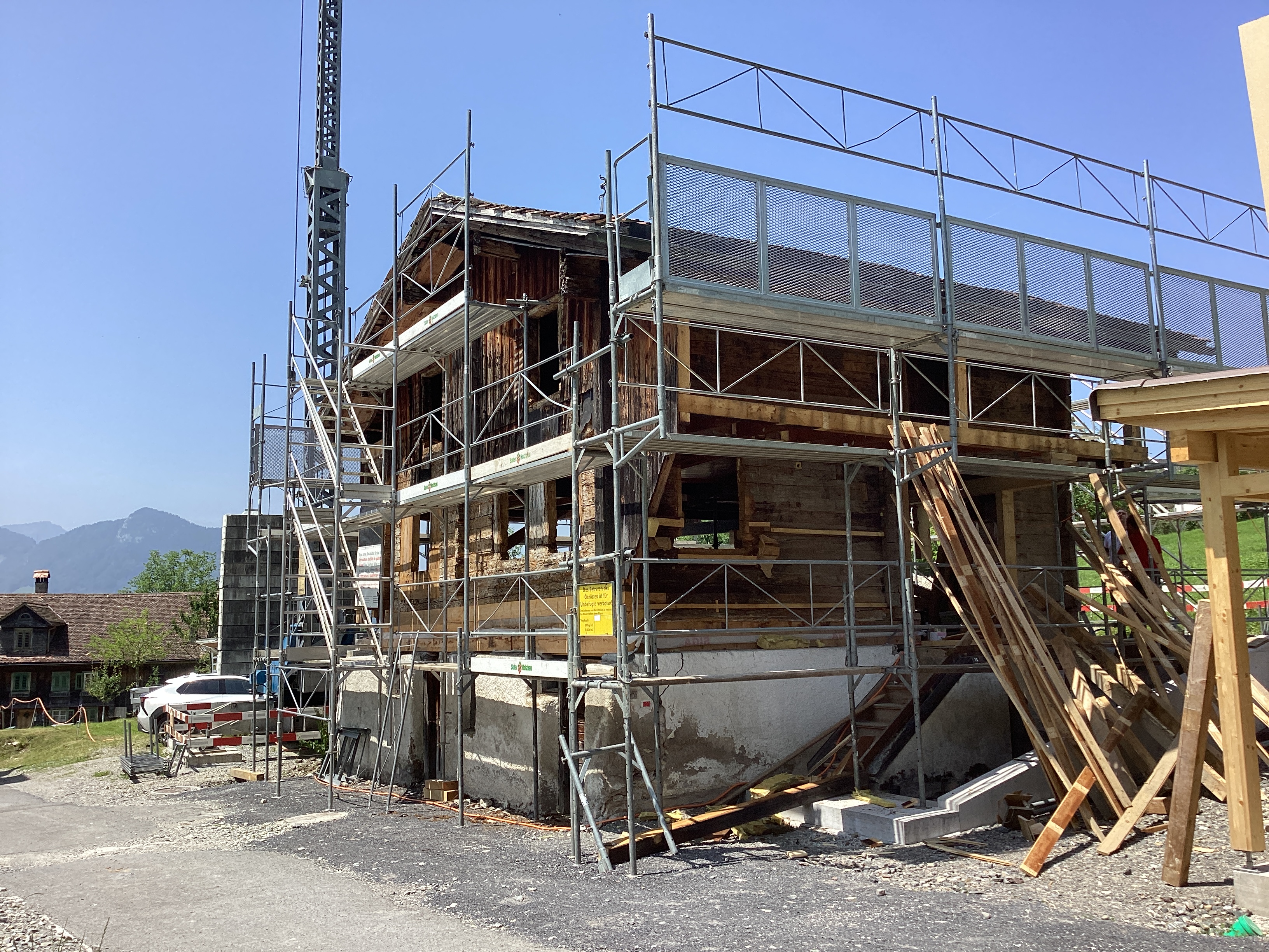 Das ‘Haus Acherli’ wurde ab Frühjahr 1270 als zweigeschossiges Blockgefüge auf hohem gemauertem Sockel erbaut. Mit seiner Grundrissdisposition und den typischen Konstruktionsmerkmalen gehört das Haus zur spätmittelalterlichen Wohnbaugruppe in der Innerschweiz. Das Gebäude ist als wertvolles Kleinbauernhaus eingestuft worden und ist Bestandteil des Schutzumfanges. Der Anteil von originaler Bausubstanz ist sehr hoch und diese soll unbedingt erhalten bleiben, deshalb wird der Umbau eng durch das Amt für Kultur begleitet. Das bestehende Haus wird saniert und durch einen Anbau auf der Nordseite ergänzt. Im Erdgeschoss wird die Laube Ost leicht ausgebaut und dient neu als Windfang. Die beiden Zimmer an der Südseite behalten ihre ursprüngliche Grösse bei. Im zweigeschossigen Anbau an der Nordseite befindet sich der Koch- und Essbereich. Im Obergeschoss wird der Erschliessungskorridor partiell geöffnet, um die ursprüngliche Funktion der Rauchkammer wieder aufzugreifen. Aufgrund des schlechten Zustandes wird das Dach bis auf die Sparren und deren Pfetten zurück gebaut. Der Anbau wird gleich hoch wie der Bestand erstellt, so dass das Dach die beiden Volumen zu einer Einheit zusammenfasst.