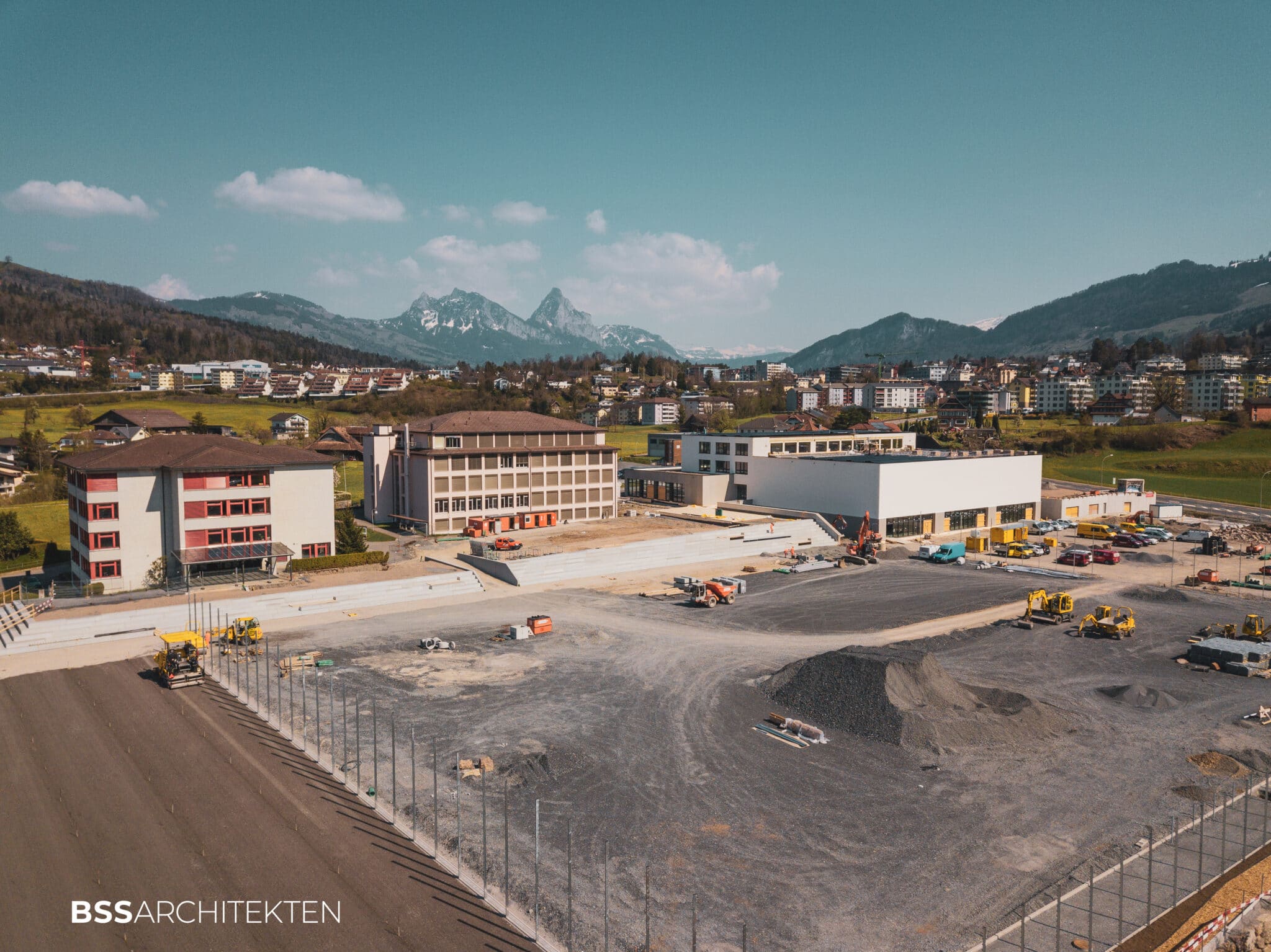 Unsere neuen Drohnenaufnahmen zeigen die Grossbaustelle der Schul- und Sportanlage in Oberarth. Das Gerüst der Dreifachturnhalle wurde nun demontiert.