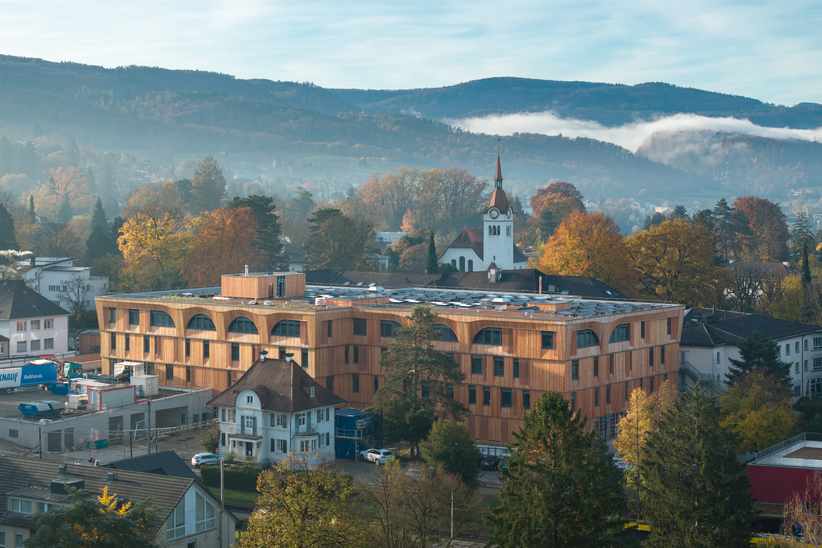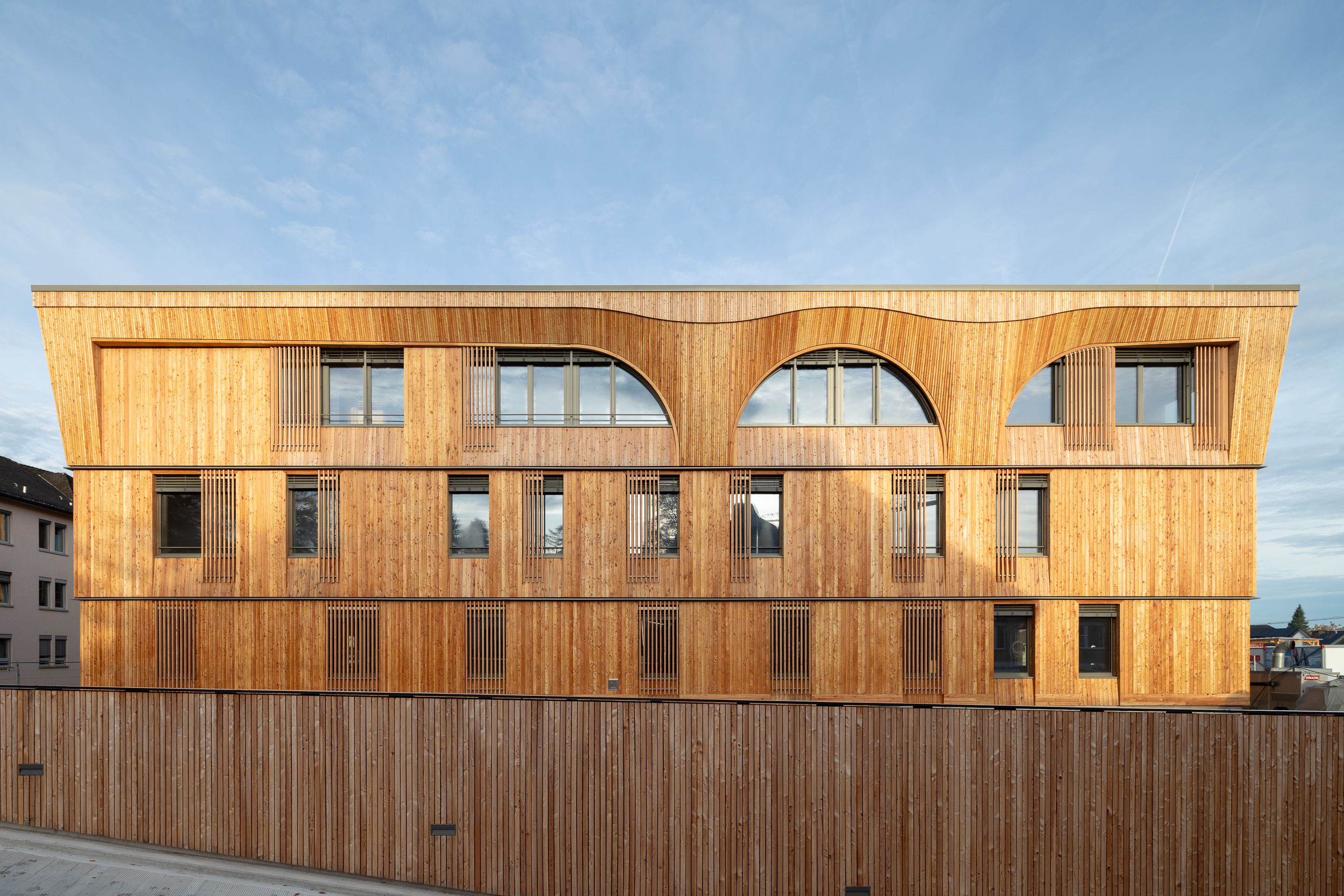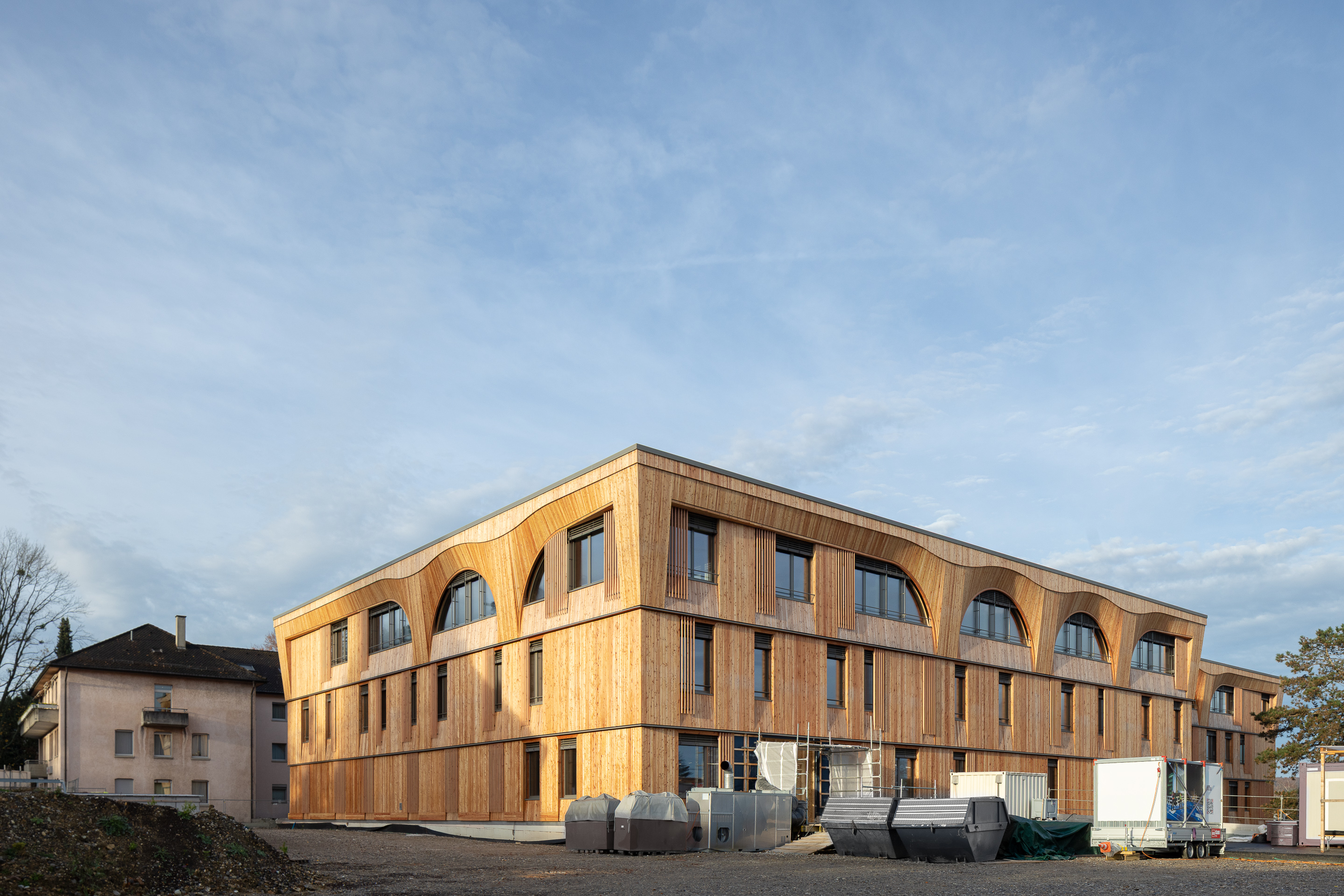 Der Fotograf Stijn Poelstra hat erneut den Baustand mit wunderbaren Bildern festgehalten, welche wir gerne teilen. Die Holzfassade in unbehandeltem Lärchenholz des Neubaus H4H der Klinik Arlesheim AG ist abgeschlossen und damit kommt die Formensprache der Fassade zum Vorschein. Die Strahlkraft des Massivholzbaus in Holz100 wird dadurch weitumher sichtbar.Die in der Fassade des fertiggestellten Heilmittellabors vorhandene geometrisch-flächige Bogenform verwandelt sich im Krankenhaus zu einer skulpturalen dreidimensionalen Fassade mit halbkreisförmigen Fenstern. Die sich wiederholenden Fensterformen und die Plastizität der Holzfassade lassen das Gebäude ein- und ausatmen. Entsprechend der funktionalen Bedeutung sind die Patientenzimmer in der oberen Etage als «Krone» der Klinik platziert.