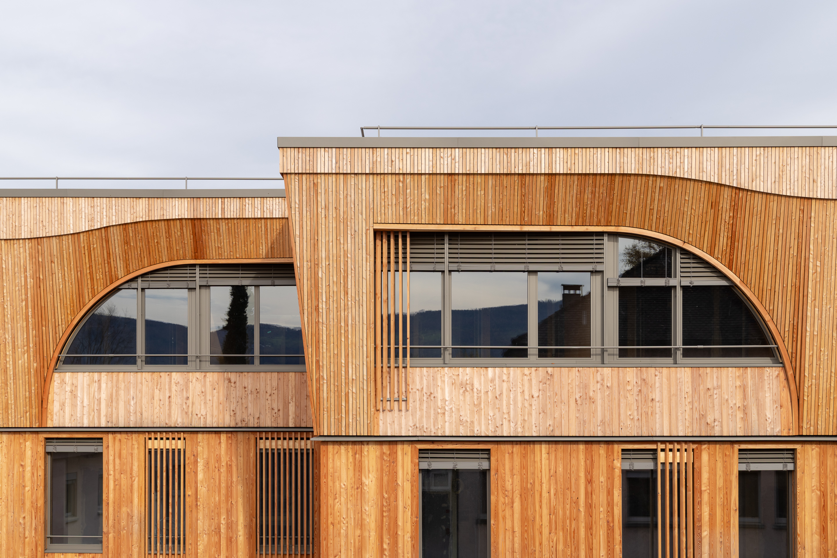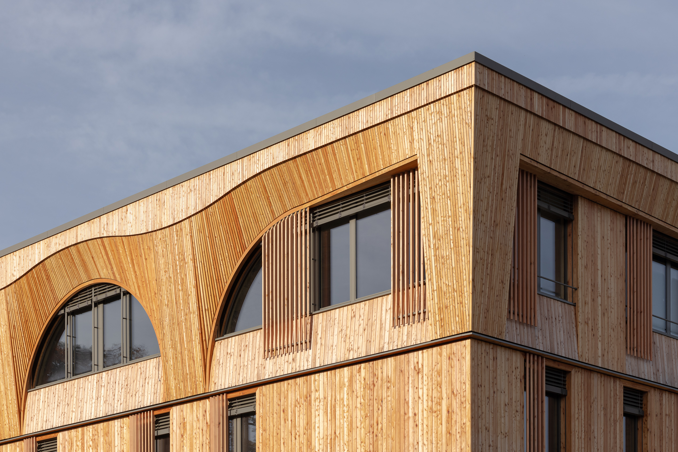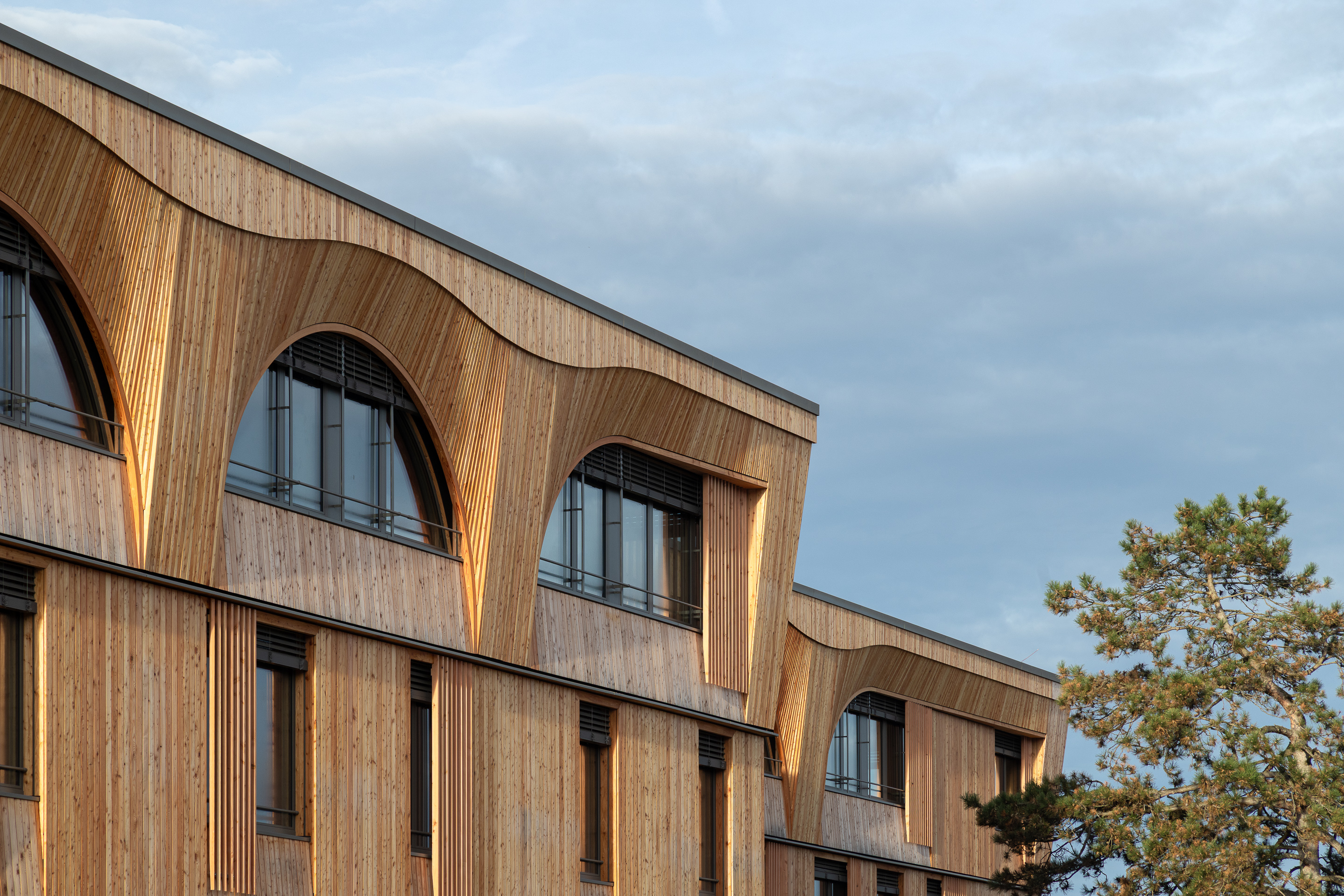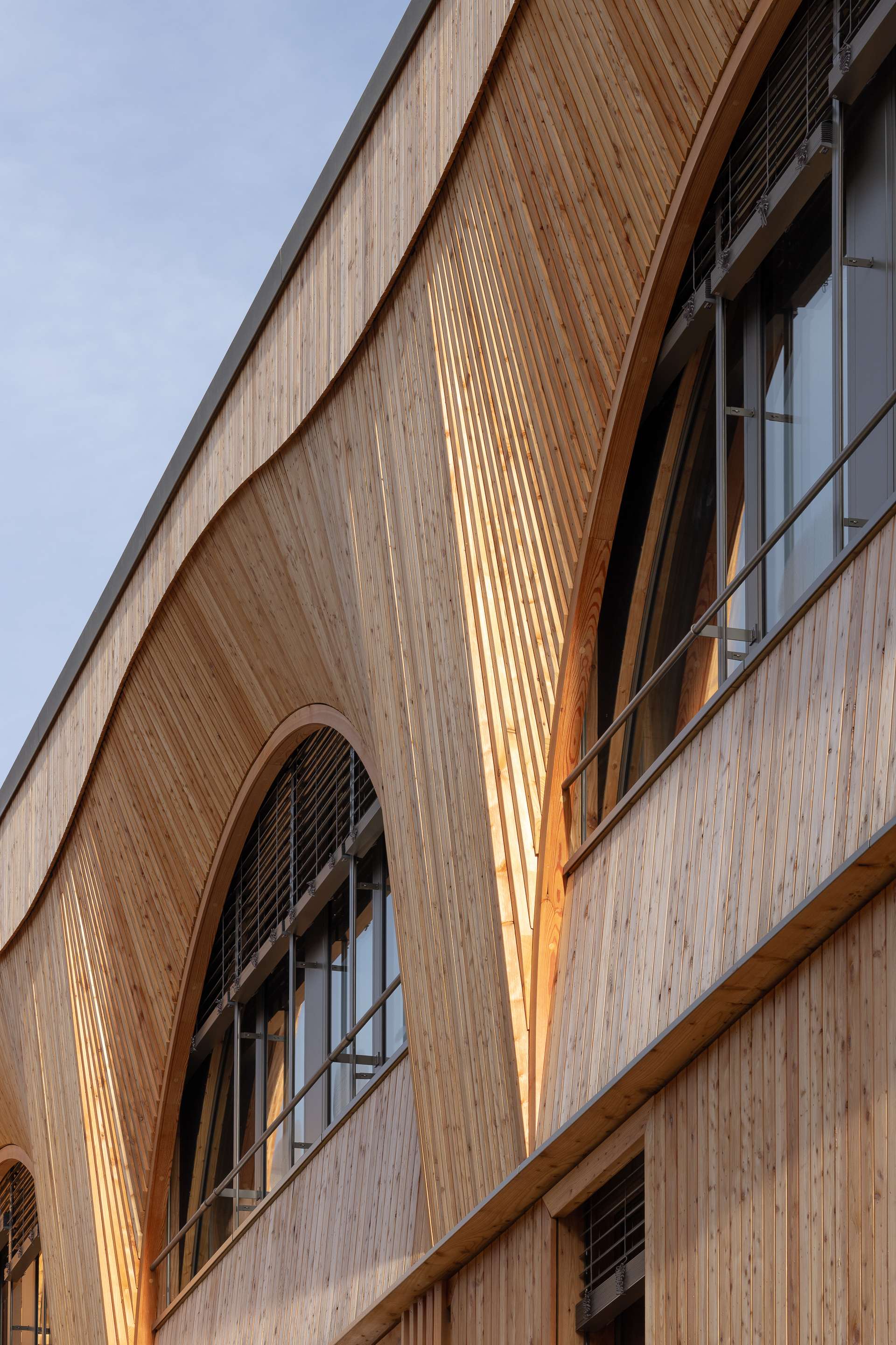 Der Fotograf Stijn Poelstra hat erneut den Baustand mit wunderbaren Bildern festgehalten, welche wir gerne teilen. Die Holzfassade in unbehandeltem Lärchenholz des Neubaus H4H der Klinik Arlesheim AG ist abgeschlossen und damit kommt die Formensprache der Fassade zum Vorschein. Die Strahlkraft des Massivholzbaus in Holz100 wird dadurch weitumher sichtbar.Die in der Fassade des fertiggestellten Heilmittellabors vorhandene geometrisch-flächige Bogenform verwandelt sich im Krankenhaus zu einer skulpturalen dreidimensionalen Fassade mit halbkreisförmigen Fenstern. Die sich wiederholenden Fensterformen und die Plastizität der Holzfassade lassen das Gebäude ein- und ausatmen. Entsprechend der funktionalen Bedeutung sind die Patientenzimmer in der oberen Etage als «Krone» der Klinik platziert.