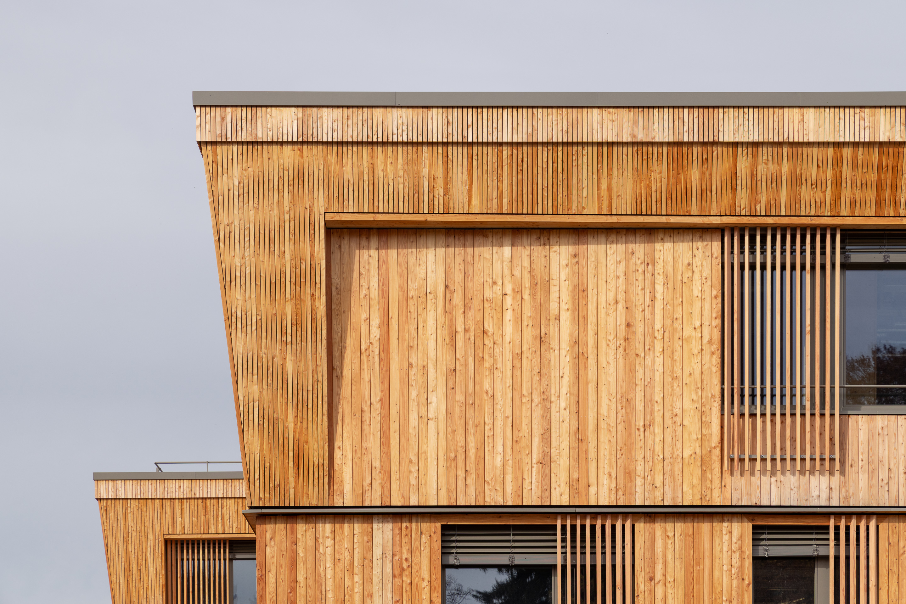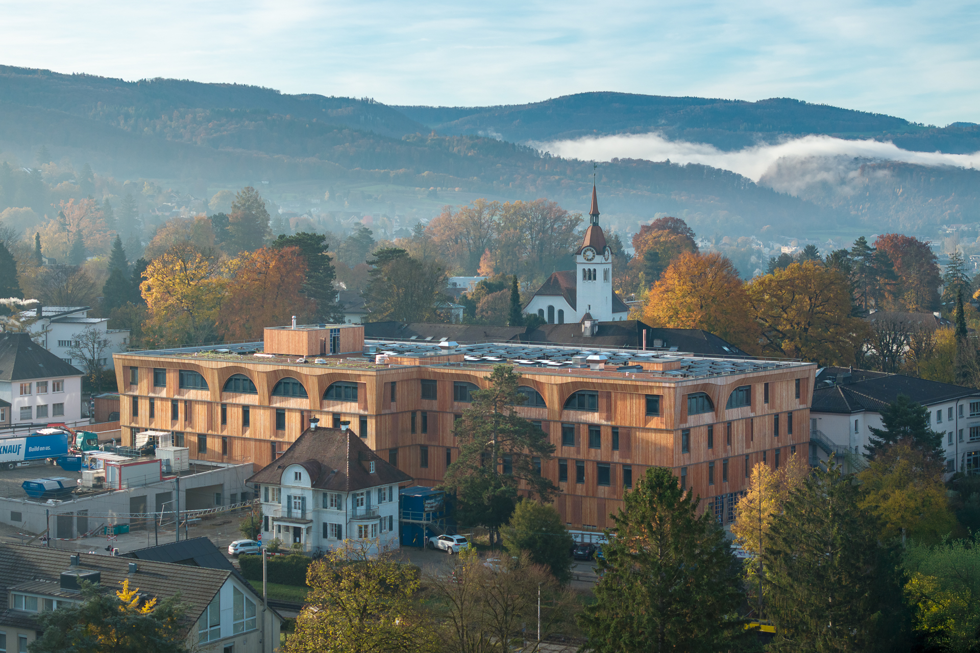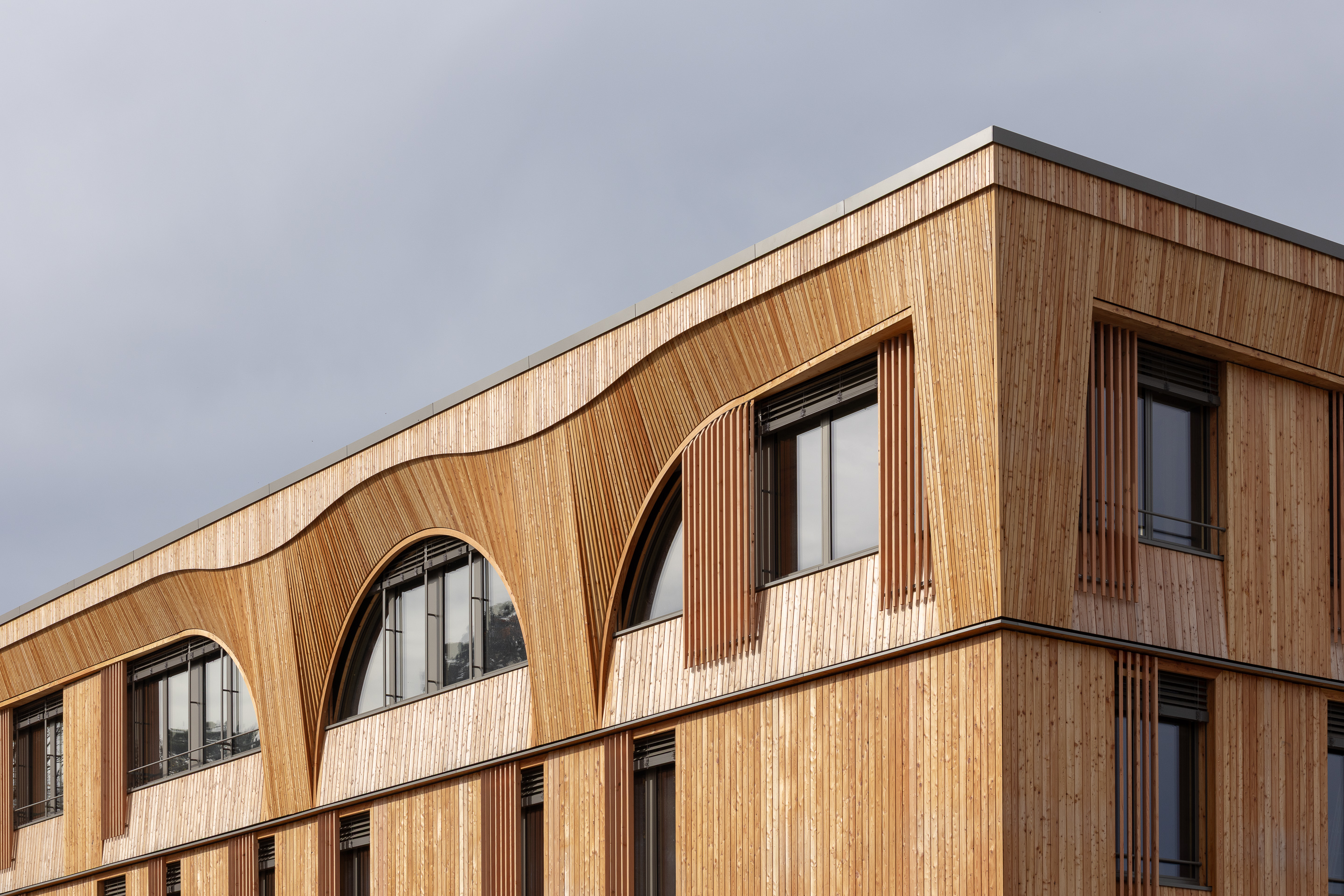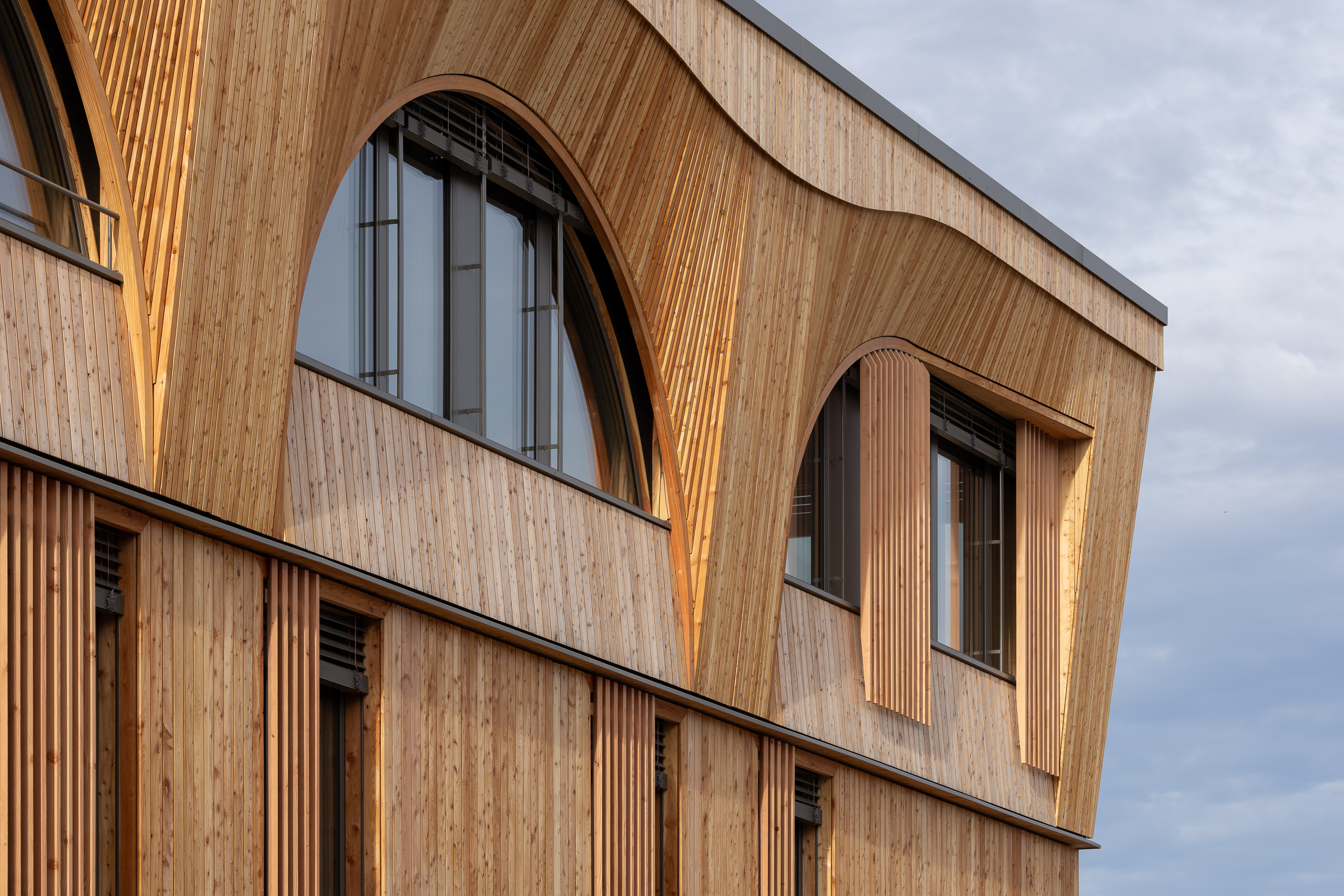Der Fotograf Stijn Poelstra hat erneut den Baustand mit wunderbaren Bildern festgehalten, welche wir gerne teilen. Die Holzfassade in unbehandeltem Lärchenholz des Neubaus H4H der Klinik Arlesheim AG ist abgeschlossen und damit kommt die Formensprache der Fassade zum Vorschein. Die Strahlkraft des Massivholzbaus in Holz100 wird dadurch weitumher sichtbar.Die in der Fassade des fertiggestellten Heilmittellabors vorhandene geometrisch-flächige Bogenform verwandelt sich im Krankenhaus zu einer skulpturalen dreidimensionalen Fassade mit halbkreisförmigen Fenstern. Die sich wiederholenden Fensterformen und die Plastizität der Holzfassade lassen das Gebäude ein- und ausatmen. Entsprechend der funktionalen Bedeutung sind die Patientenzimmer in der oberen Etage als «Krone» der Klinik platziert.