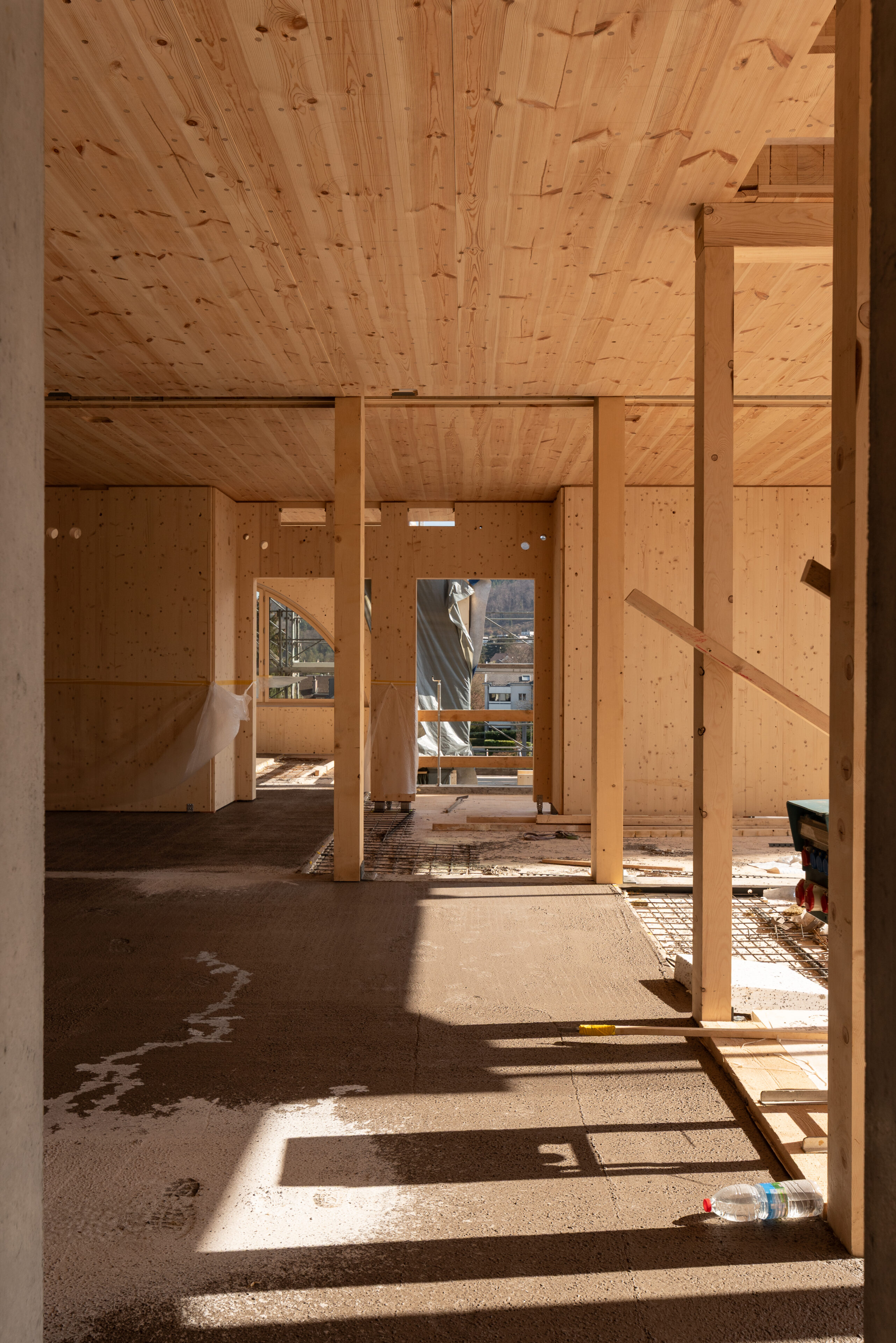 Der einzigartige Massivholzbau der Klinik Arlesheim setzt auf die innovative Holz100 Bauweise, die durch die Verwendung von massivem Mondholz und mechanischen Verbindungen ohne Leim oder chemische Holzschutzmittel besticht.