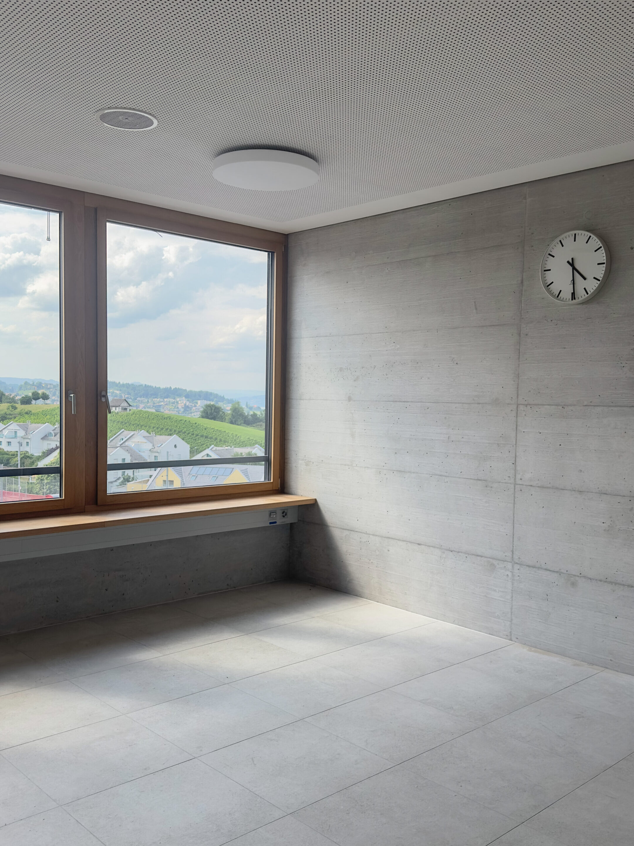 Die neue MZH ergänzt die bestehende Schulanlage Riedmatt und knüpft mit dem markanten Kopfbau nahtlos an den Osttrakt an. So entstehen zusätzliche Räume – und ein barrierefreier Übergang zwischen Alt und Neu.