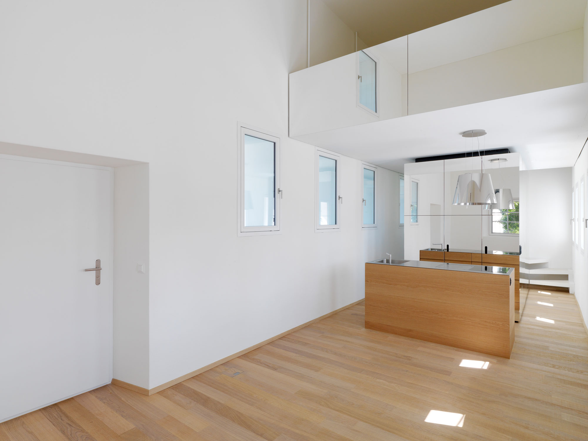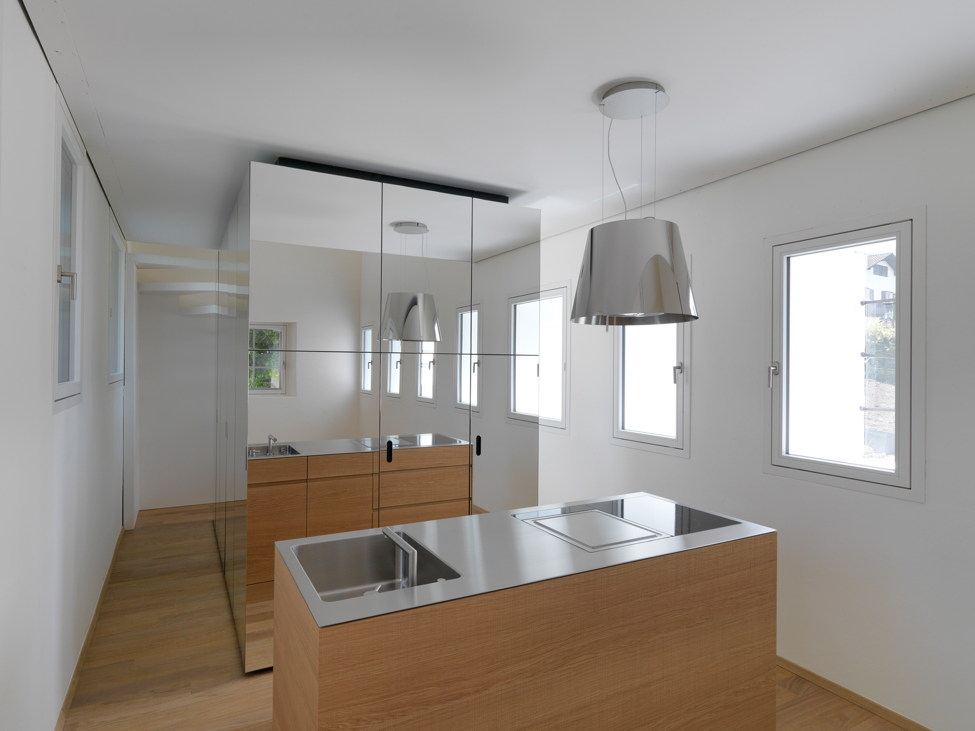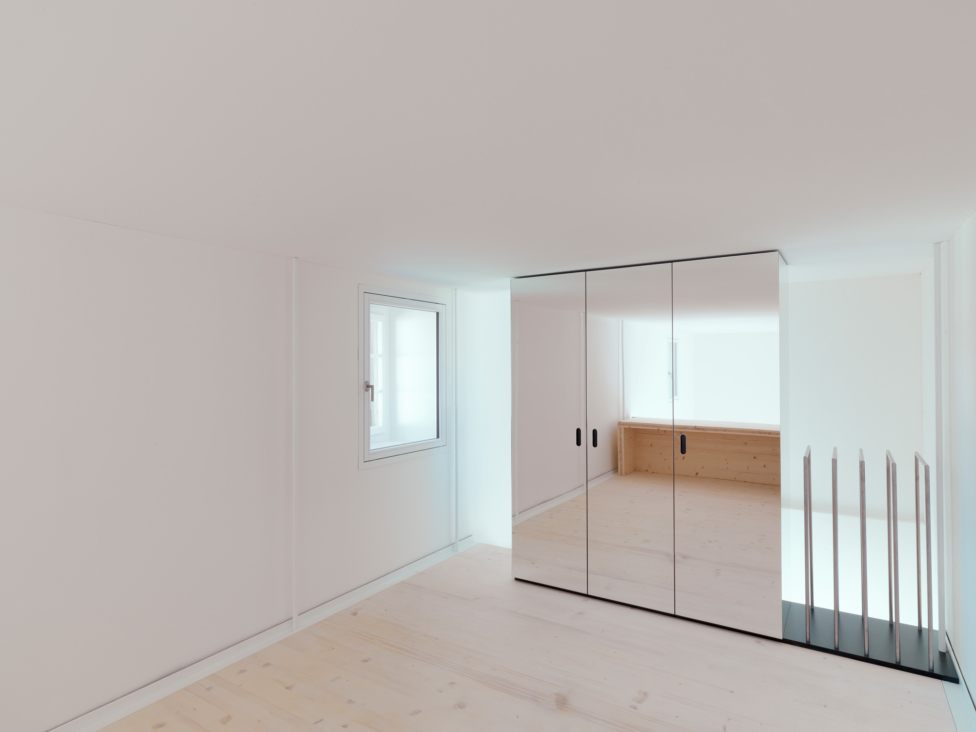 Auf nur 3.2 x 10.6 Metern Grundfläche und einer Galerie von 3.2 x 5.5 m entsteht ein grosszügiges Wohnerlebnis. Die Verspiegelungen der raum trennenden Kuben für alle dienenden Räume bringt eine verblüffende Grosszügigkeit in das kleine Haus.