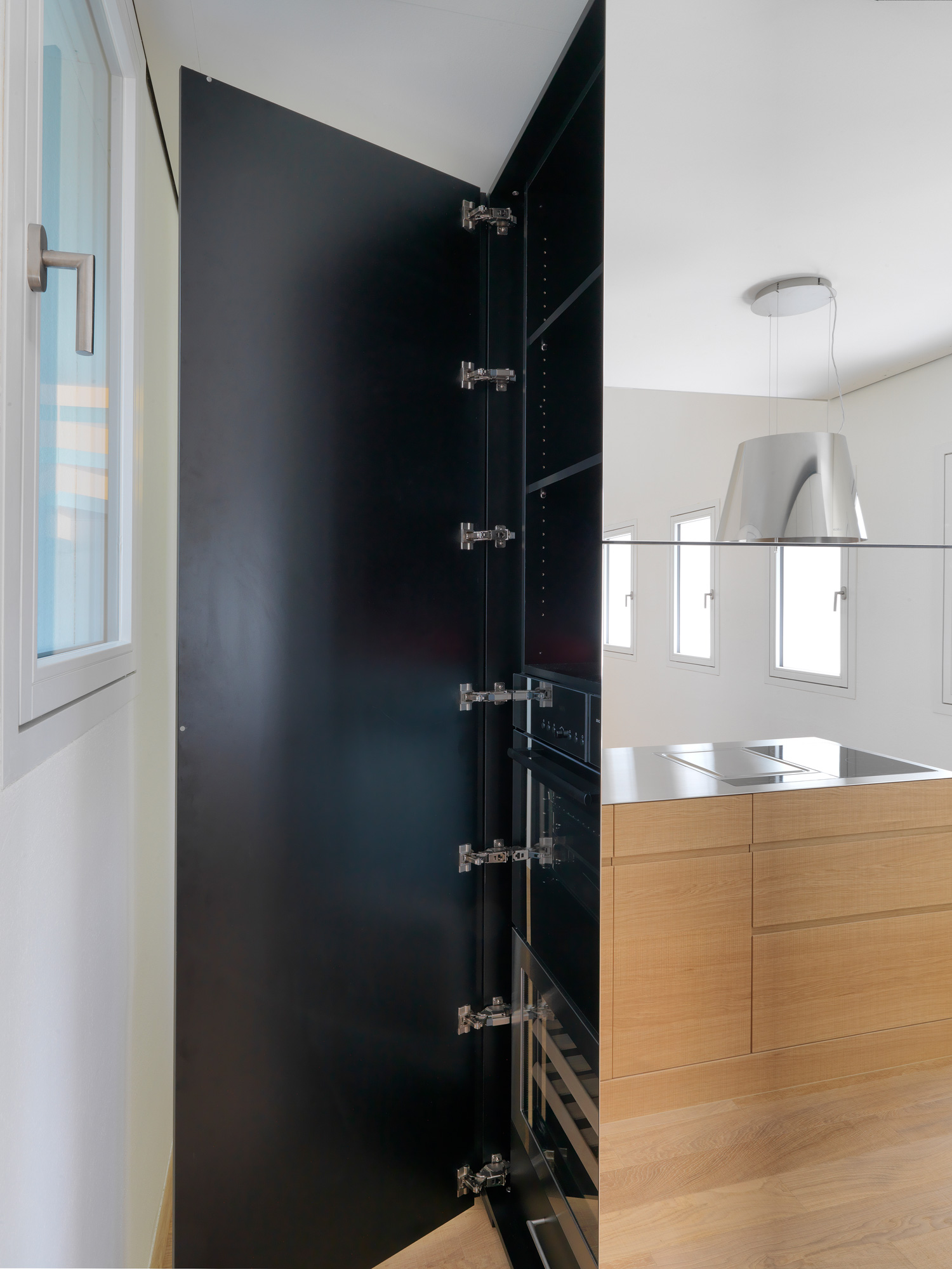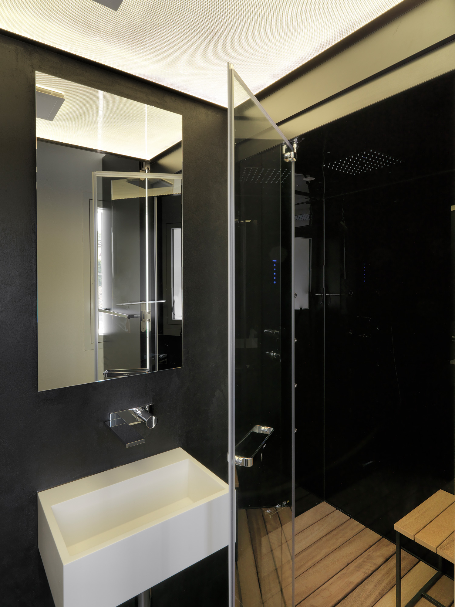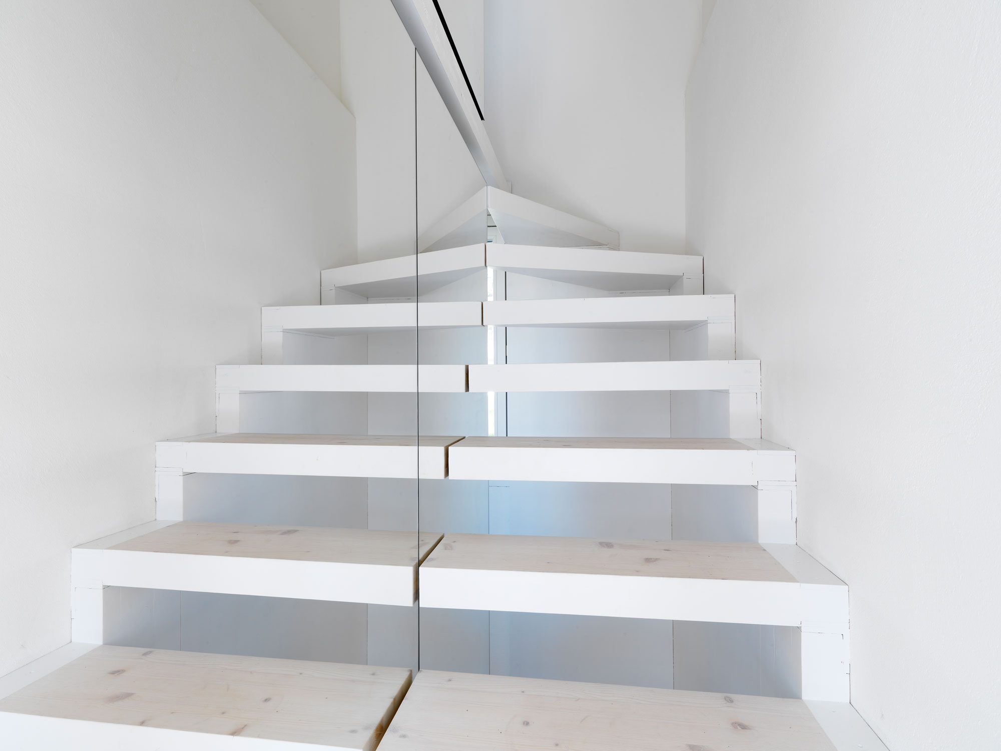 Auf nur 3.2 x 10.6 Metern Grundfläche und einer Galerie von 3.2 x 5.5 m entsteht ein grosszügiges Wohnerlebnis. Die Verspiegelungen der raum trennenden Kuben für alle dienenden Räume bringt eine verblüffende Grosszügigkeit in das kleine Haus.