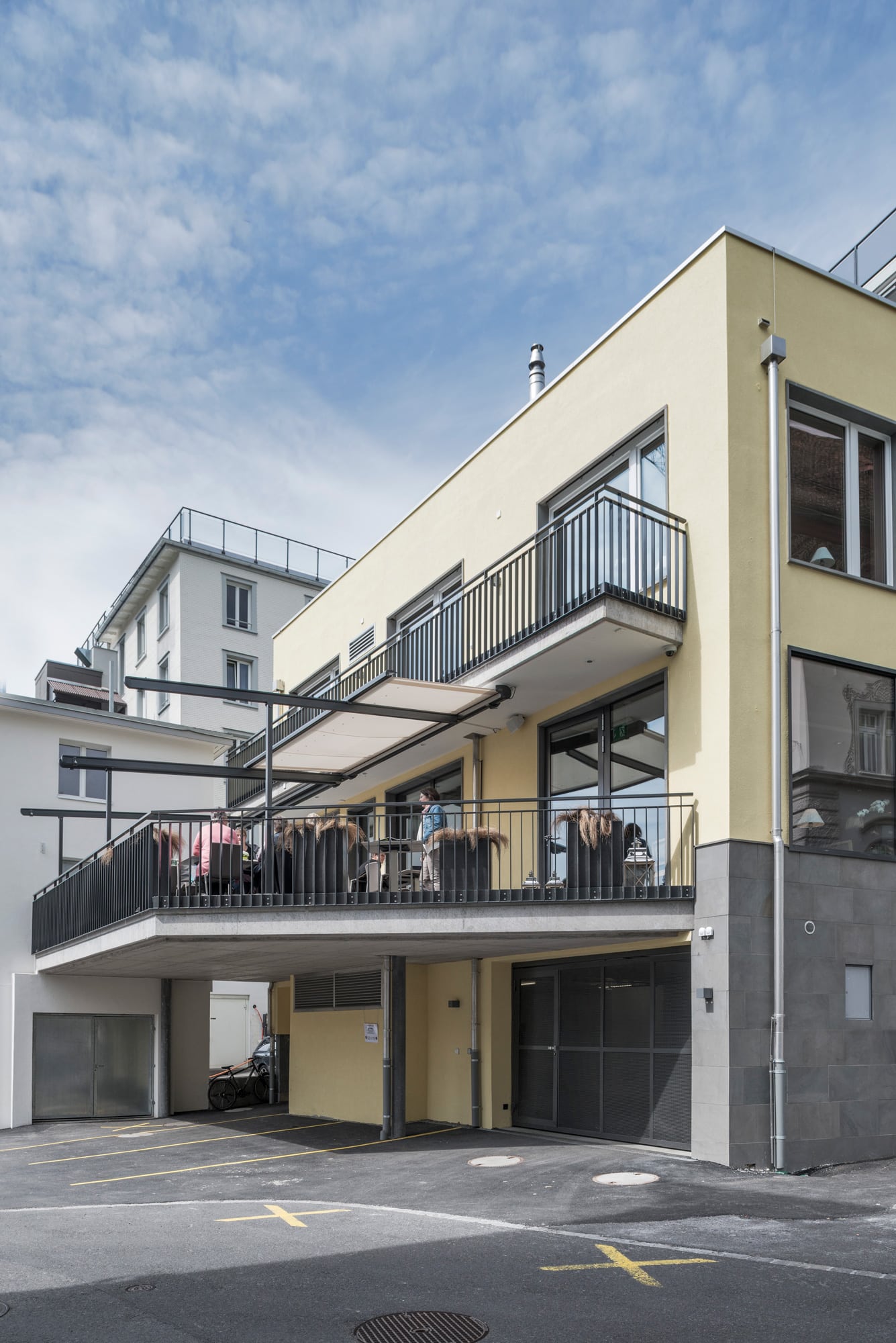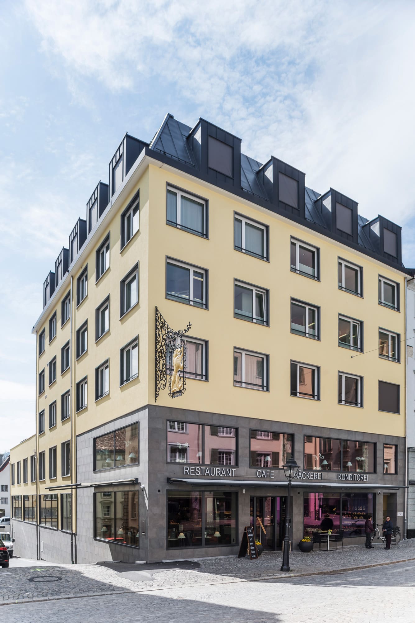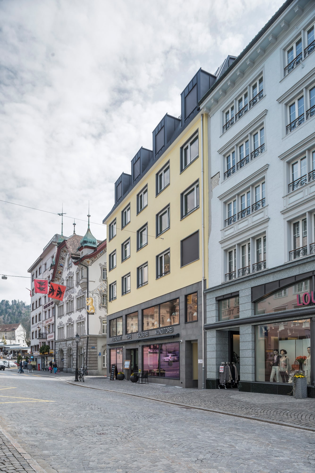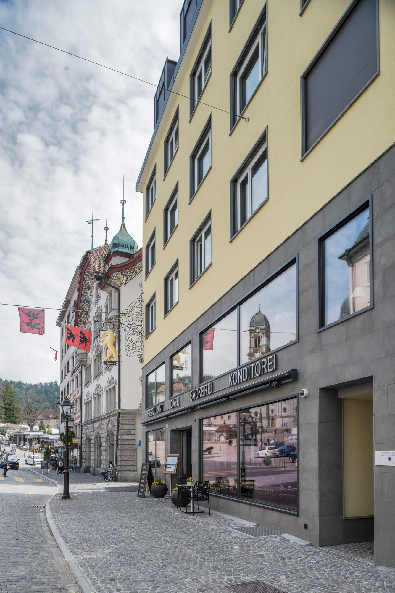 Das prägende Element der Parzelle ist die lange Grundrissfläche, die bis weit in den Hinterhof hineingreift. Die Ausrichtung eines Neubaus mit einern Restaurant und einer Konditorei sowie einer Zahnarztpraxis und Eigentumswohnungen, soll zum einen die repräsentative Aussicht zur Hauptstrasse und zum Kloster berücksichtigen, zum andern bietet die Südwestseite eine optimale Belichtung.