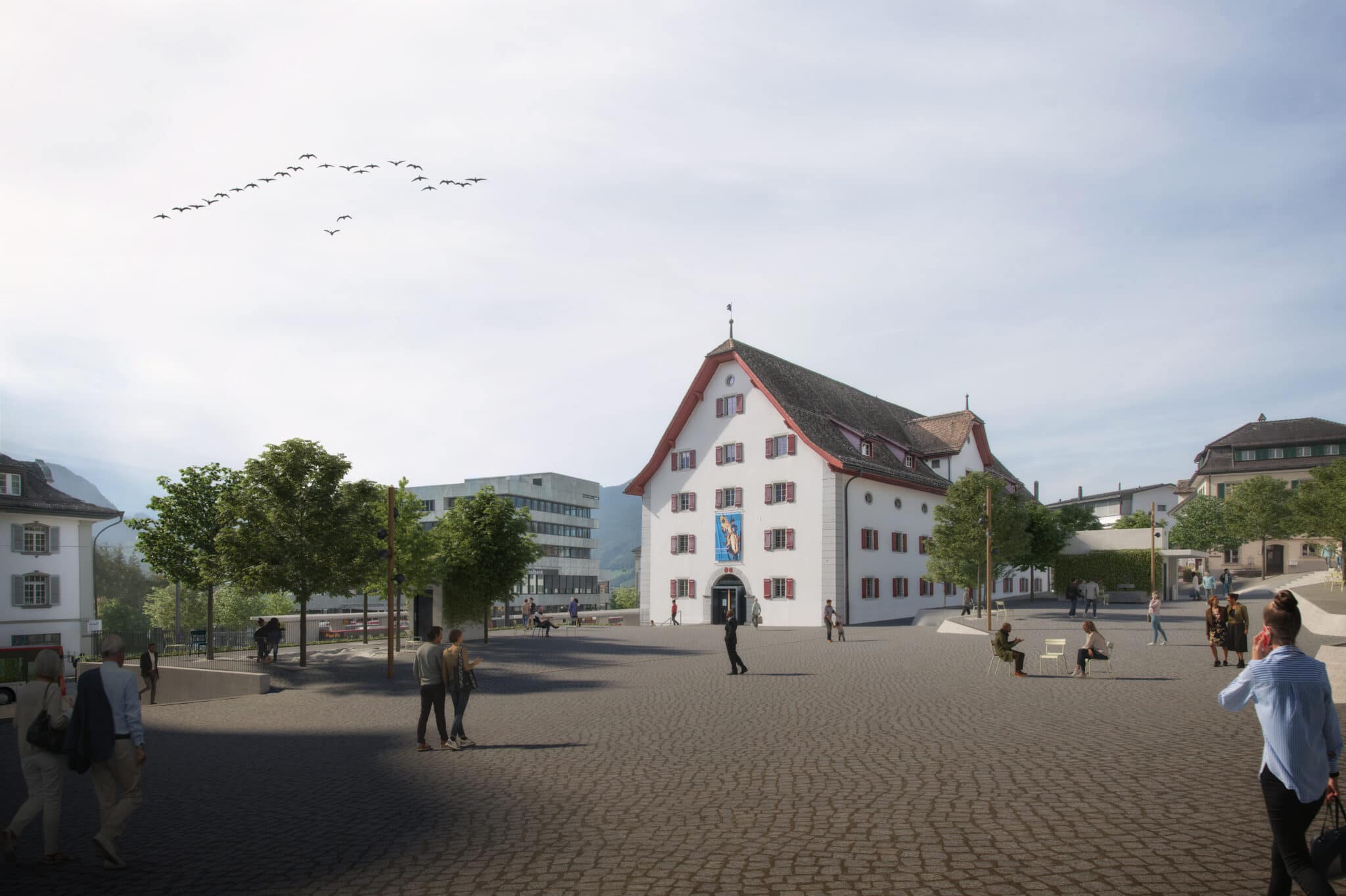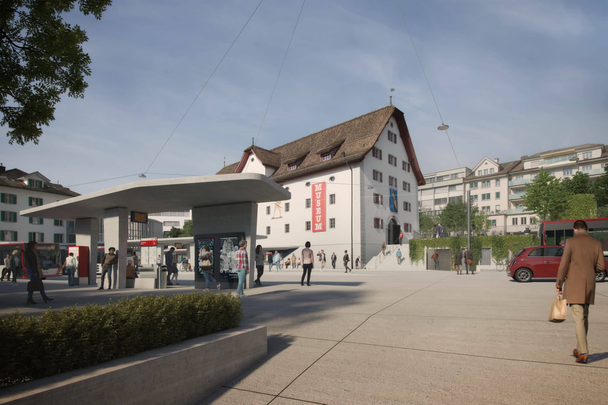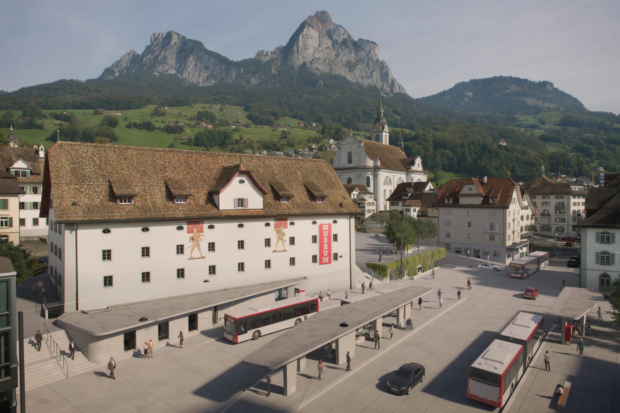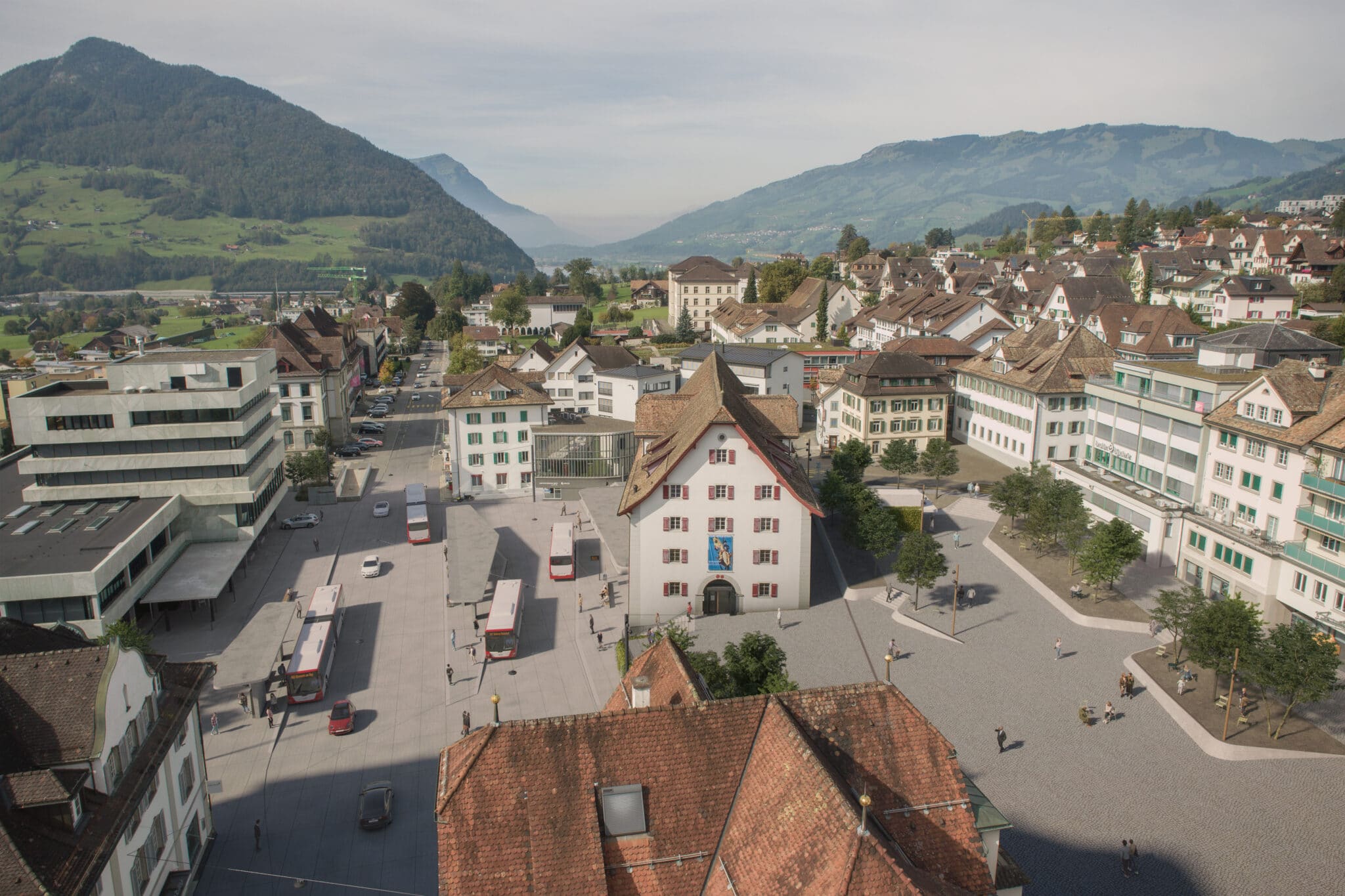 Der Bushof Schwyz, zentraler Platz mit repräsentativer Funktion, bildet mit dem Museum der Schweizer Geschichte neben dem Hauptplatz mit Kirche und Rathaus ein wesentlicher Bestandteil des Schwyzer Dorfbildes. Der Dorfkern mit seinen