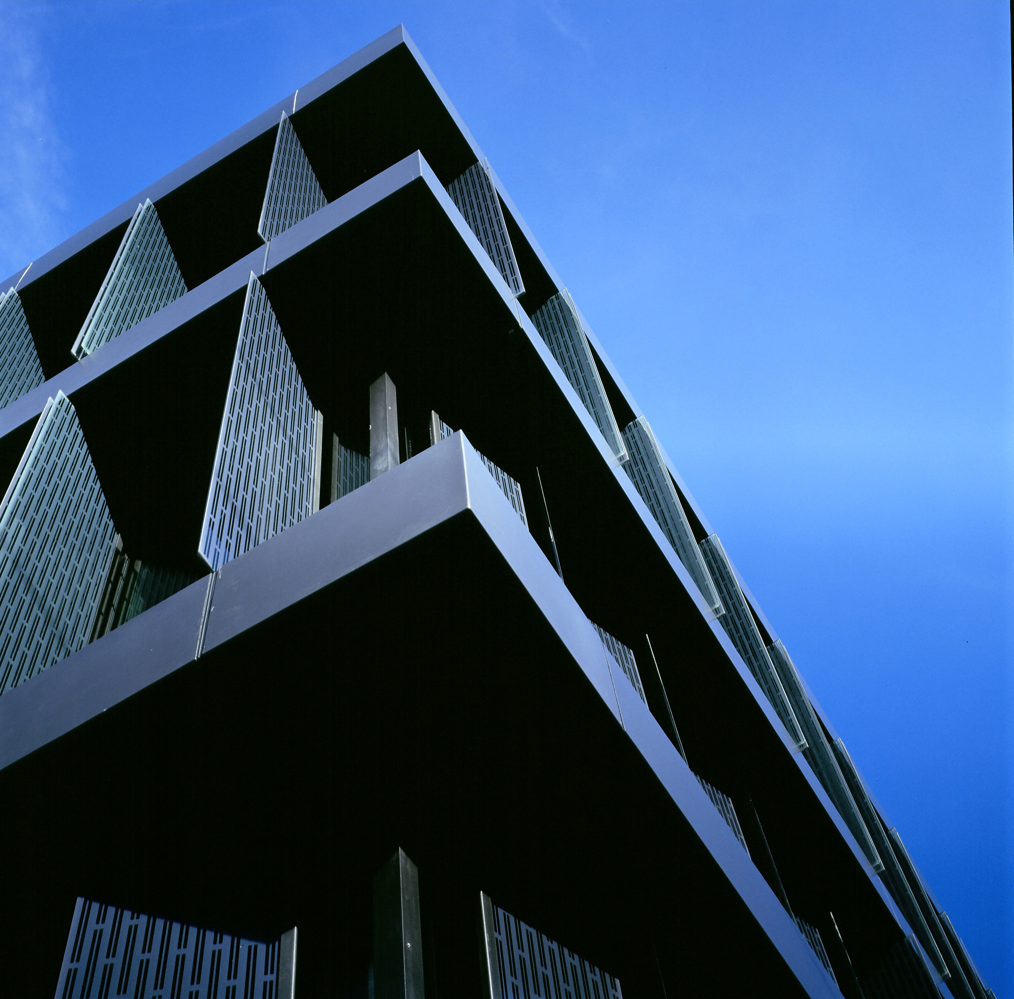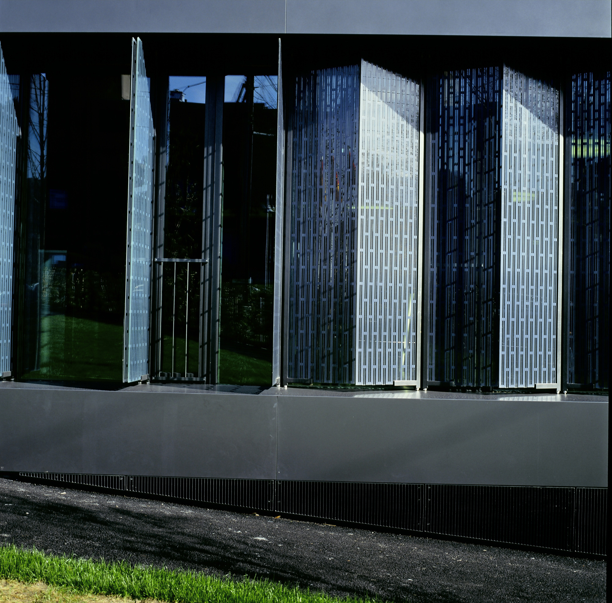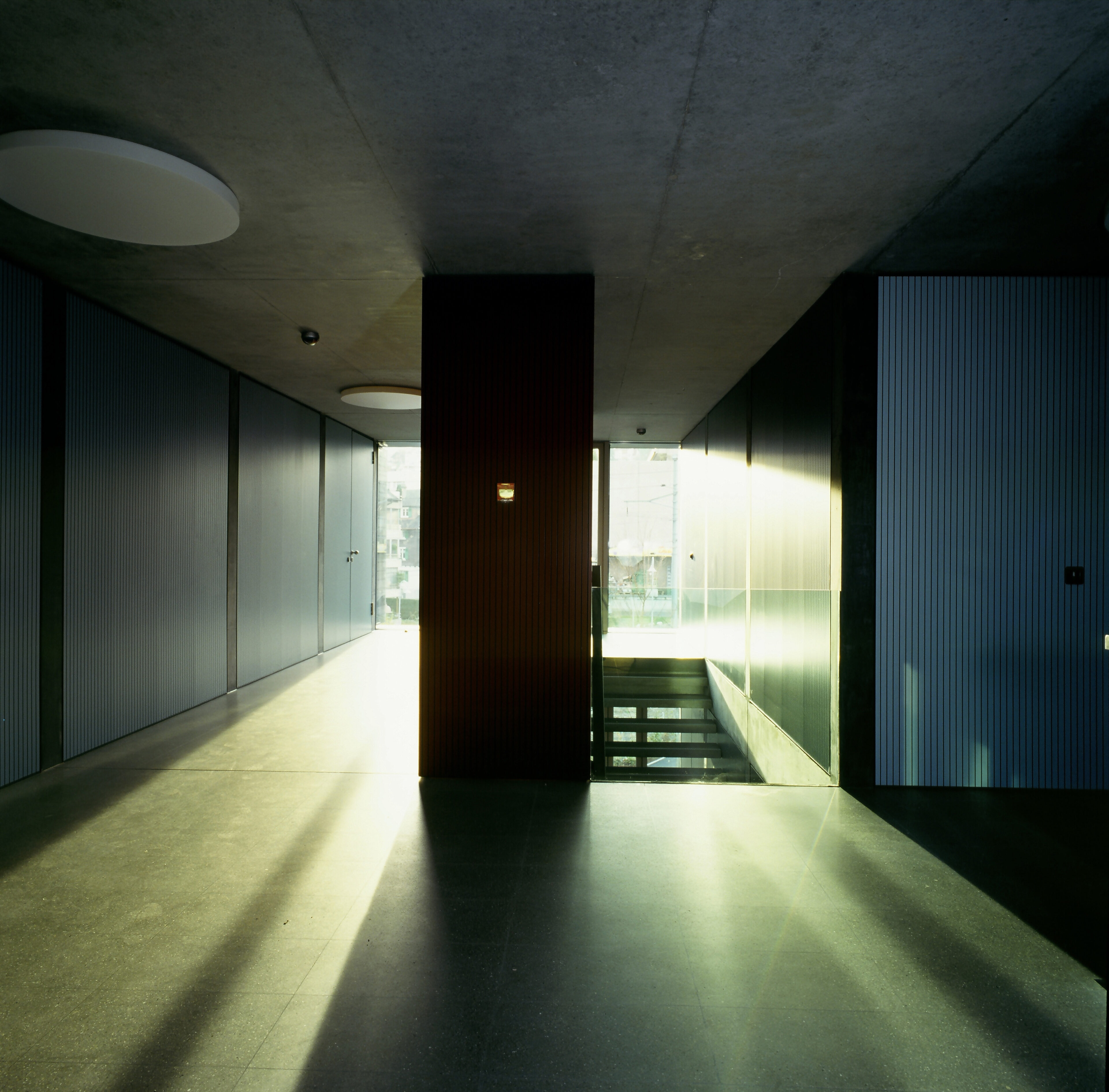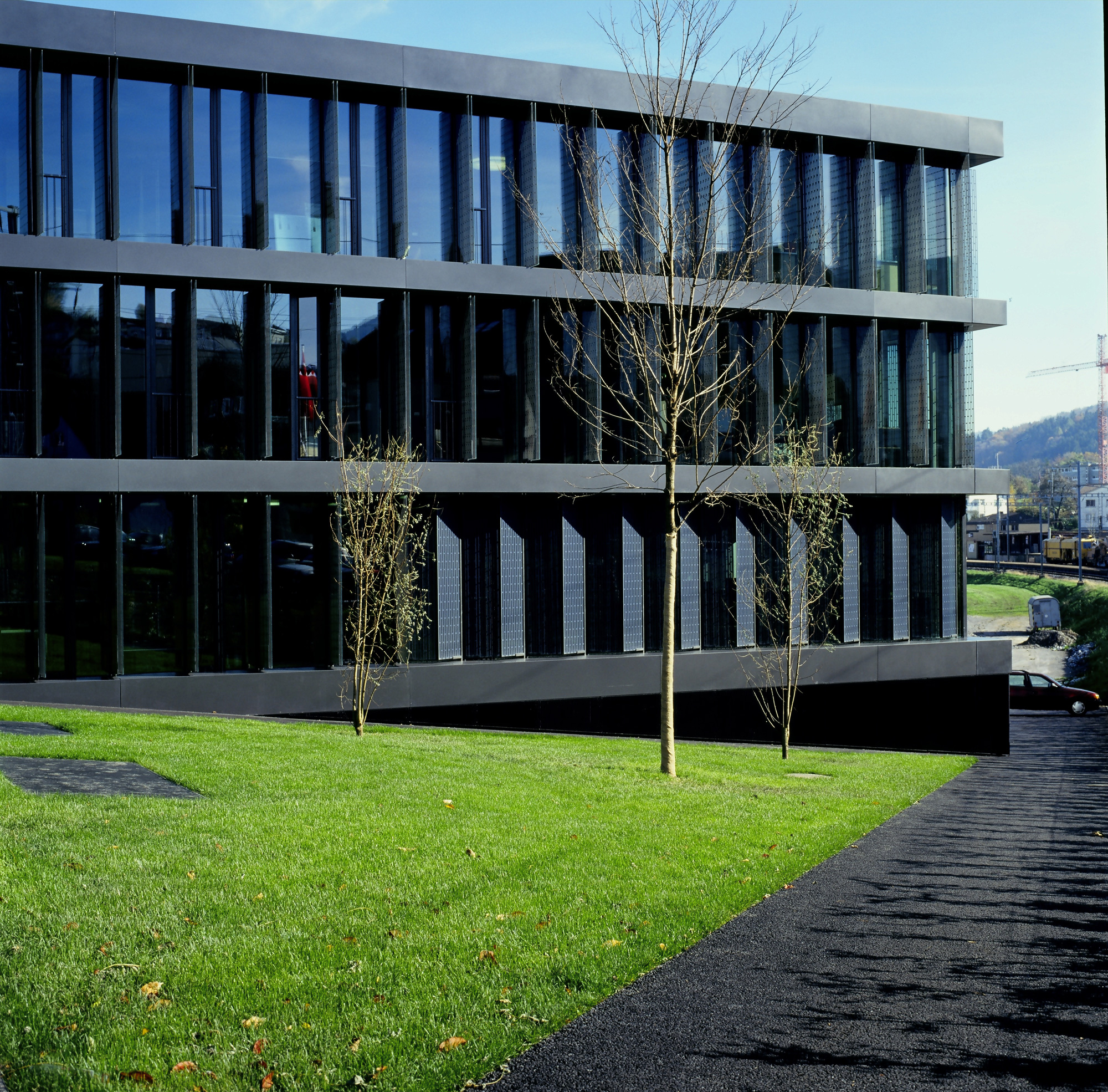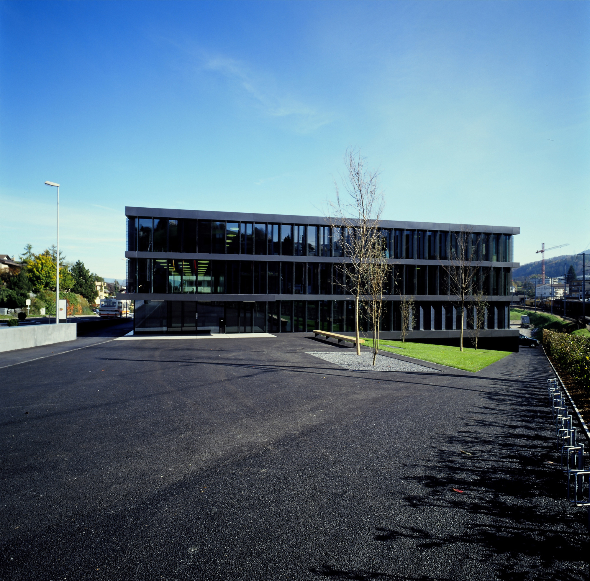 Ein einladendes Vordach führt den Besucher in das grosszügige zweigeschossige Foyer. Die Eingangshalle wendet sich zur Hauptstras-se hin und unterstreicht den öffentlichen Cha-rakter des Hauses. Seine innere Struktur findet der Bau in der konsequenten Umsetzung des Programms. Die Bedürfnisse eines flexiblen Büro- und Verwaltungsbaus spiegeln sich im modularen Aufbau des Gebäudes wieder und führen zu einer ihm eigenen atmosphärischen Dichte.