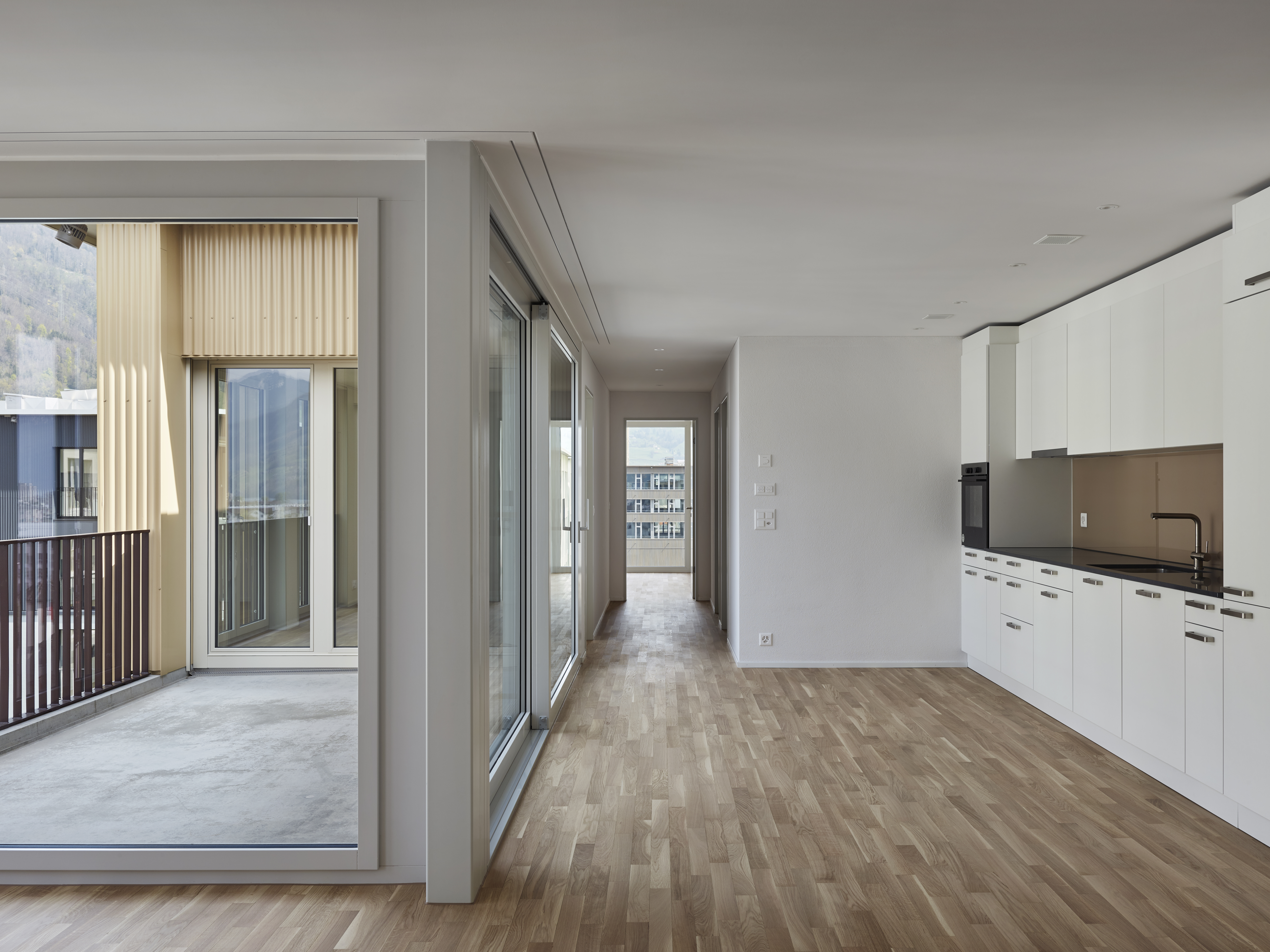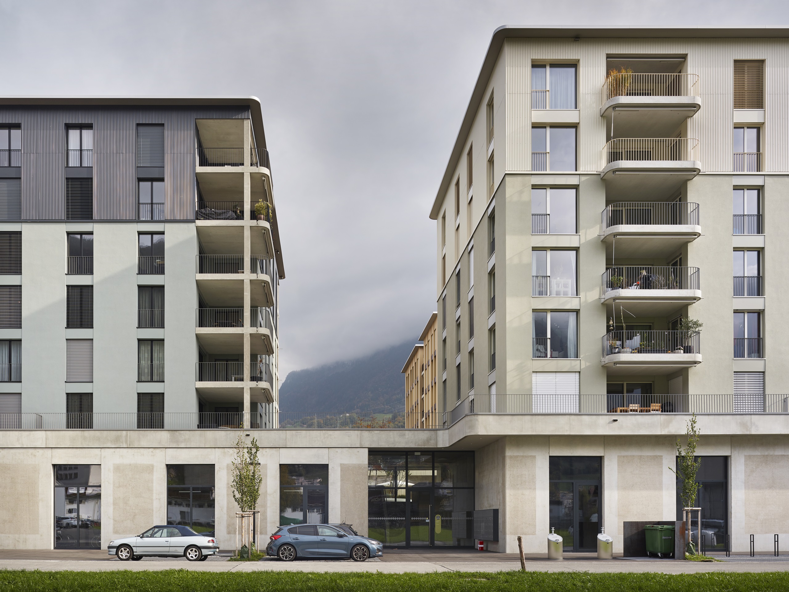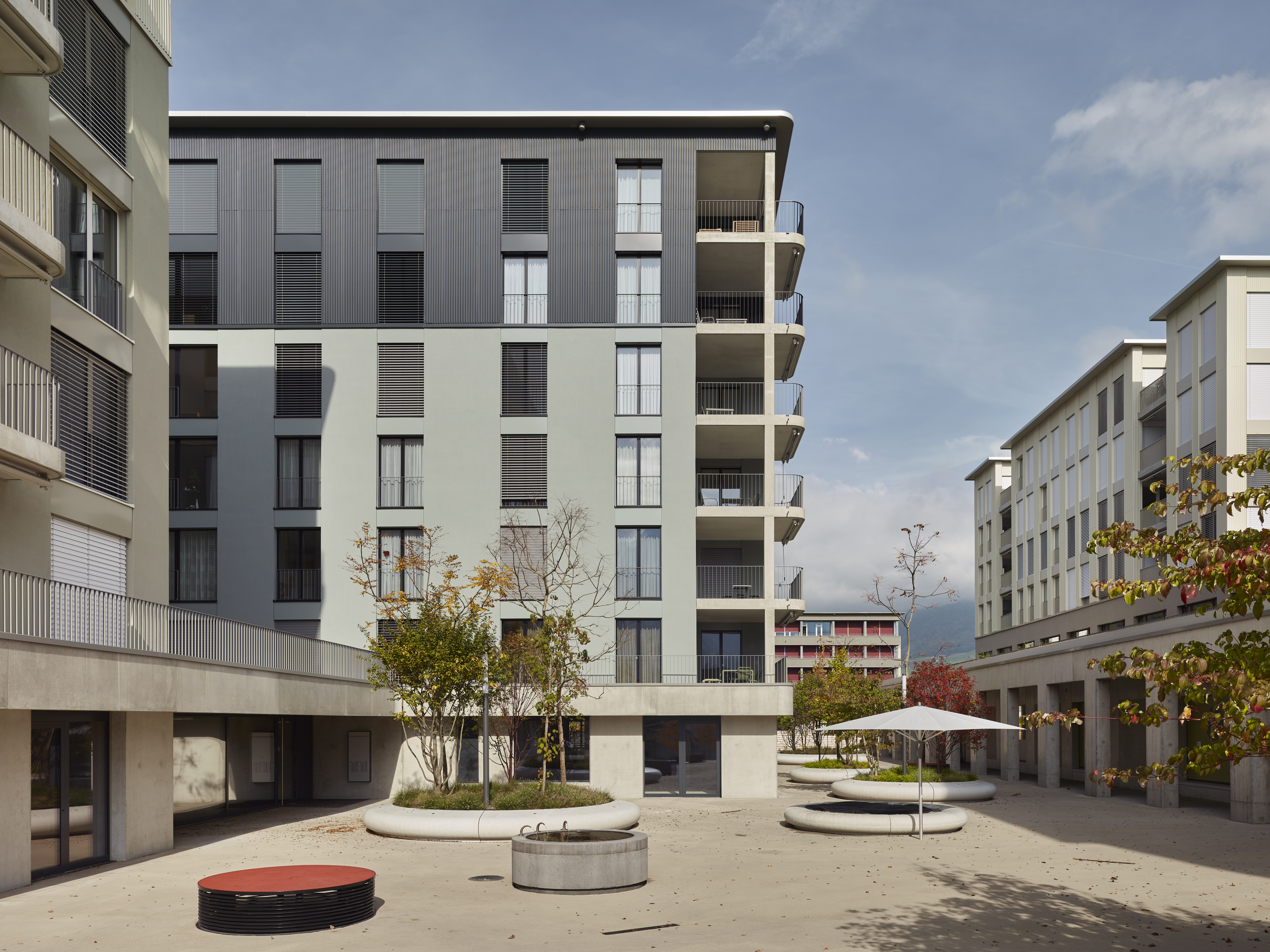 Über einen grosszügigen Platz werden die beiden fünfgeschossigen Bauzeilen erschlossen; entlang der Bahn ein hauptsächlich kommerziell genutzter Baukörper, entlang der Industriestrasse Einzelbauten, welche den boulevardartigen Strassenzug formen. Zwischen den Bauzeilen entsteht ein verkehrsfreier grüner Zwischenraum.