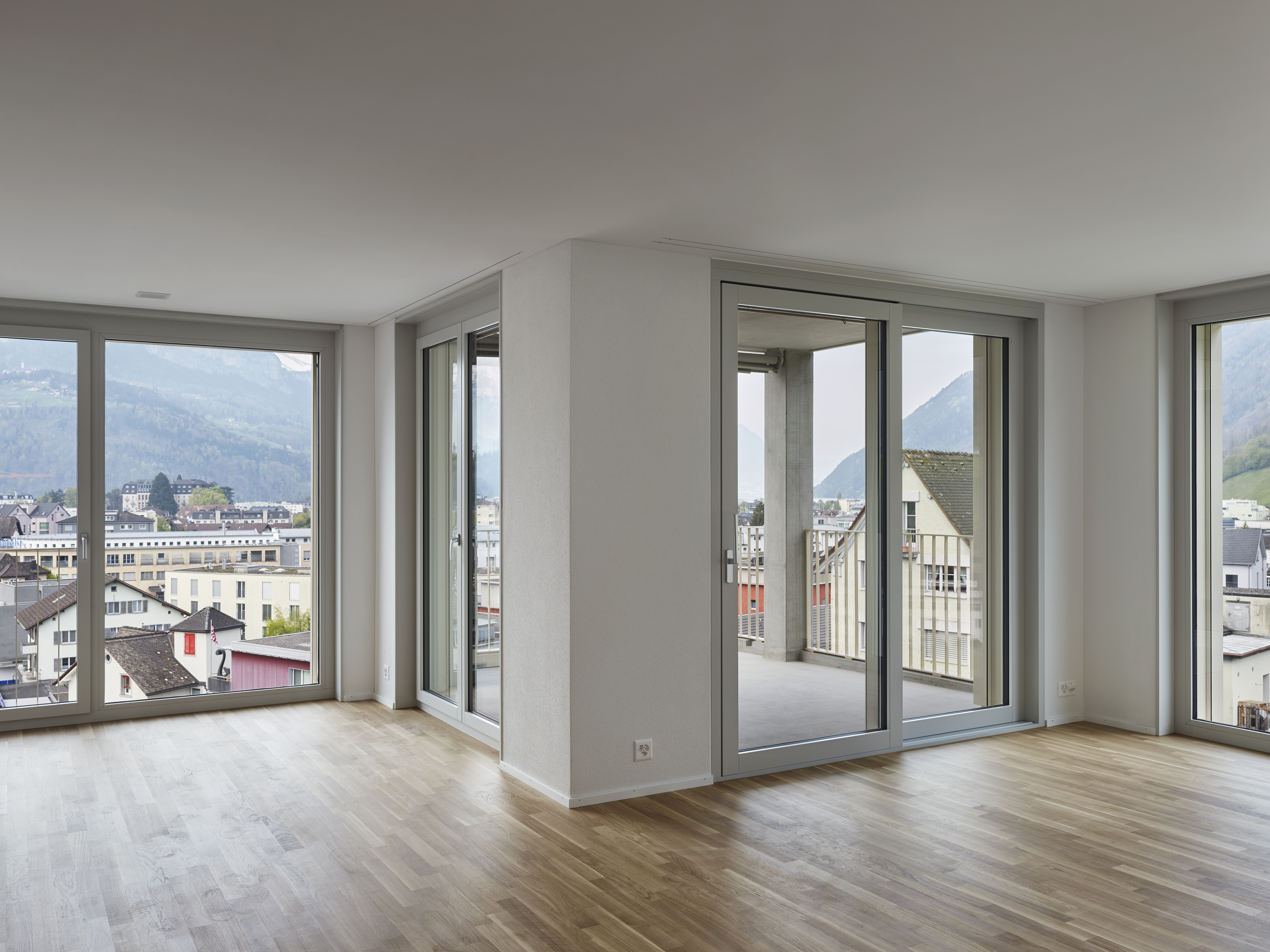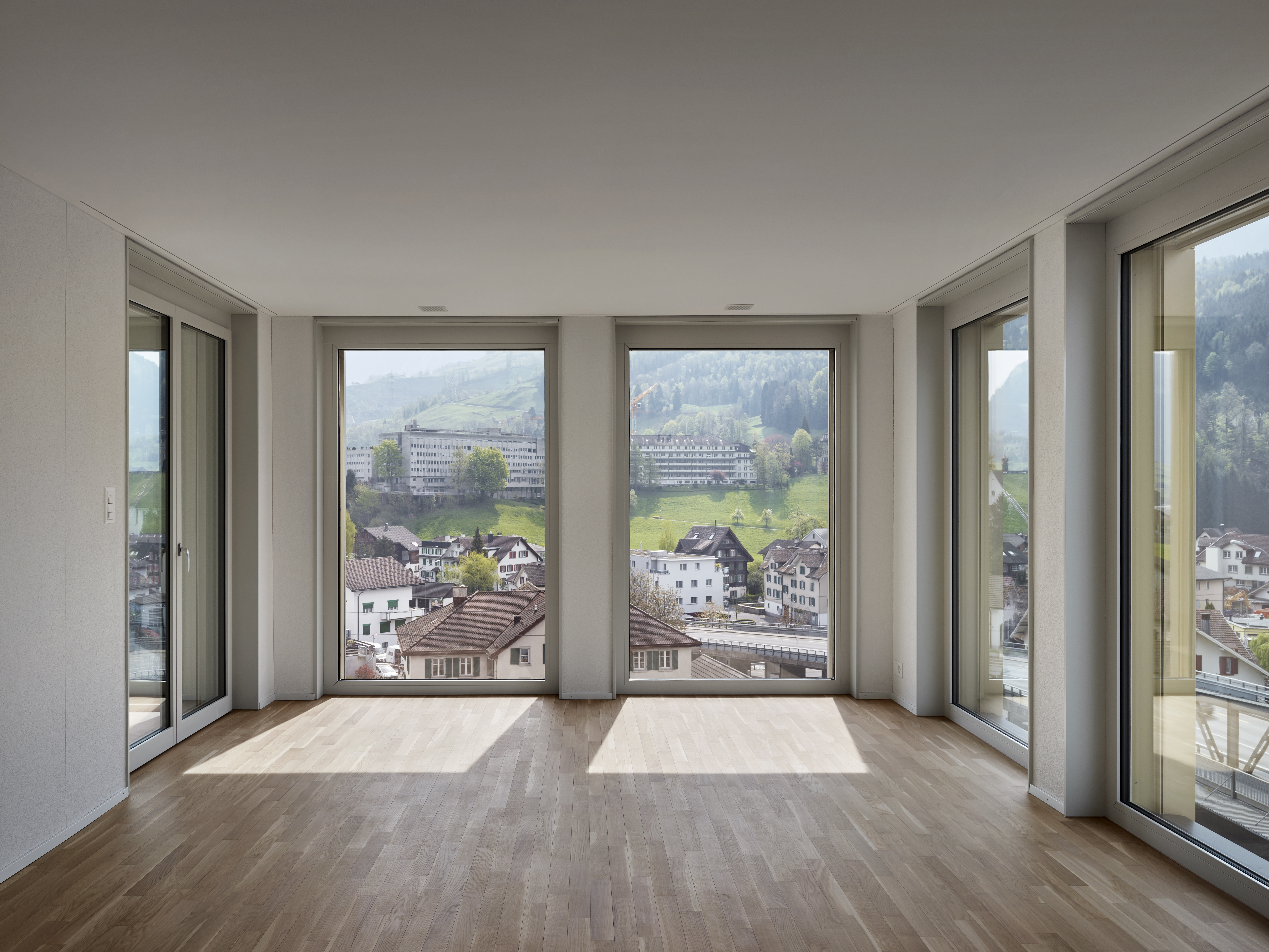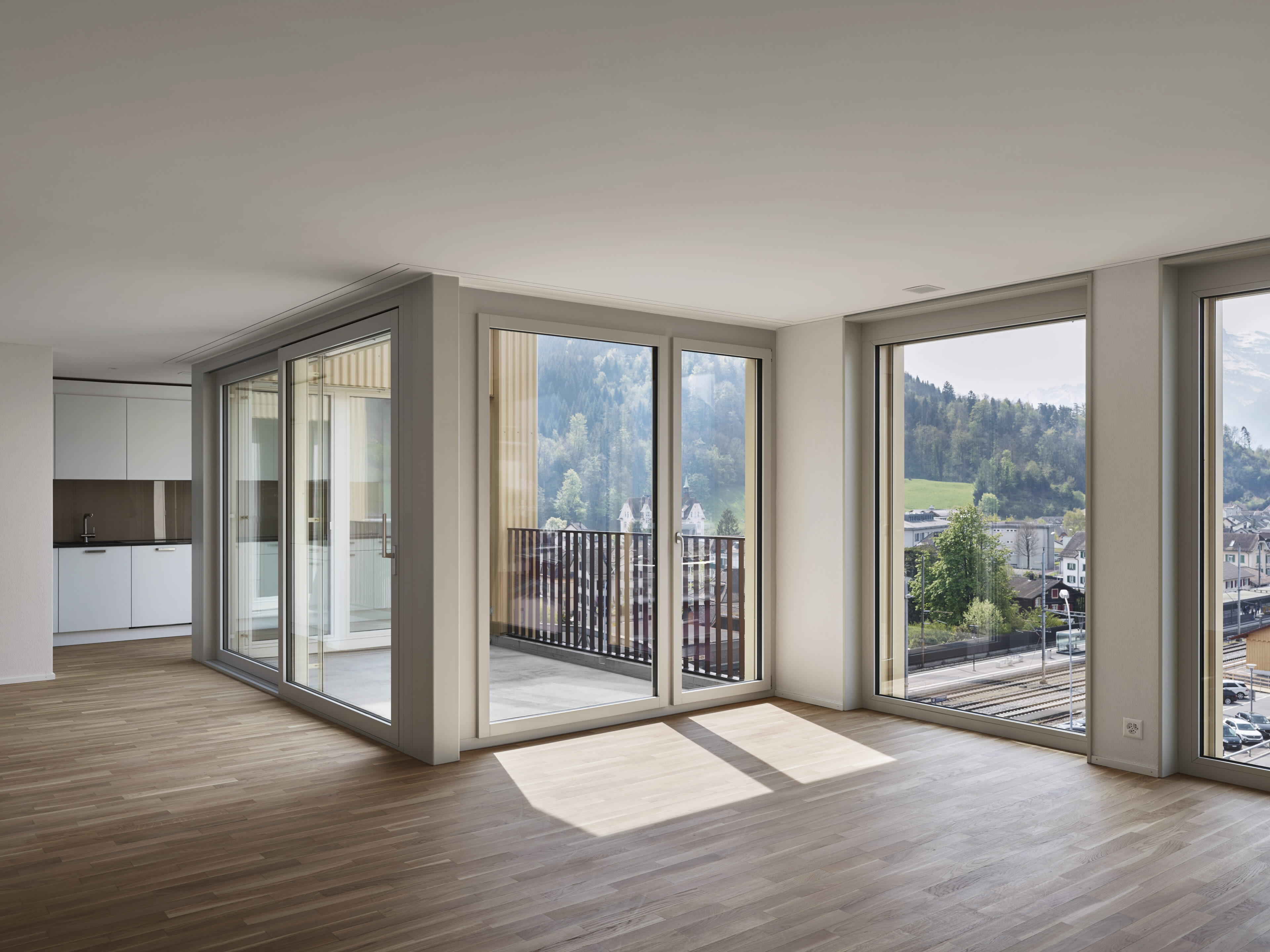 Über einen grosszügigen Platz werden die beiden fünfgeschossigen Bauzeilen erschlossen; entlang der Bahn ein hauptsächlich kommerziell genutzter Baukörper, entlang der Industriestrasse Einzelbauten, welche den boulevardartigen Strassenzug formen. Zwischen den Bauzeilen entsteht ein verkehrsfreier grüner Zwischenraum.