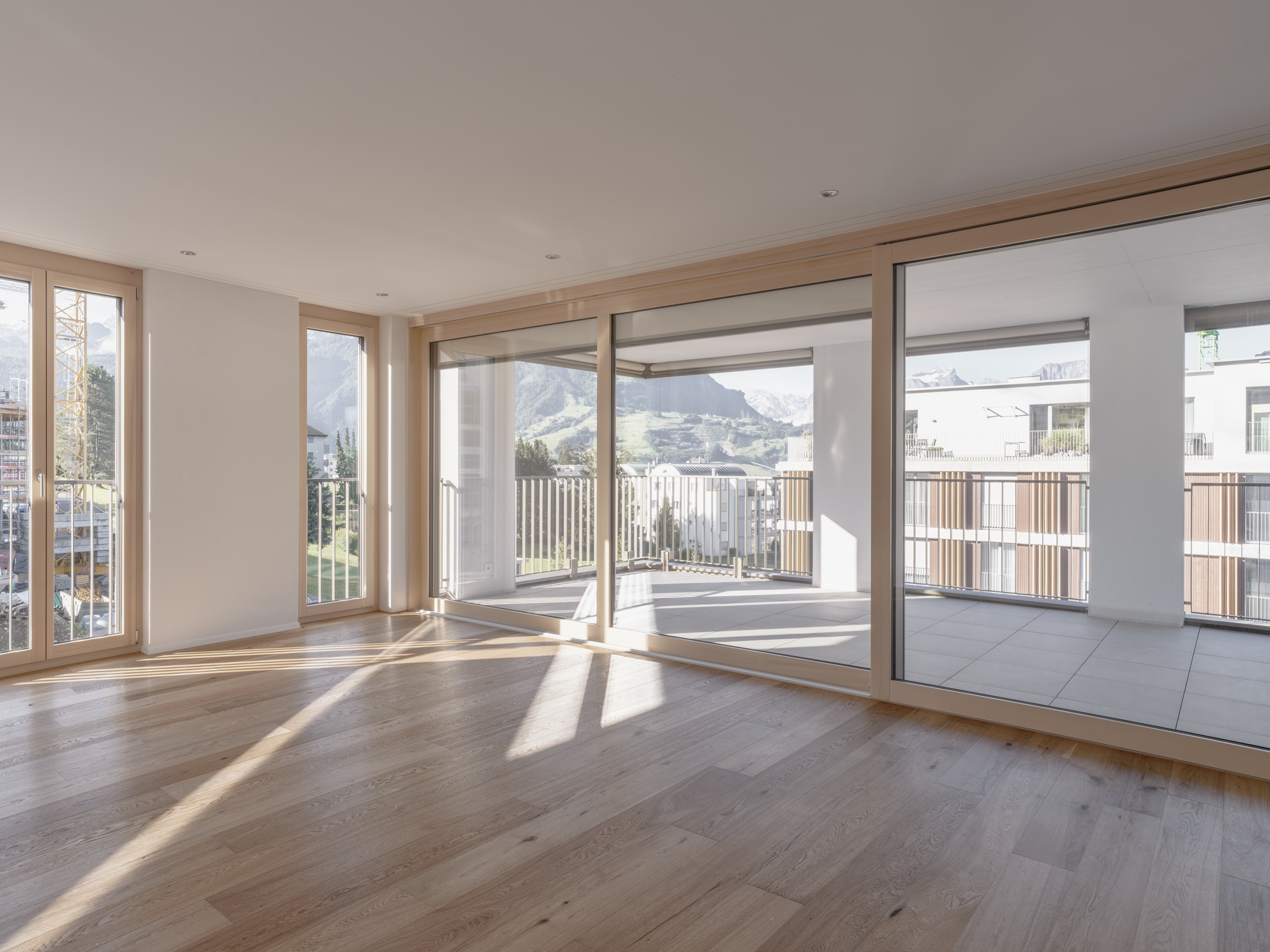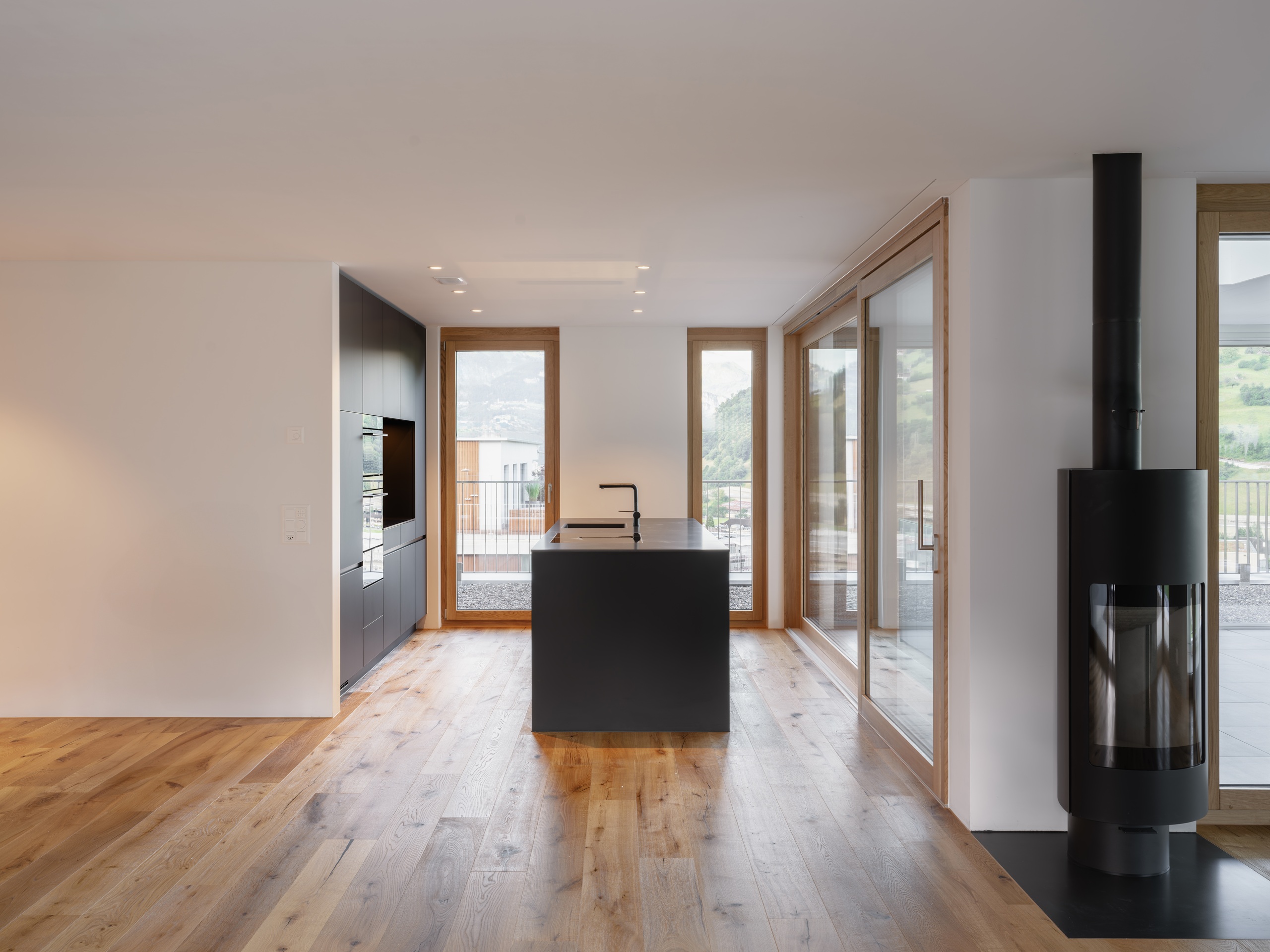 Sämtliche Wohnungen teilen sich die gleiche räumliche Idee – sie sind unterteilt in einen Nacht- und Tagbereich. Im zurückgezogenen Nachtbereich befinden sich die Zimmer und Nasszellen. Im Tagbereich befinden sich die Ess-, Koch- und Wohnzone sowie eine Loggia. Getrennt werden diese Innenräume und die Loggia lediglich durch eine Fensterfront. Dadurch nimmt man den gesamten Tagbereich als einen grossen Raum wahr.
