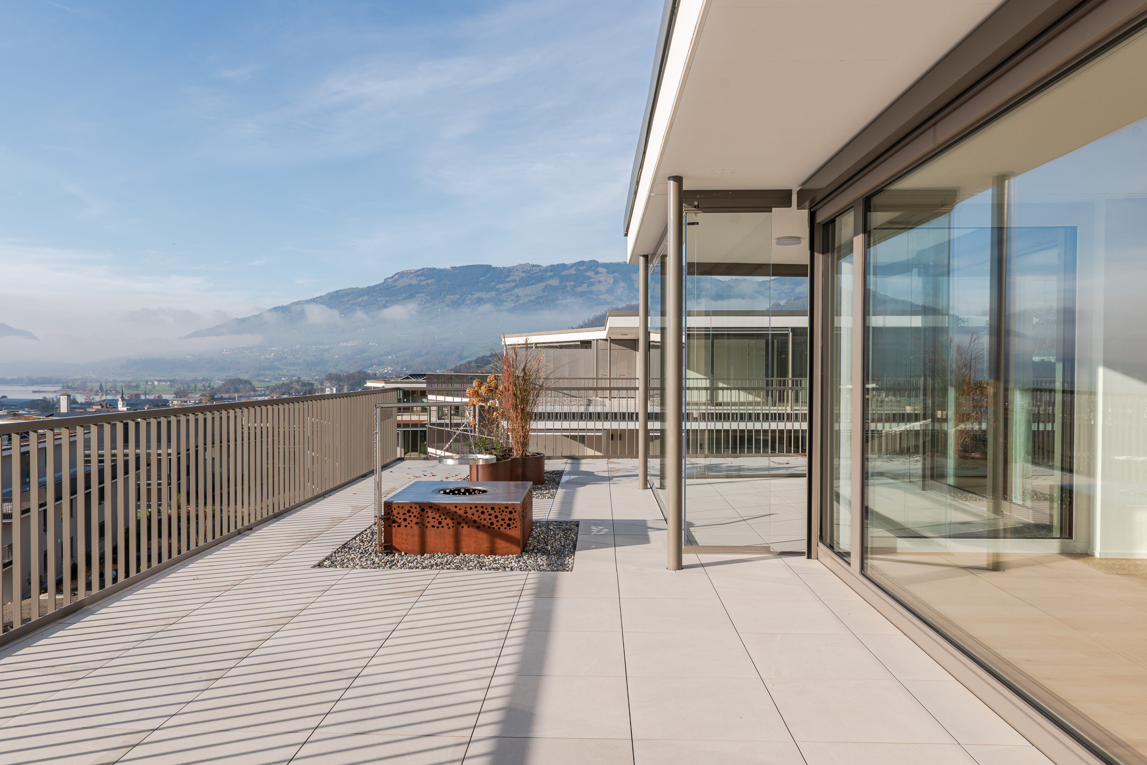 Grosszügige, in der Tiefe differenzierte Balkon- und Loggiabereiche ermöglichen allen Wohneinheiten eine mehrseitige Ausrichtung auf das Panorama des Talkessels. Trotz vorgängiger Bebauung wurde so ein Optimum an freier Sicht auf Berge, Seen, Wälder und Fluren erreicht. Die vielseitig nutzbaren Aussenflächen sind in schmalere und ausgeweitete Zonen gegliedert und schaffen kontextuelle Bezüge zum Aussenraum. Die ins gestaltete Terrain integrierten Tiefgaragen halten die Beanspruchung des wertvollen Aussenraumes auf ein Minimum.