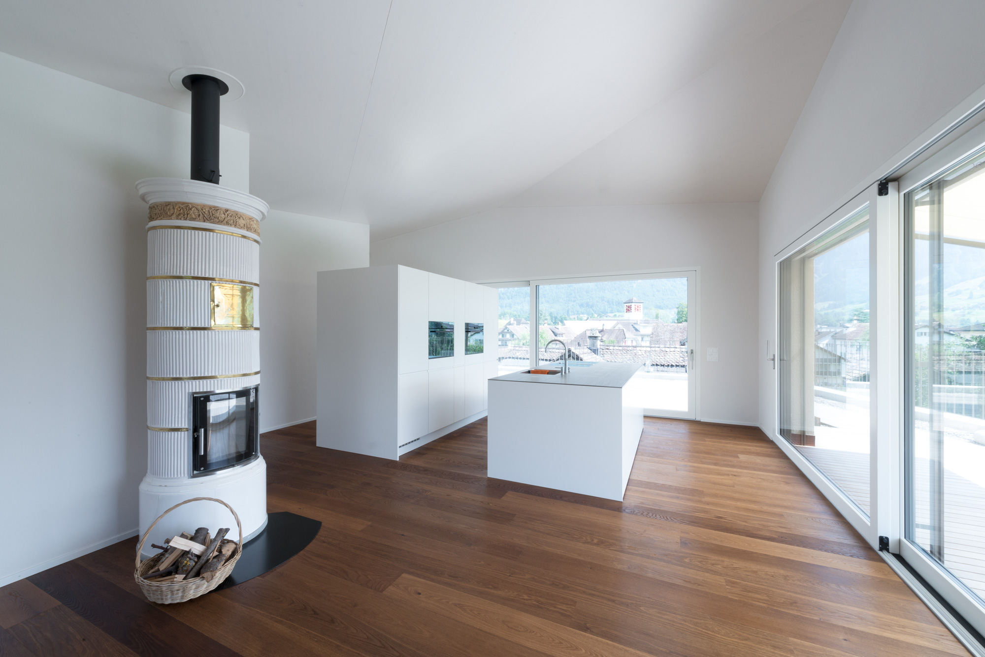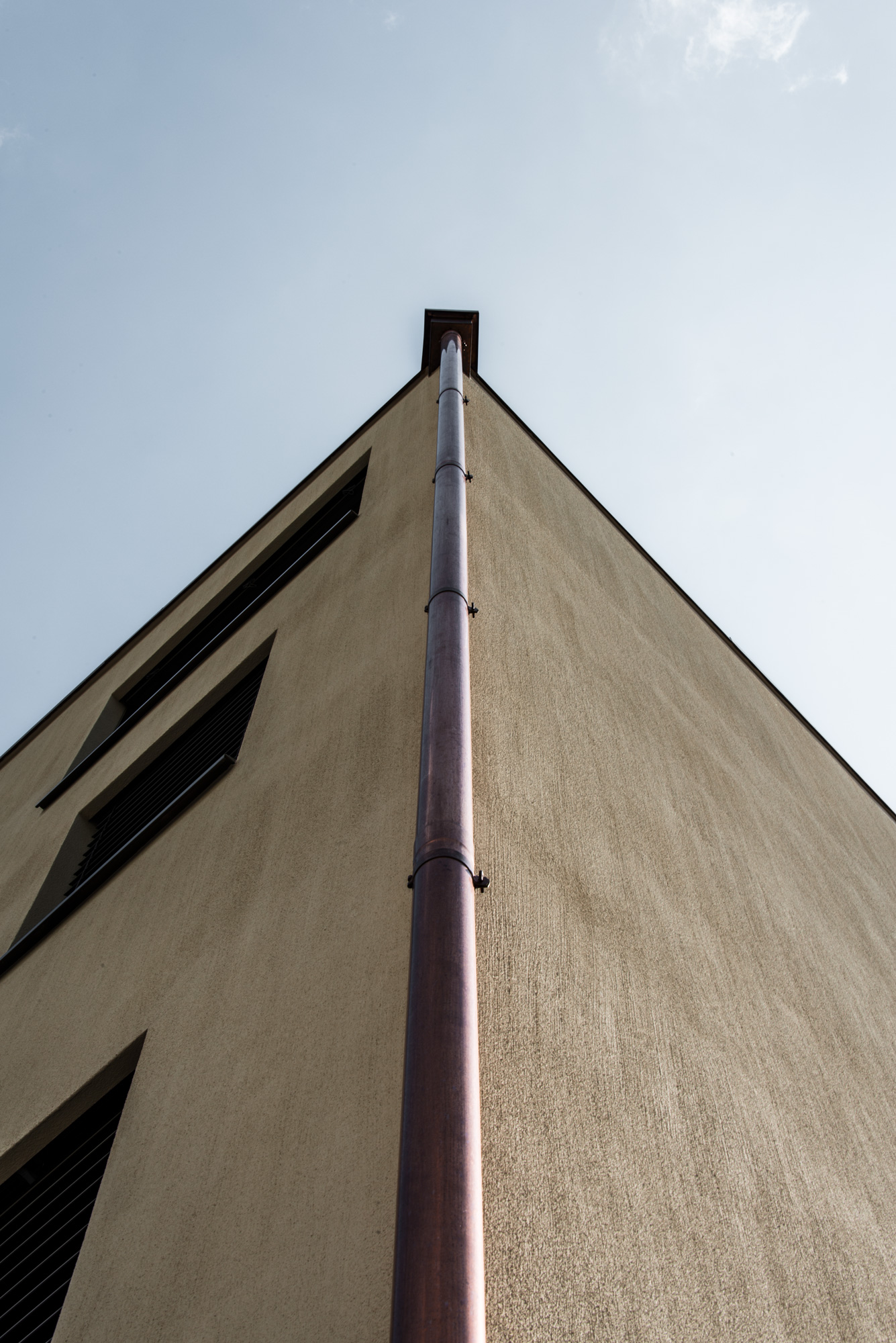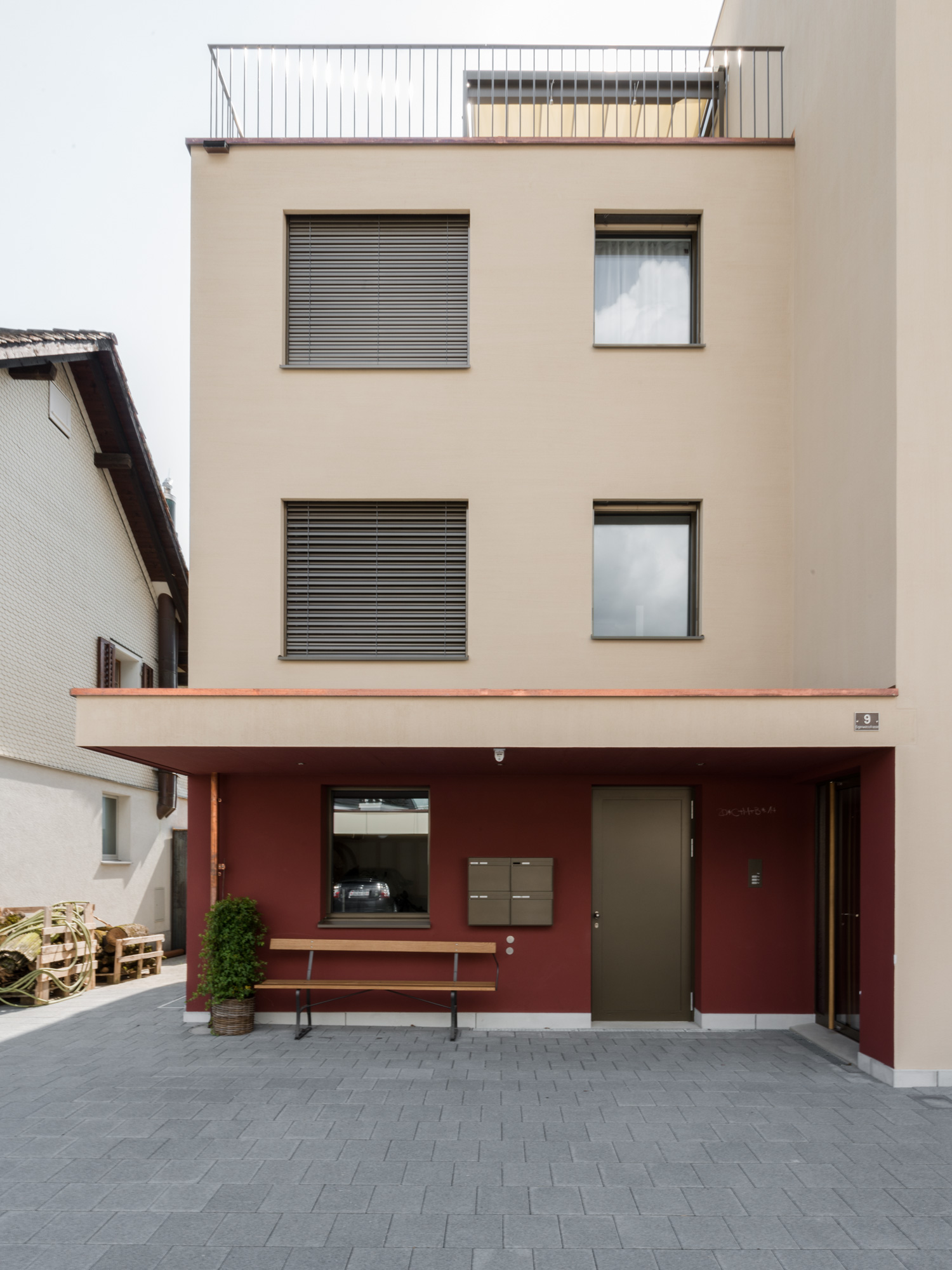 Die Volumetrie des Haupthauses fügt sich dank des gestaffelten Volumens in die bestehende Struktur des Quartiers ein. Traditionelle Formen und Bauteile werden in einer neuen Art wieder angewendet. Das Mehrfamilienhaus wurde 3-seitig als Lochfassade geplant. Gegen Südwesten ermöglicht eine zeitgemässe, offene, raumhoch verglaste Fassadengestaltung mit davorliegendem Balkon einen wunderbaren Blick in die unbebaute Landschaft. Das Dach ist ein aus Holz konstruiertes Satteldach mit diagonal zum Gebäude verlaufendem First. Die Materialisierung des Gebäudes ist nach ökologischen Gesichtspunkten ausgewählt. Die Fassade ist vollständig mineralisch und atmungsaktiv aufgebaut. Auf eine kontrollierte Wohnraumlüftung wurde somit verzichtet. Die Wärmeerzeugung wird durch den Anschluss an das örtliche Fernwärmenetz sichergestellt. Zusätzlich besteht die Warmwasseraufbereitung durch Vakuumkollektoren.