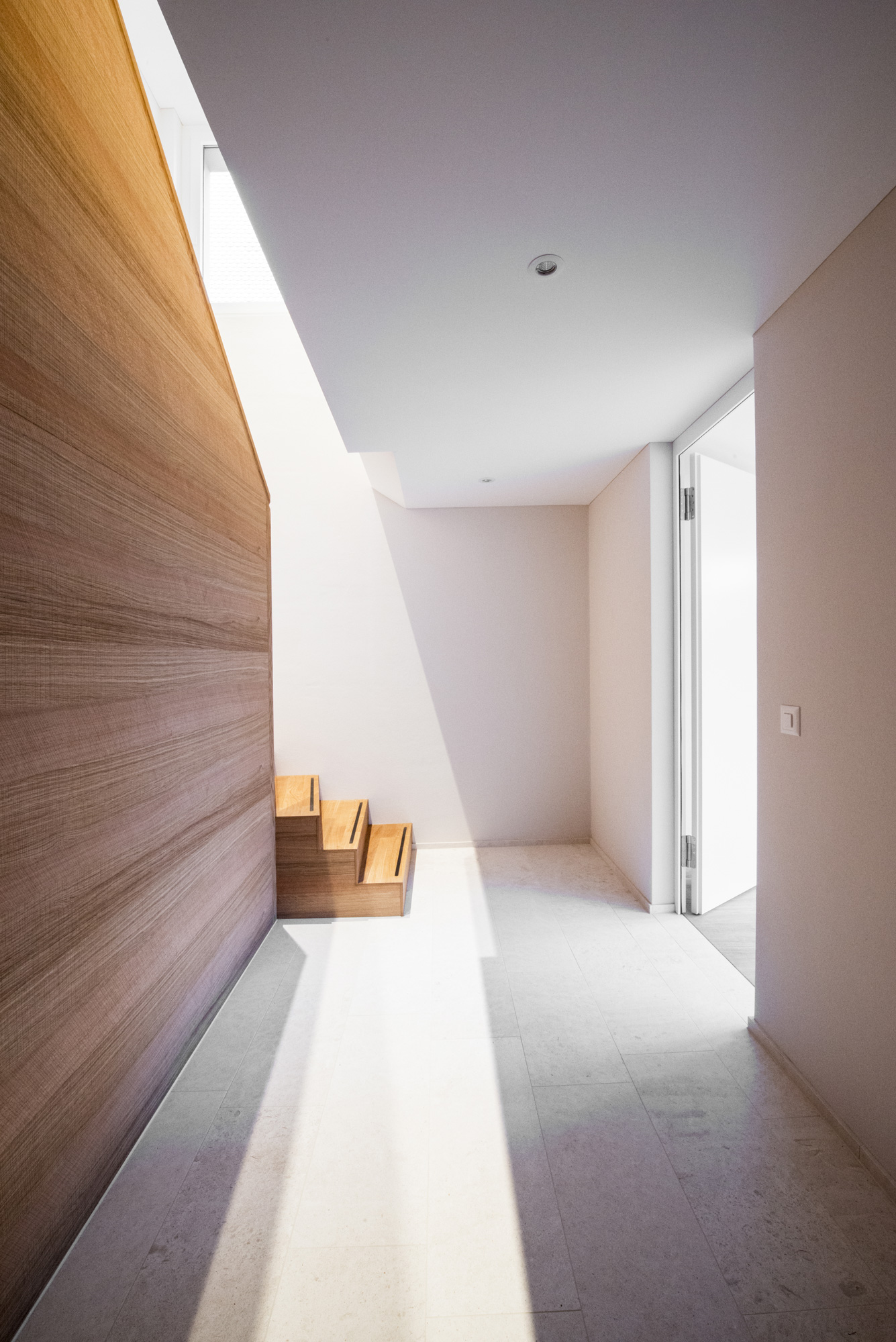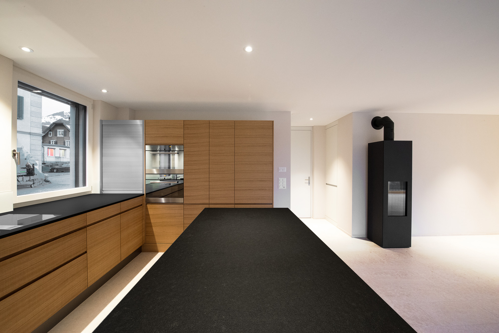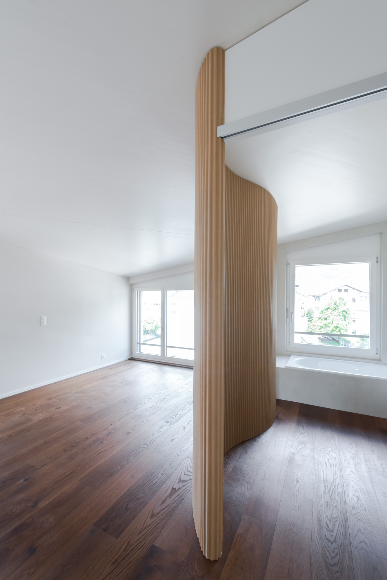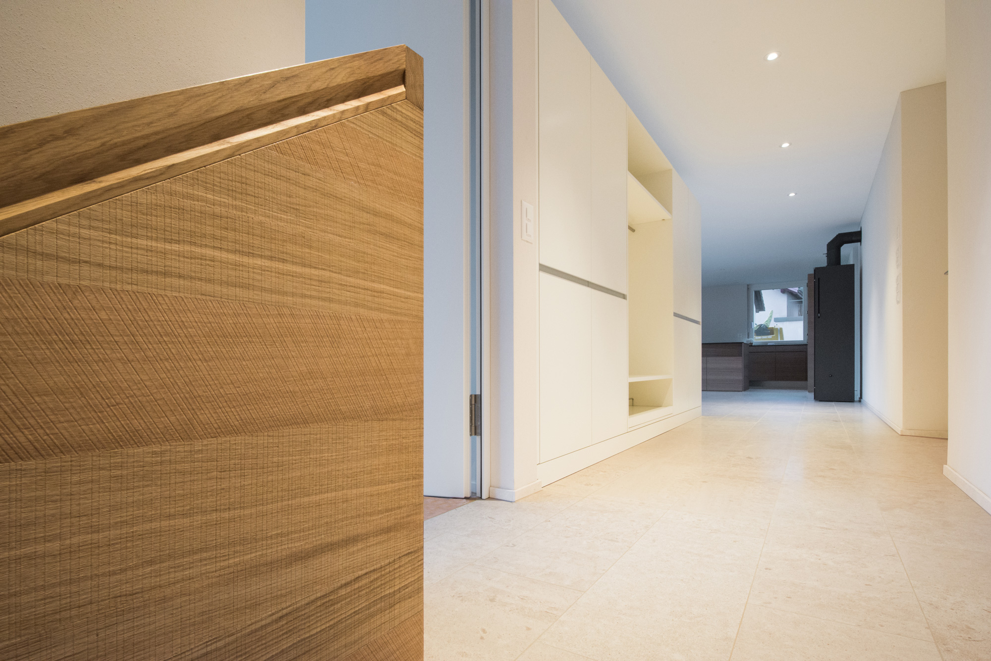 Die Volumetrie des Haupthauses fügt sich dank des gestaffelten Volumens in die bestehende Struktur des Quartiers ein. Traditionelle Formen und Bauteile werden in einer neuen Art wieder angewendet. Das Mehrfamilienhaus wurde 3-seitig als Lochfassade geplant. Gegen Südwesten ermöglicht eine zeitgemässe, offene, raumhoch verglaste Fassadengestaltung mit davorliegendem Balkon einen wunderbaren Blick in die unbebaute Landschaft. Das Dach ist ein aus Holz konstruiertes Satteldach mit diagonal zum Gebäude verlaufendem First. Die Materialisierung des Gebäudes ist nach ökologischen Gesichtspunkten ausgewählt. Die Fassade ist vollständig mineralisch und atmungsaktiv aufgebaut. Auf eine kontrollierte Wohnraumlüftung wurde somit verzichtet. Die Wärmeerzeugung wird durch den Anschluss an das örtliche Fernwärmenetz sichergestellt. Zusätzlich besteht die Warmwasseraufbereitung durch Vakuumkollektoren.