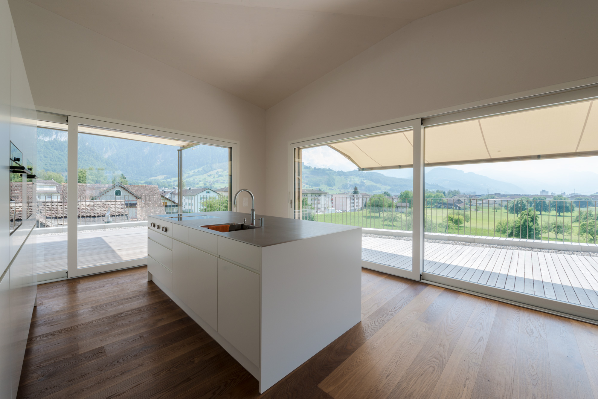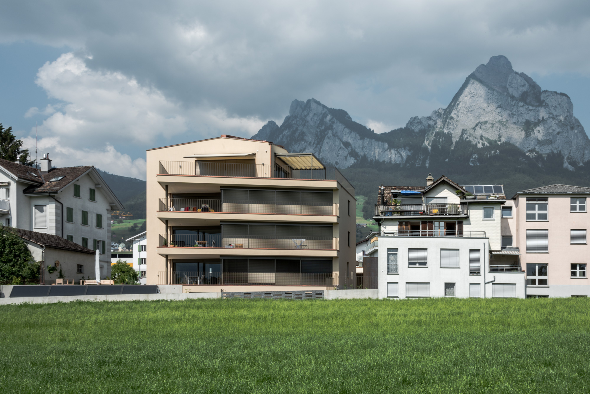 Das neue Mehrfamilienhaus, das am Rande der Kernzone A in Ibach steht, ersetzt ein um 1886 erbautes Gebäude. Richtung Nordwesten öffnet sich ein wunderbarer Blick auf die Rigi und die Landschaft bis nach Brunnen, nach Nordosten Richtung Schwyz und die Mythen.
