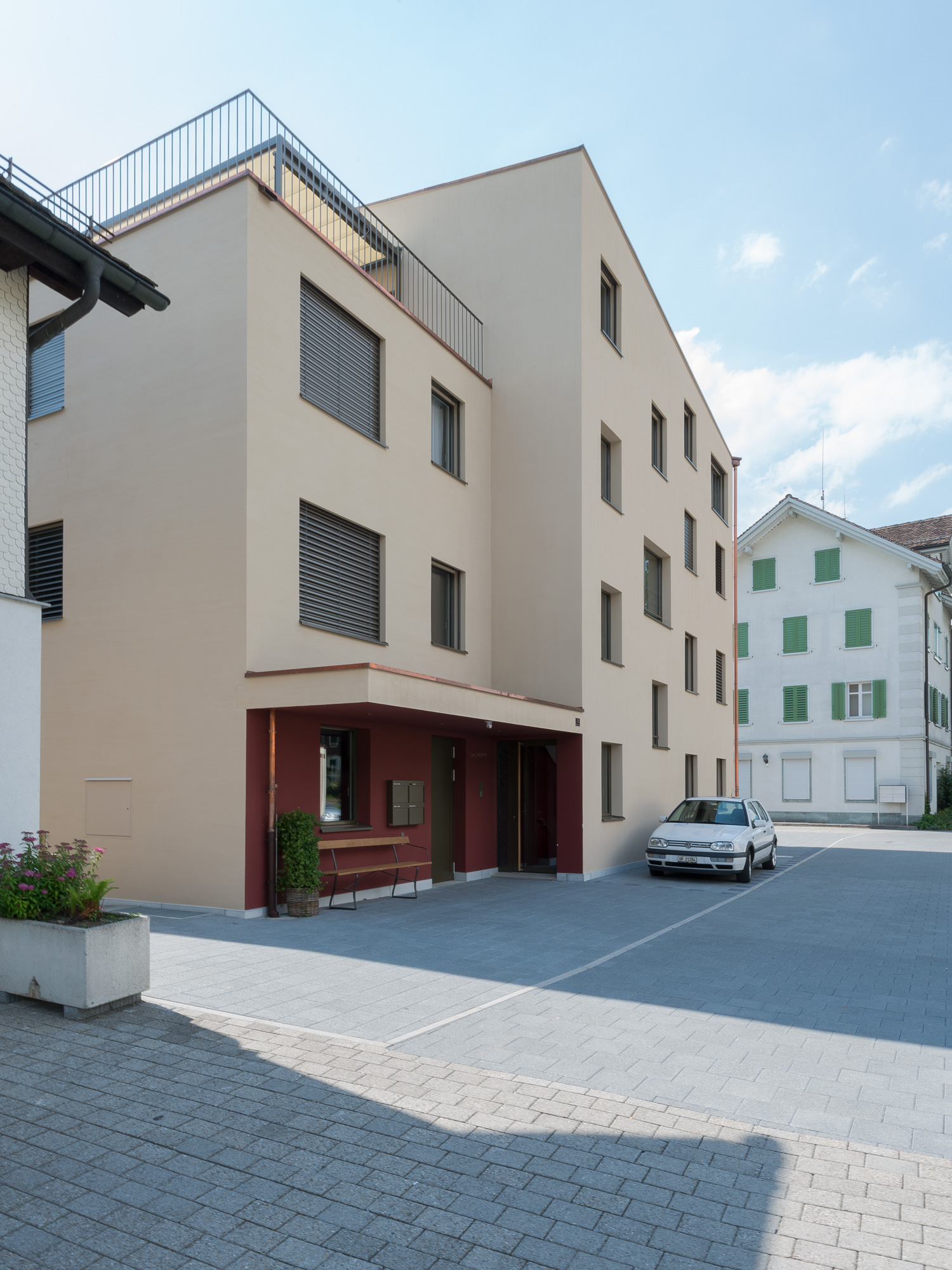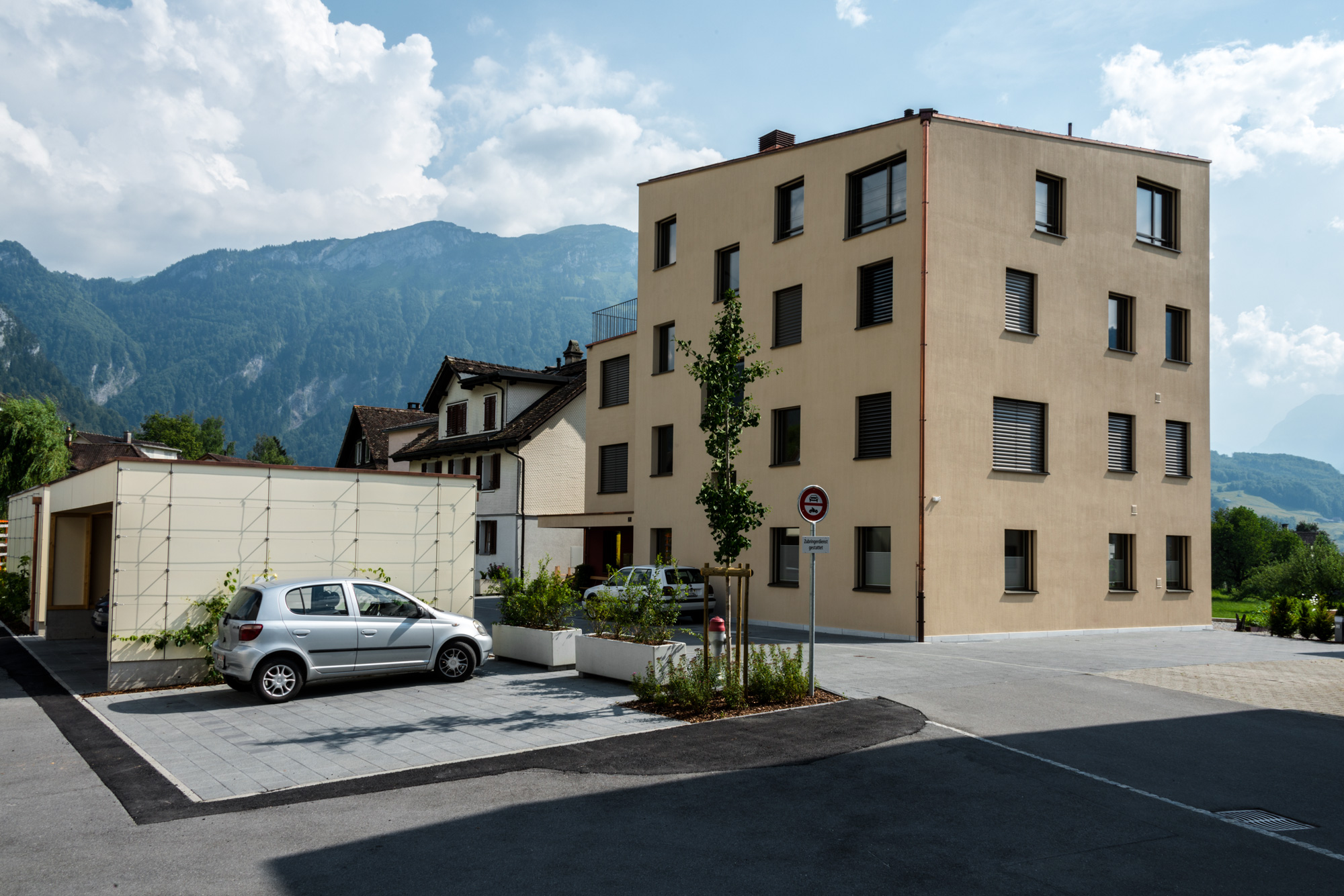 Mit dem neu überdeckten Parkgebäude wird der Zwischenraum des Wohnquartiers klar definiert. Durch die bepflanzte Fassade entsteht ein Grünkörper, der den harten Aussenraum auflockert. Durch die neue Platzgestaltung wurde die Durchfahrtsstrasse zu einer Spielstrasse. Dieses Projekt zeigt das Verdichten und Gestalten bestehender Dorfbilder.