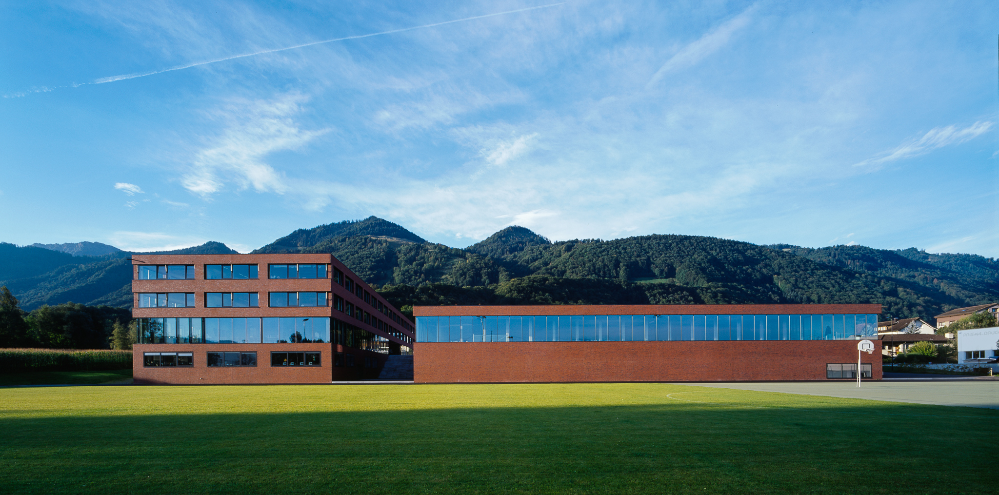 Die aufgrund ihrer Nutzung unterschiedlich proportionierten Baukörper erhalten durch das auskragende Turnhallendach eine elegante Verbindung, welche es erst ermöglicht, die unterschiedlichen Volumen auch als Grossform zu verstehen.