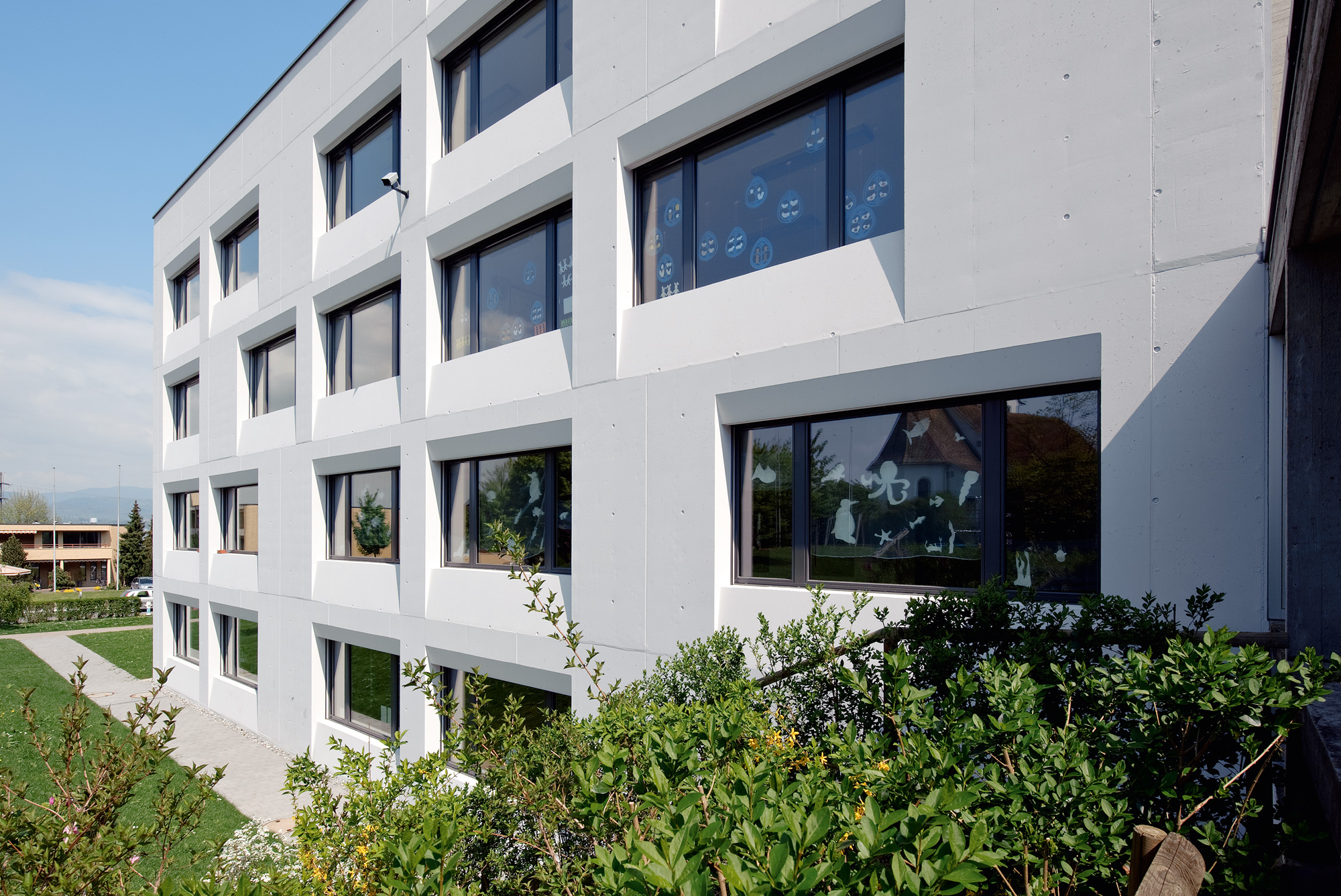 Die Fassade besteht neben den Fensterflächen aus massiven und verglasten (z.T. PV) Brüstungsbändern.