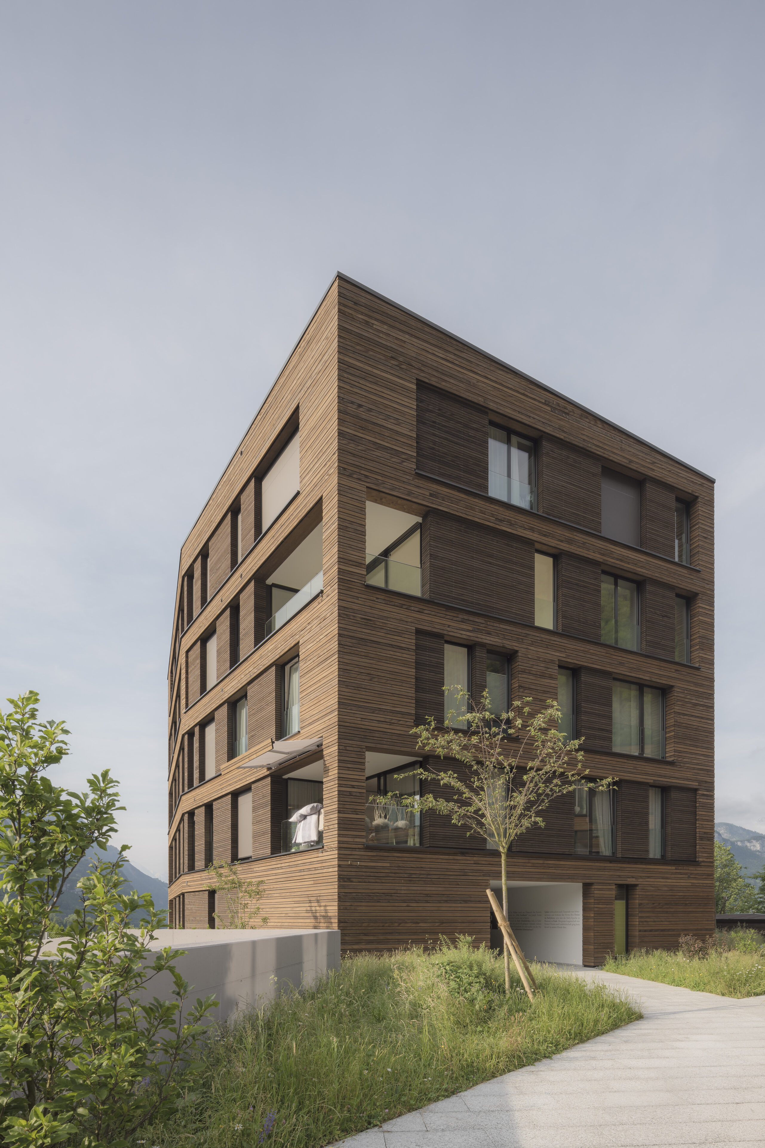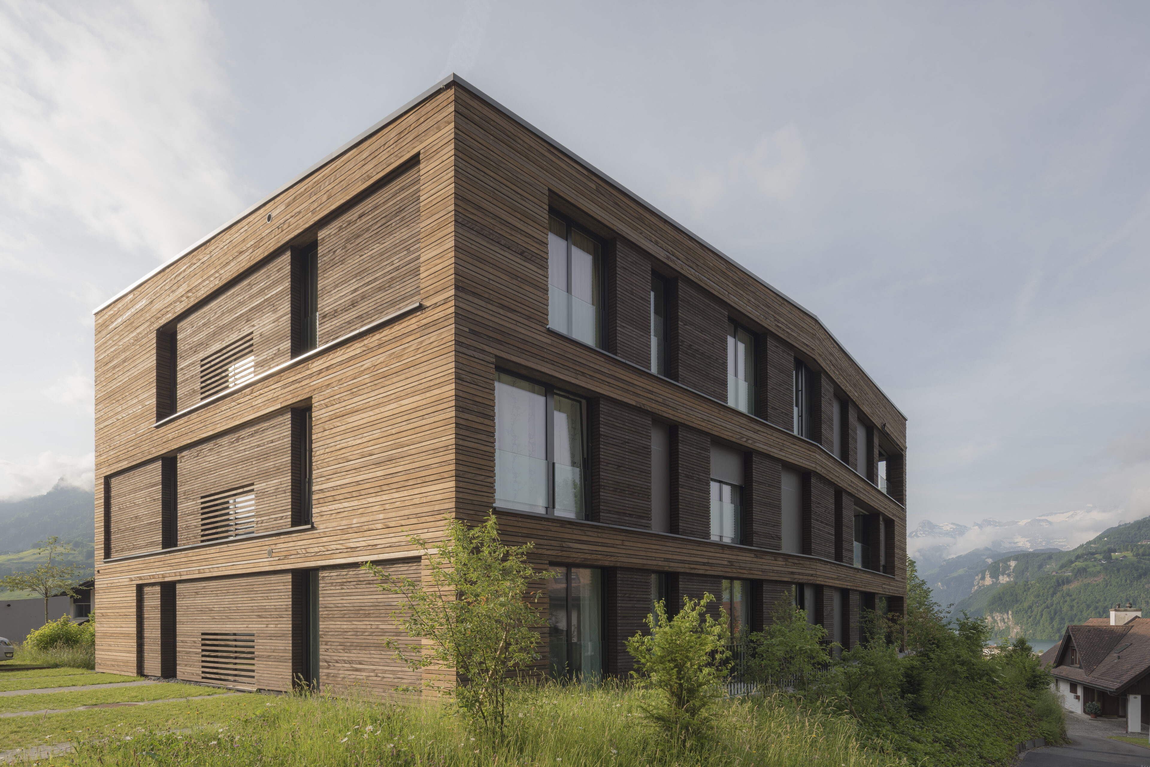 Ausrichtungen der Nachbarbauten am Hang und zum Strassenraum. Gleichzeitig werden mit dem mehrwinkligen Grundriss die kubische Form besser in die Situation eingebunden und die Fassadenlängen optisch verkürzt und gebrochen. Der breitgelagerte Grundriss zeigt mit seinen Fassaden in die Landschaft. Die einzigartige Landschaft wird nun zum «Partner» vis à vis der Fassade.