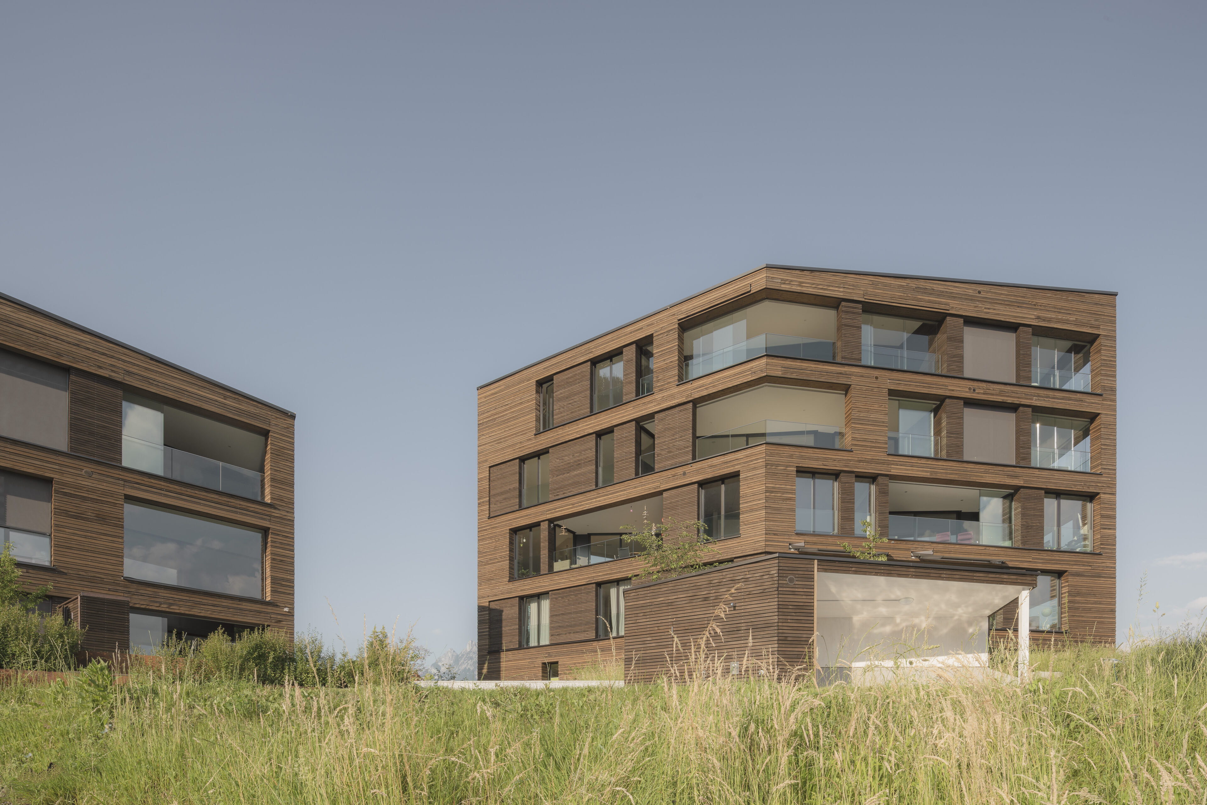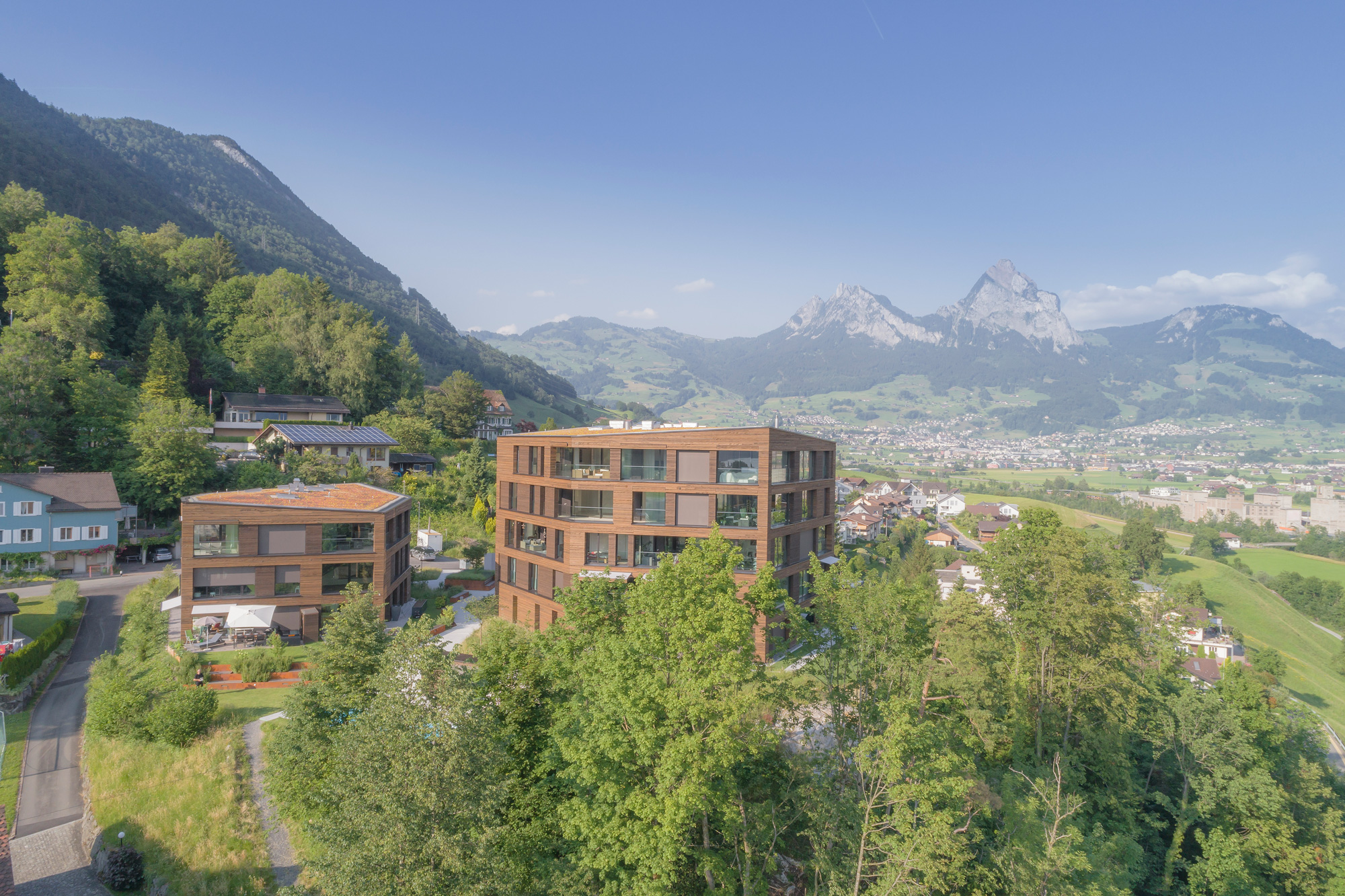 Vorgesehen sind zwei unterschiedlich hohe Häuser, strassenseitig ein 3- geschossiges und talseitig ein 5-geschossiges Haus. Durch die verschränkte Anordnung der beiden Häuser entstehen zwei grosszügige Plätze auf dem Hügelplateau – der Platz der Ankunft und der Platz der Aussicht mit einer