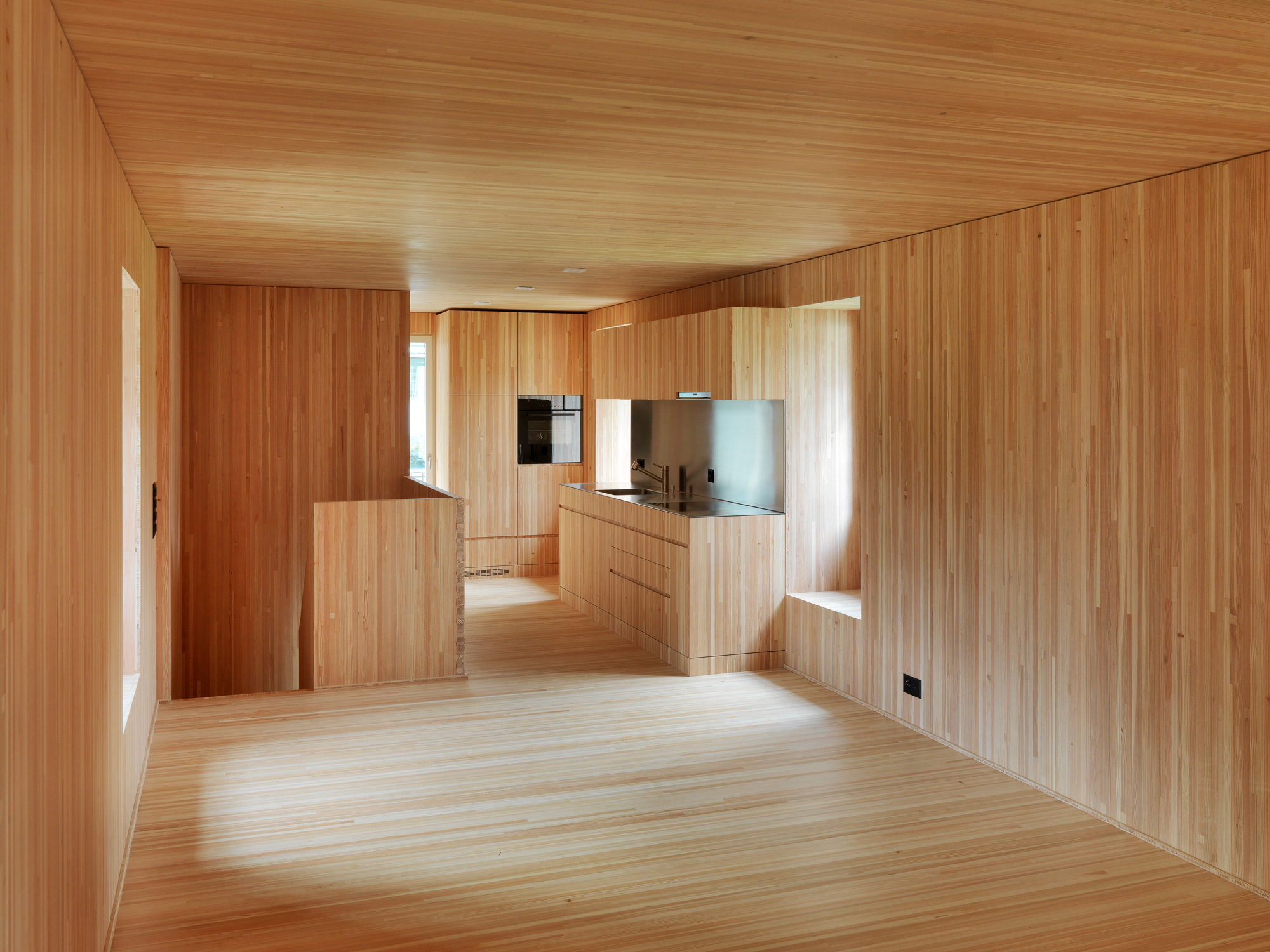 Das ganze Obergeschoss ist in Holz ausgekleidet. Dreischichtplatten in Lärche bestimmen sämtliche Böden, Decken, Wände und Möbel. Es entsteht ein homogenes Raumgebilde, wo alle Details konstruktiv sauber und auf selten elegante Weise gelöst sind. Die Lärchenplatten sind zu eigentlichen Bildern gefügt und besitzen eine höchst dekorative Qualität.