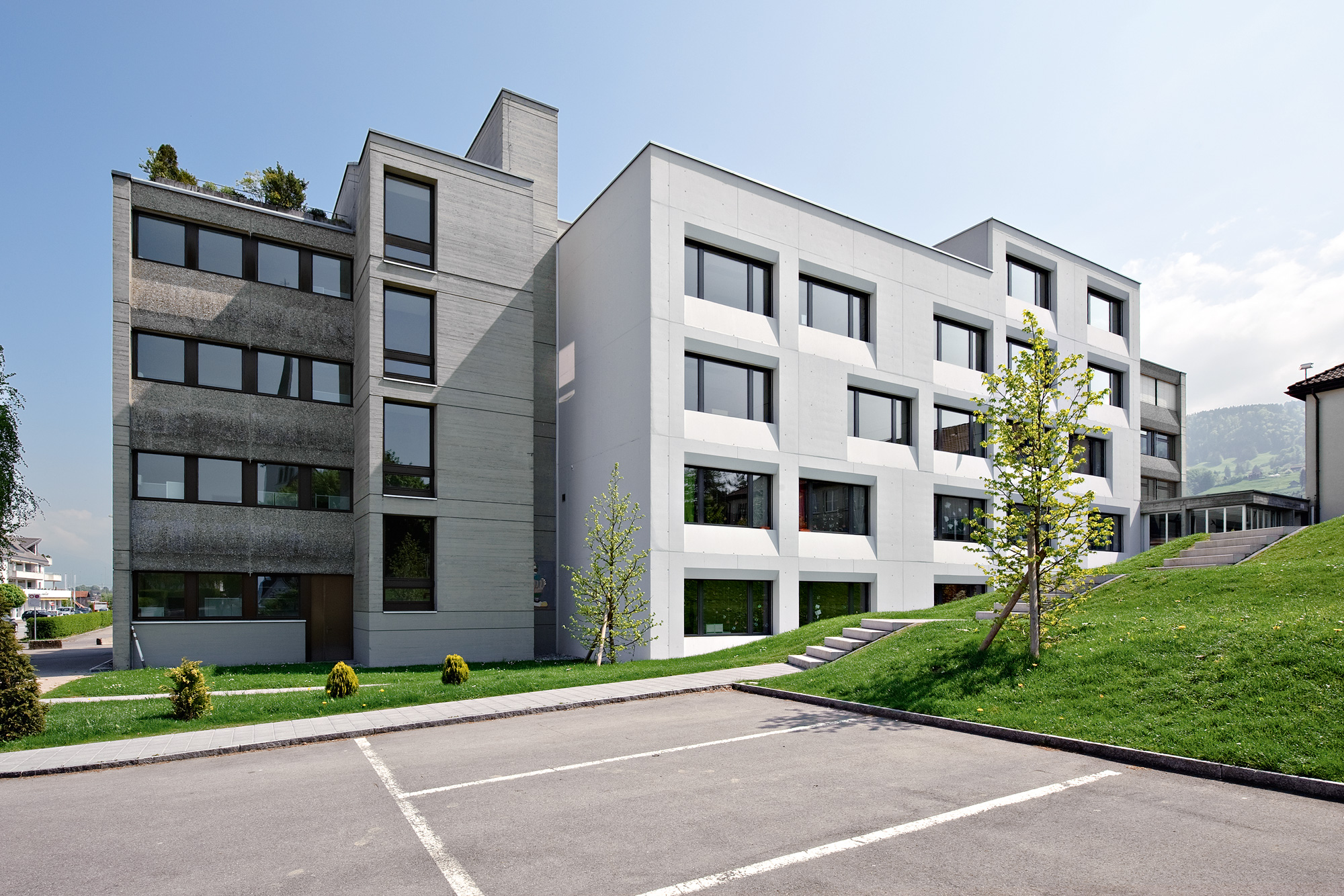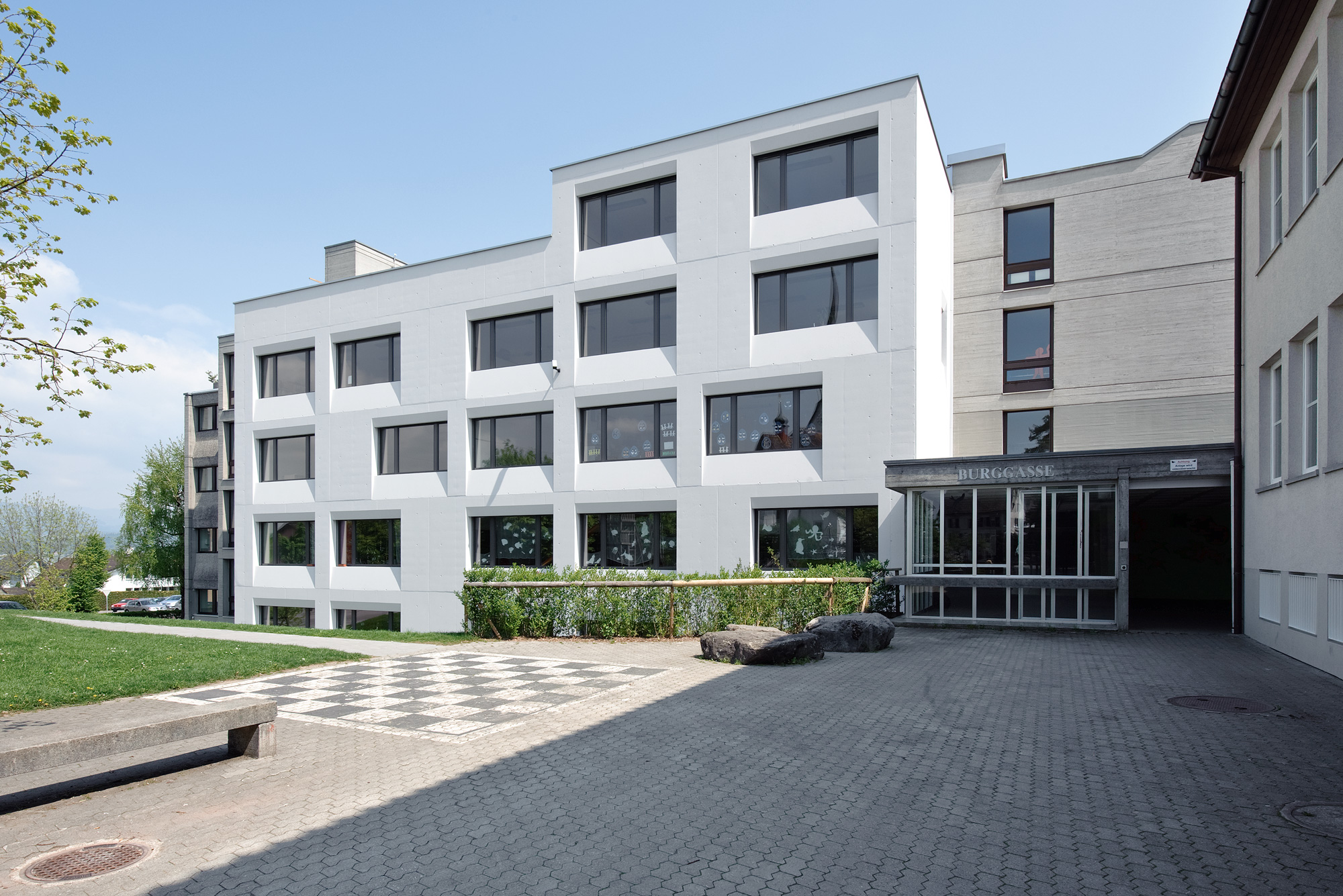 Neue Unterrichtsformen mit Gruppenäume und weiteren Spielzimmern erforderten den realisierten Anbau. Dieser orientiert sich formal am bestehenden Bau und interpretiert diesen neu.