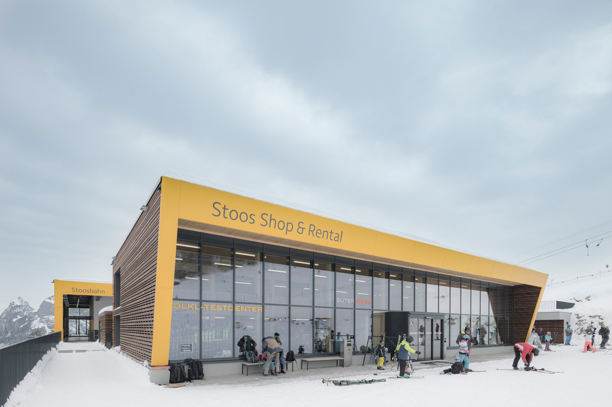 Nun – was prägt die Gebäude? Die bogenartigen gelben Rahmen im Tal (Talstation) stellen offene Tore dar, welche Auftakt und Empfang zur neuen Bahn symbolisieren. Eine einfache einladende Geste, welche den Besucher auf dem ebenen Parkgelände würdig empfängt.