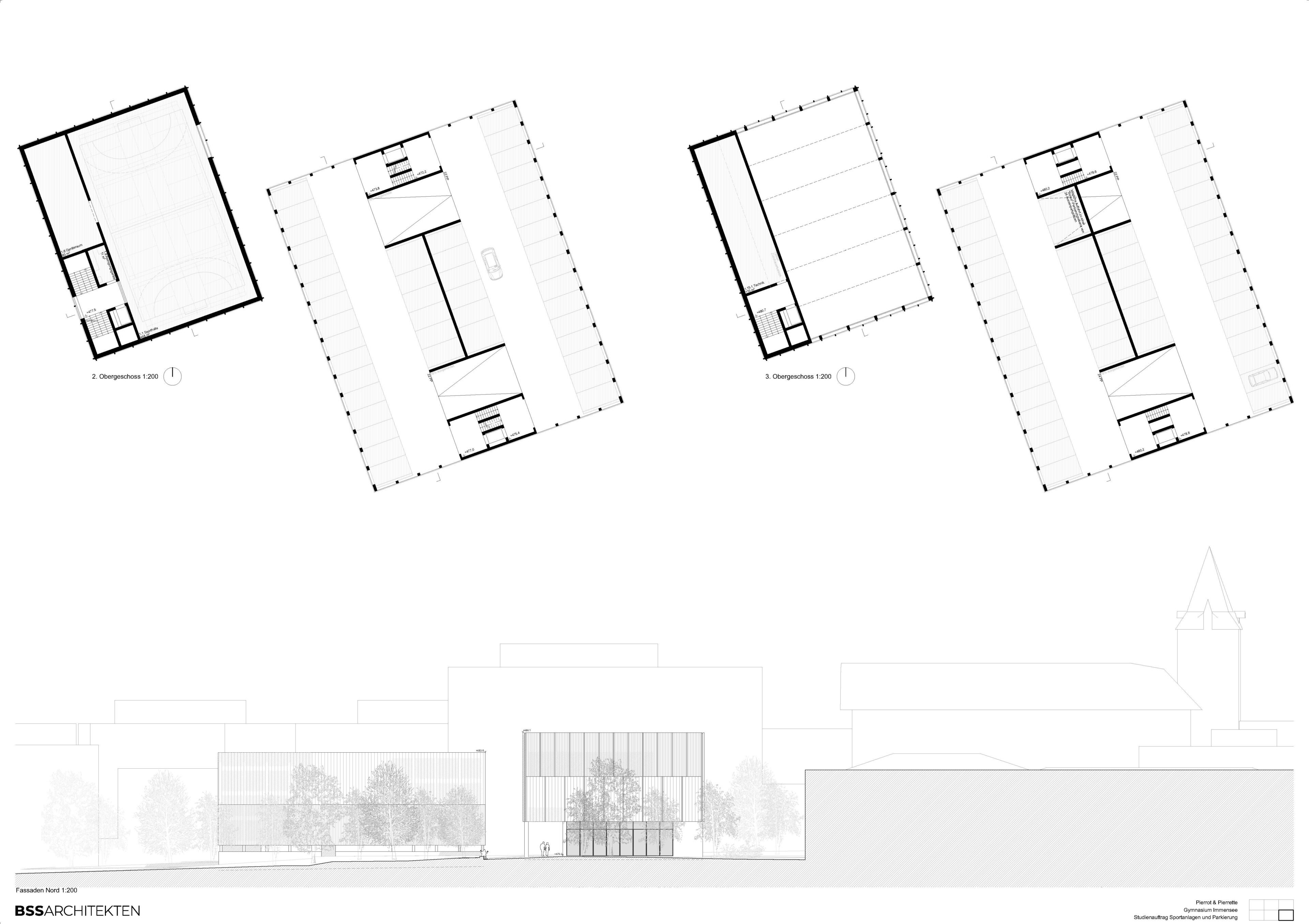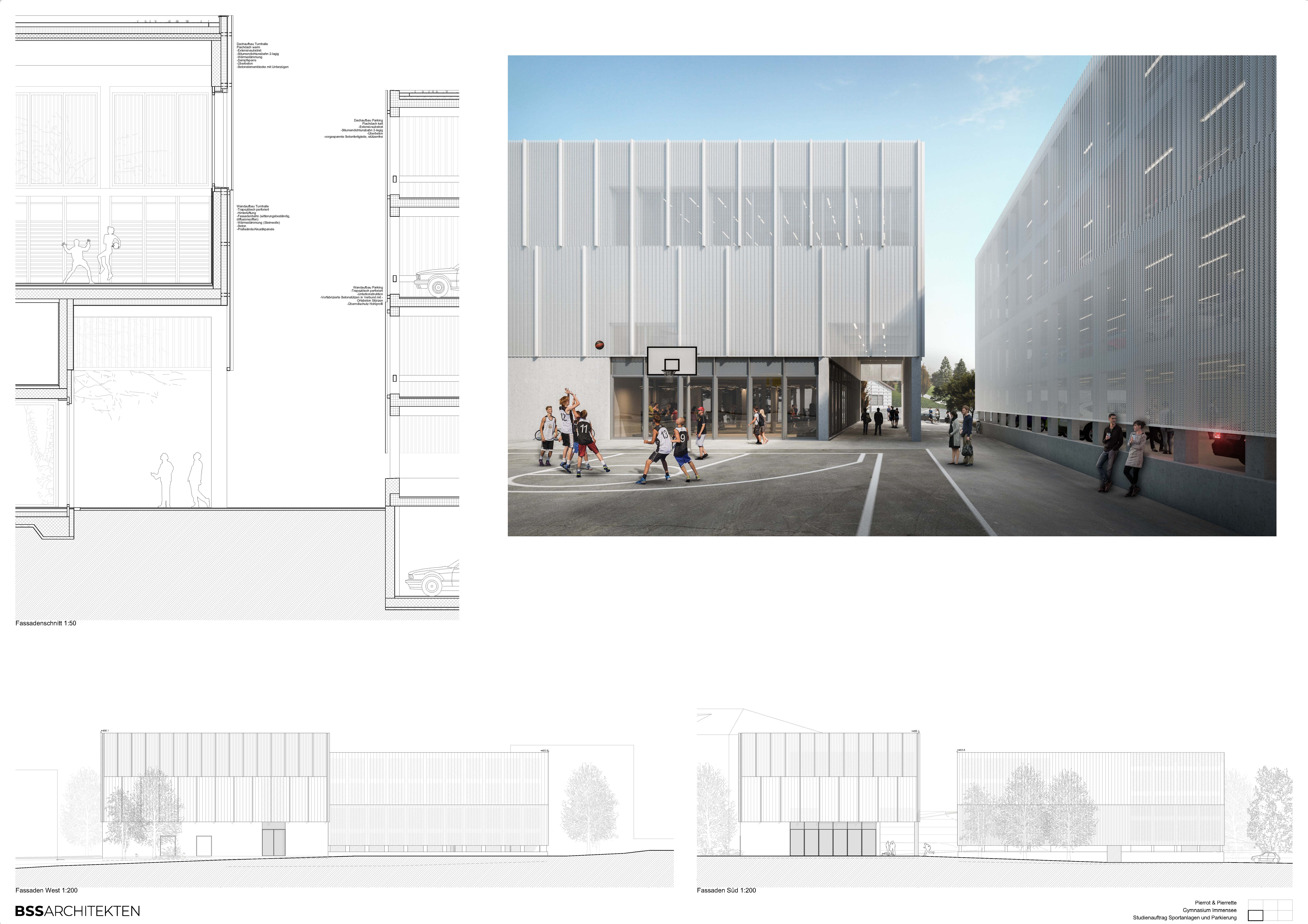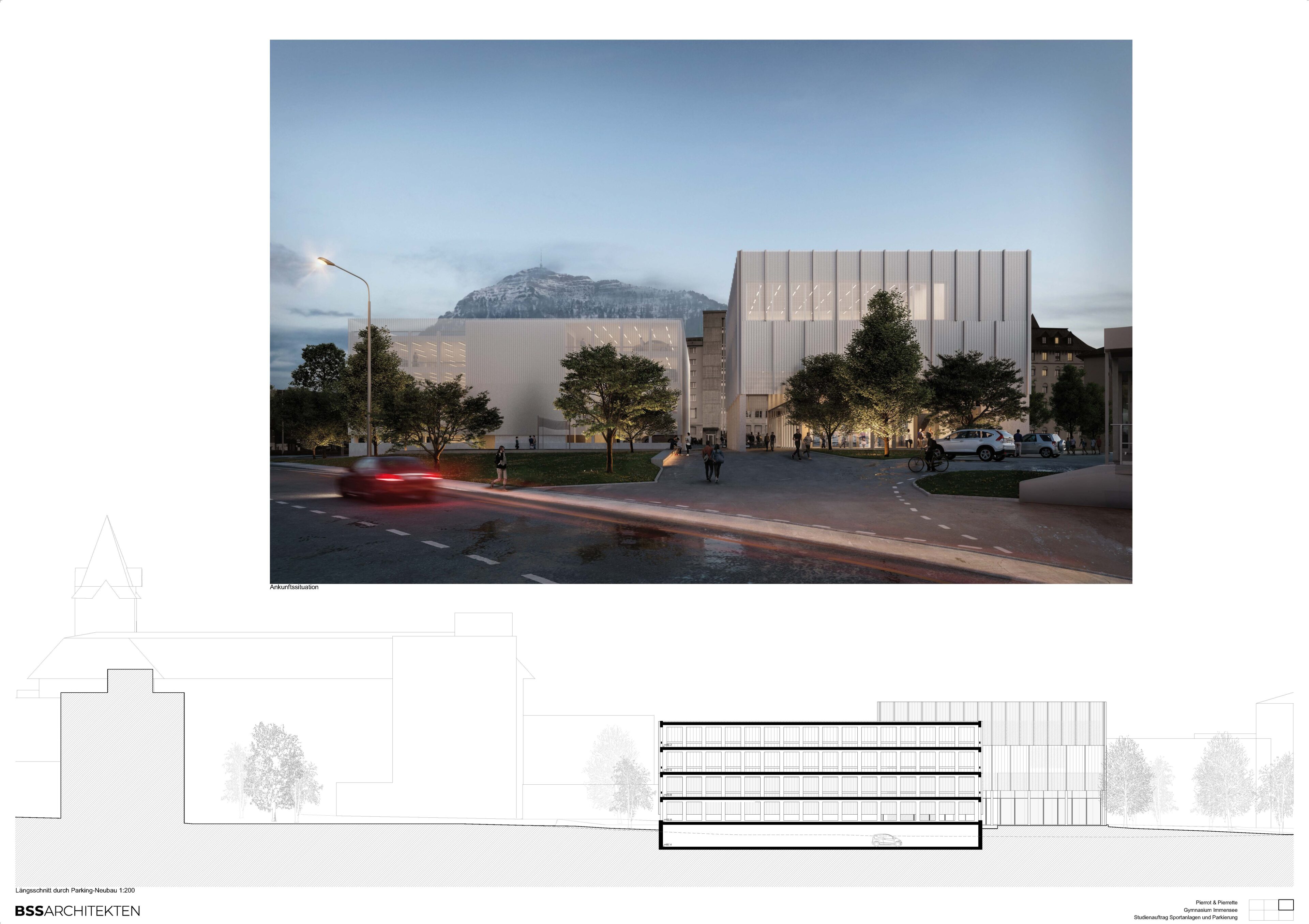 Zwei klare Volumen, sich gleichend aber dennoch differenziert im Ausdruck und der Funktion, bilden den neuen baulichen Auftakt des Gesamtareals Gymnasium Immensee. Ausgehend von der Aufgabenstellung, ein Ersatzbau mit Sportnutzungen fürs Gymnasium und ein Parkhaus fürs Wohnen im Bethlehem, entstanden zwei Volumen, welche sich als Ensemble in die vorhandene Ordnung integrieren.