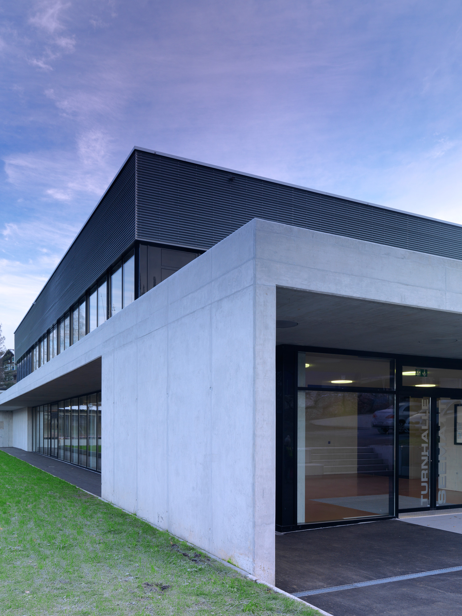 Die Höhe des Hallen- und Eingangsgeschosses entspricht dem bestehenden Garderobentrakt. Eine sehr gedrungene Dachtragkonstruktion mit Betonunterzügen ermöglichte die Gebäudehöhe unter der vormals bestehenden Giebelhöhe der alten Turnhalle zu halten.