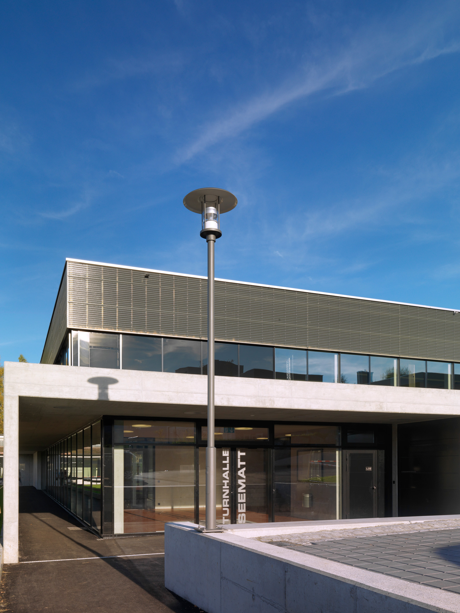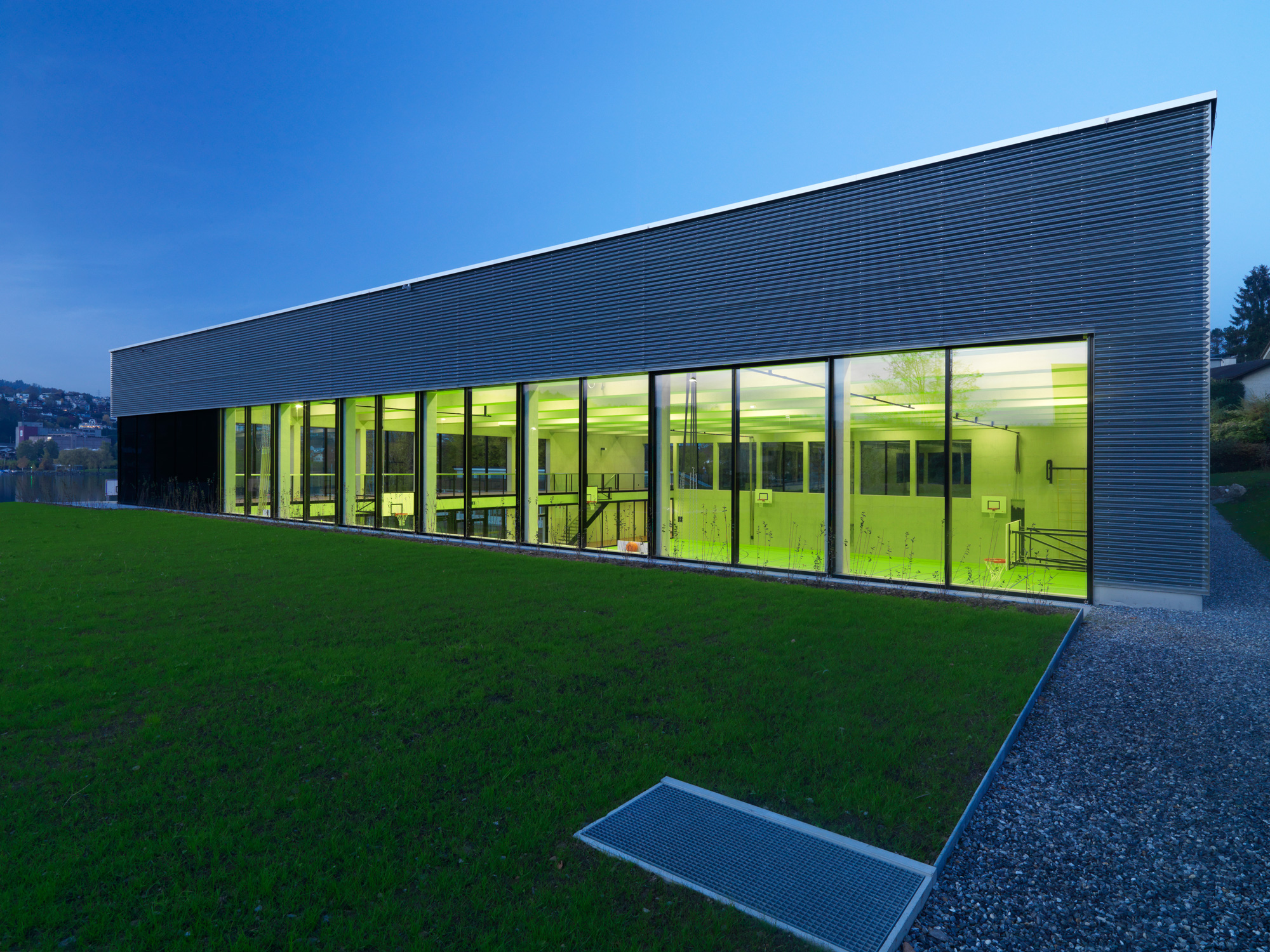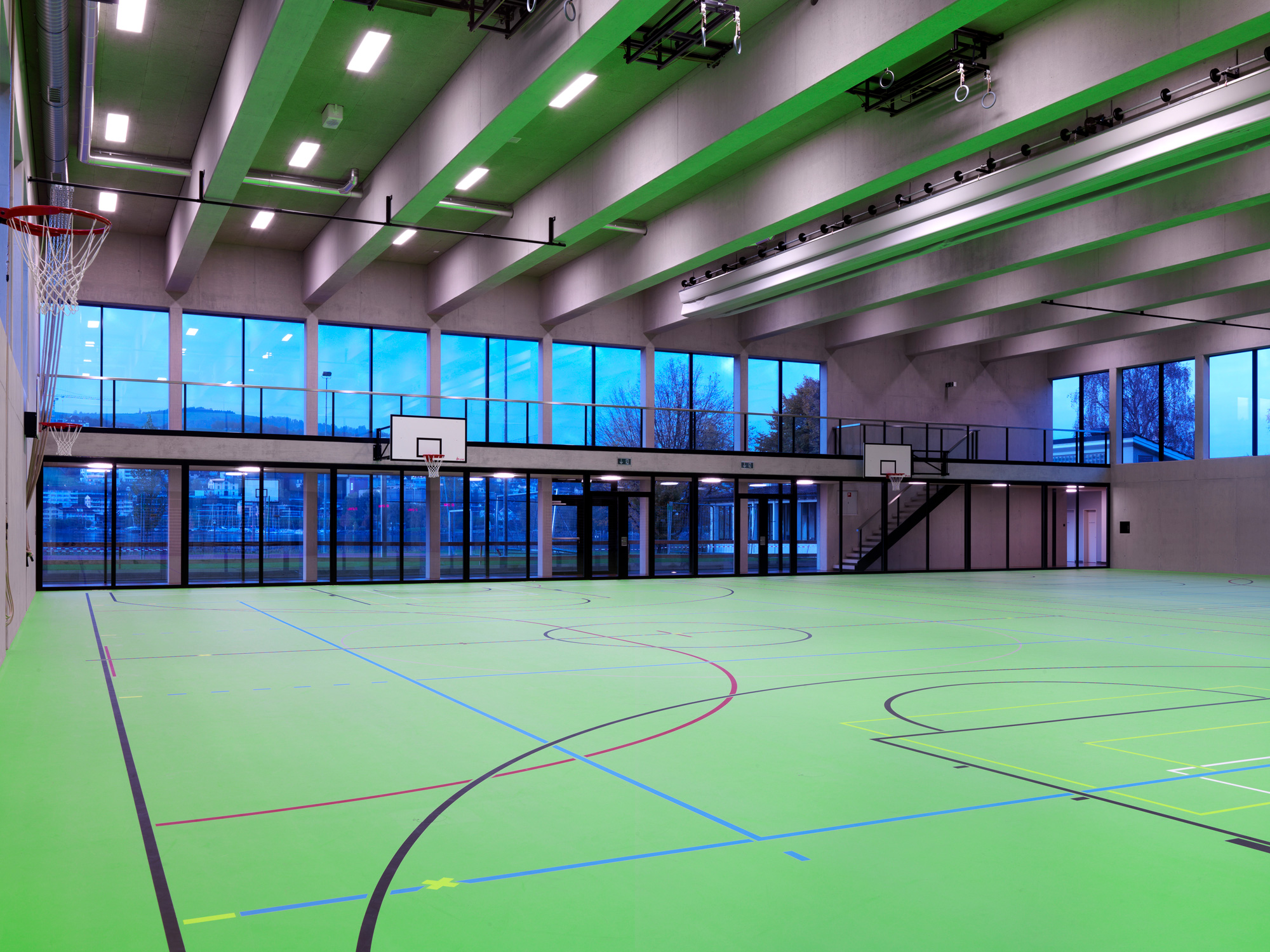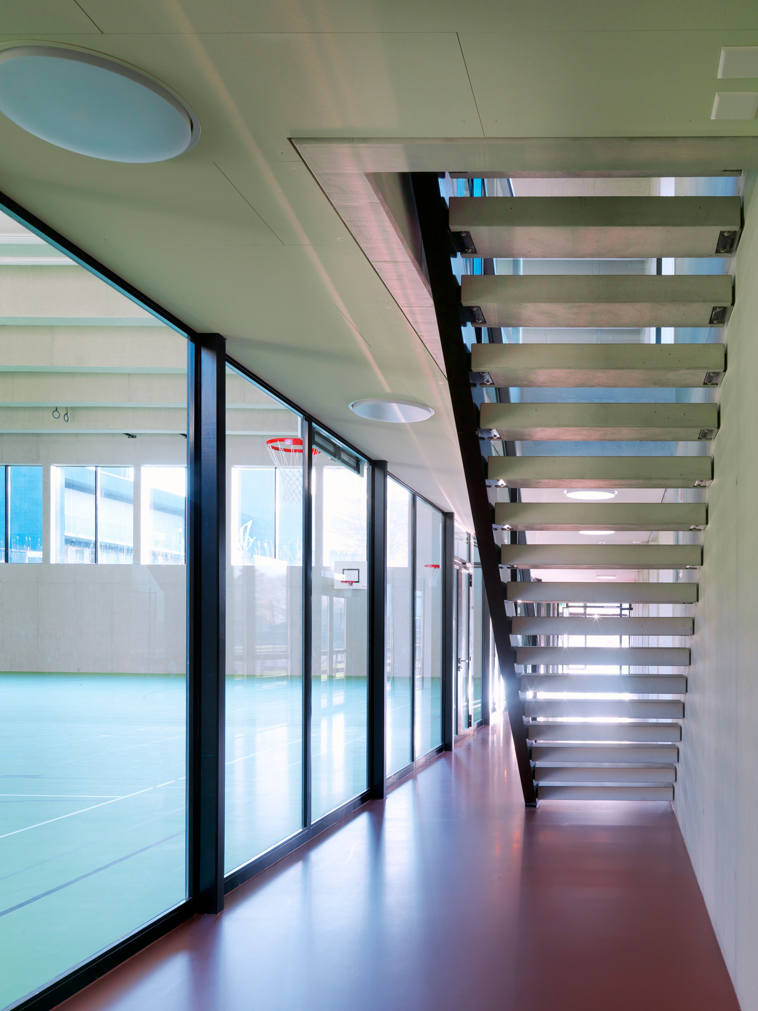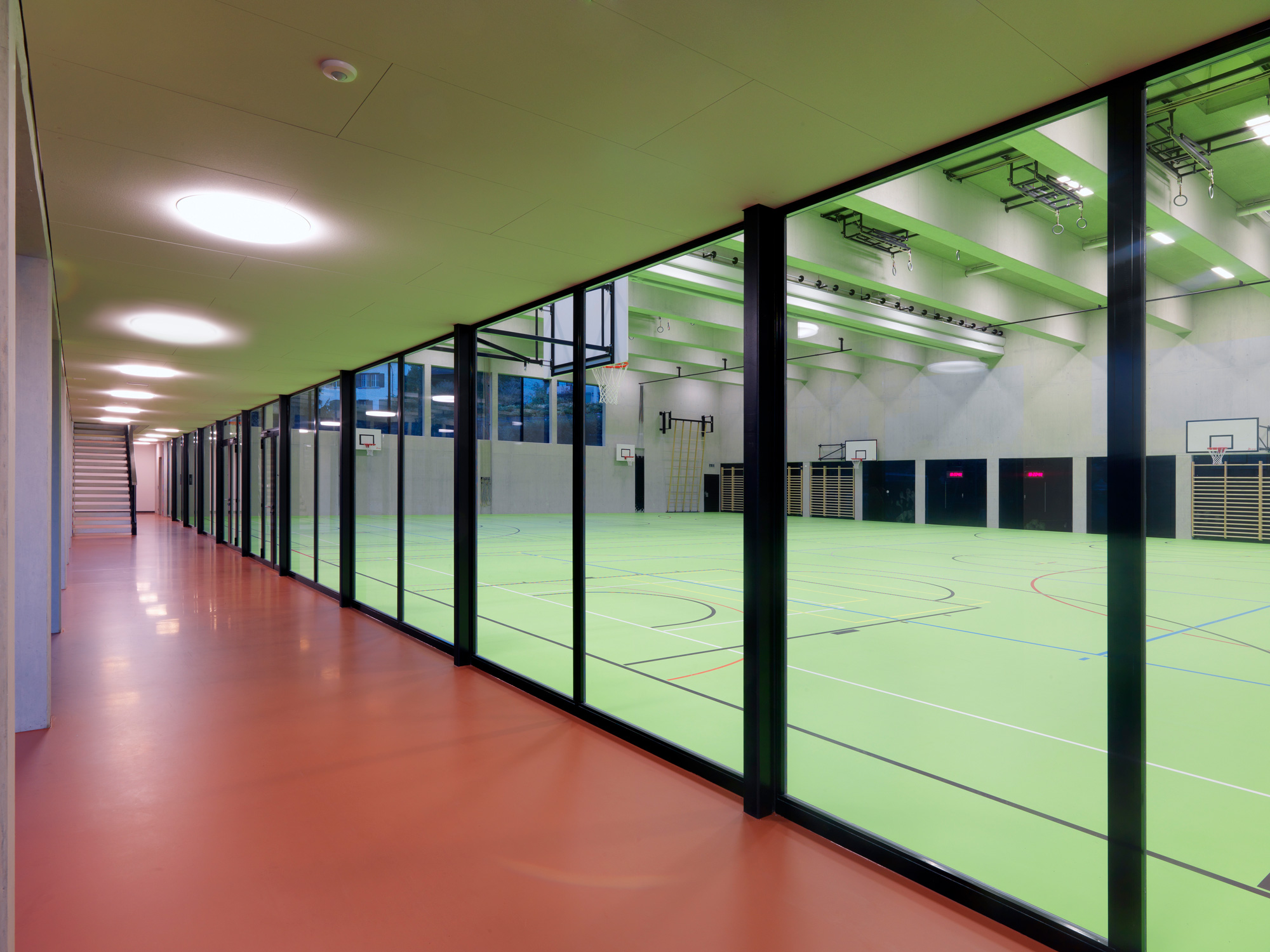 Ein frisches Farbkonzept innen und eine sehr zurückhaltende Materialisierung zeichnen die Turnhalle aus. Belichtet ist der Turnraum über 3-seitige Fensterbänder; über die Korridorzone ist eine einmalige Durchsicht zum See möglich.