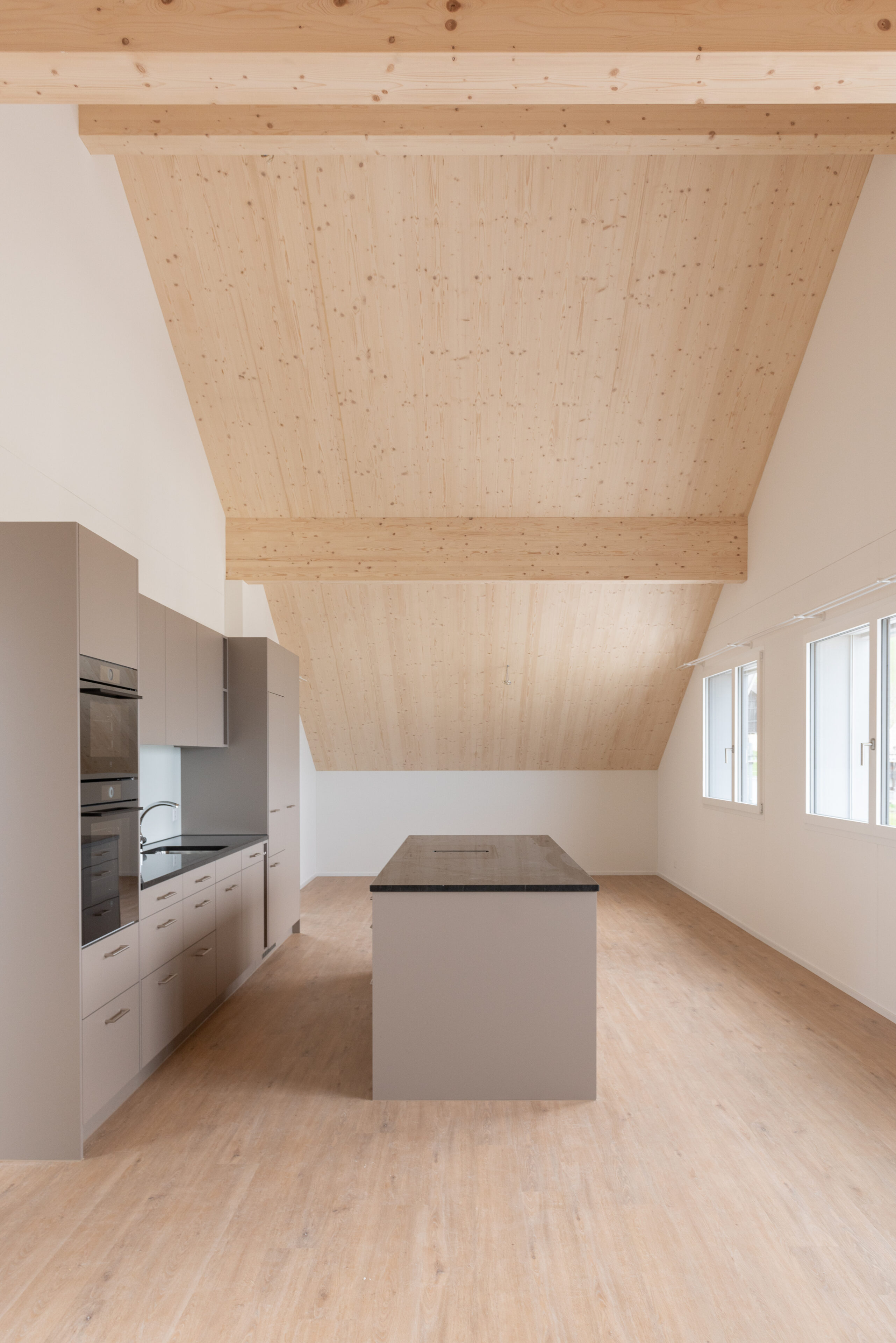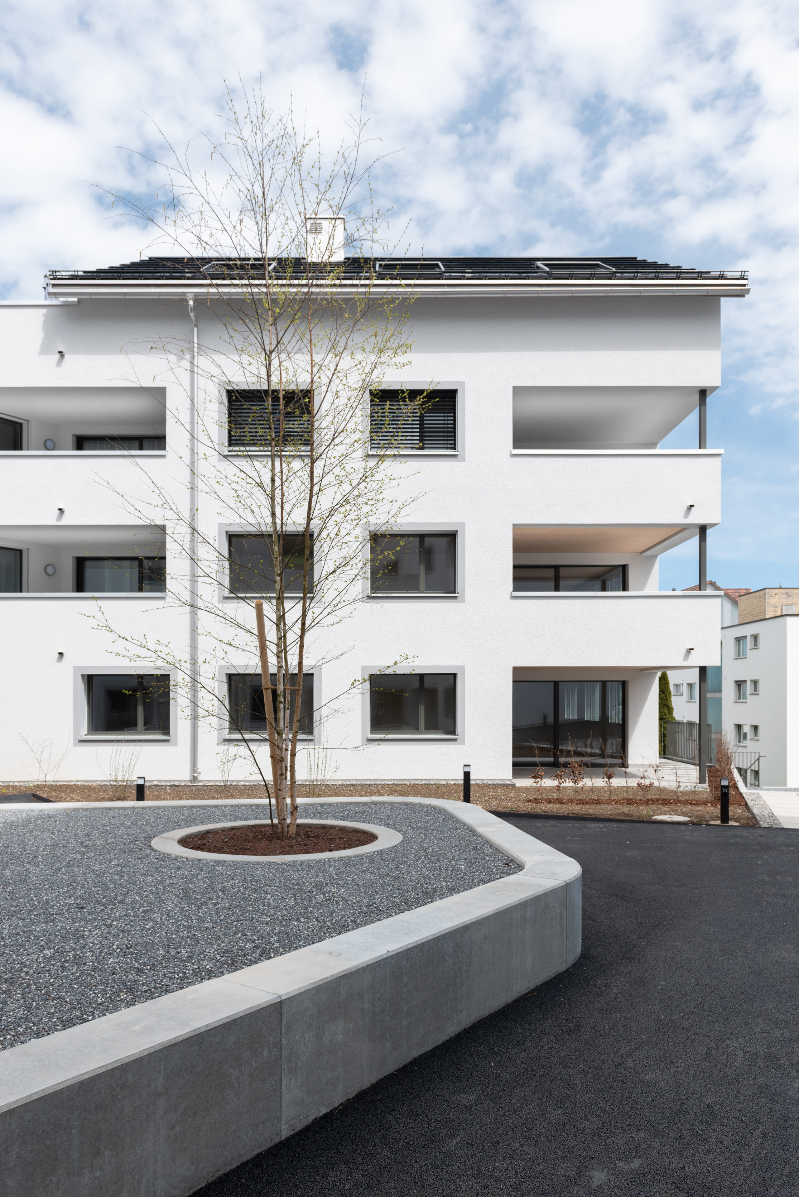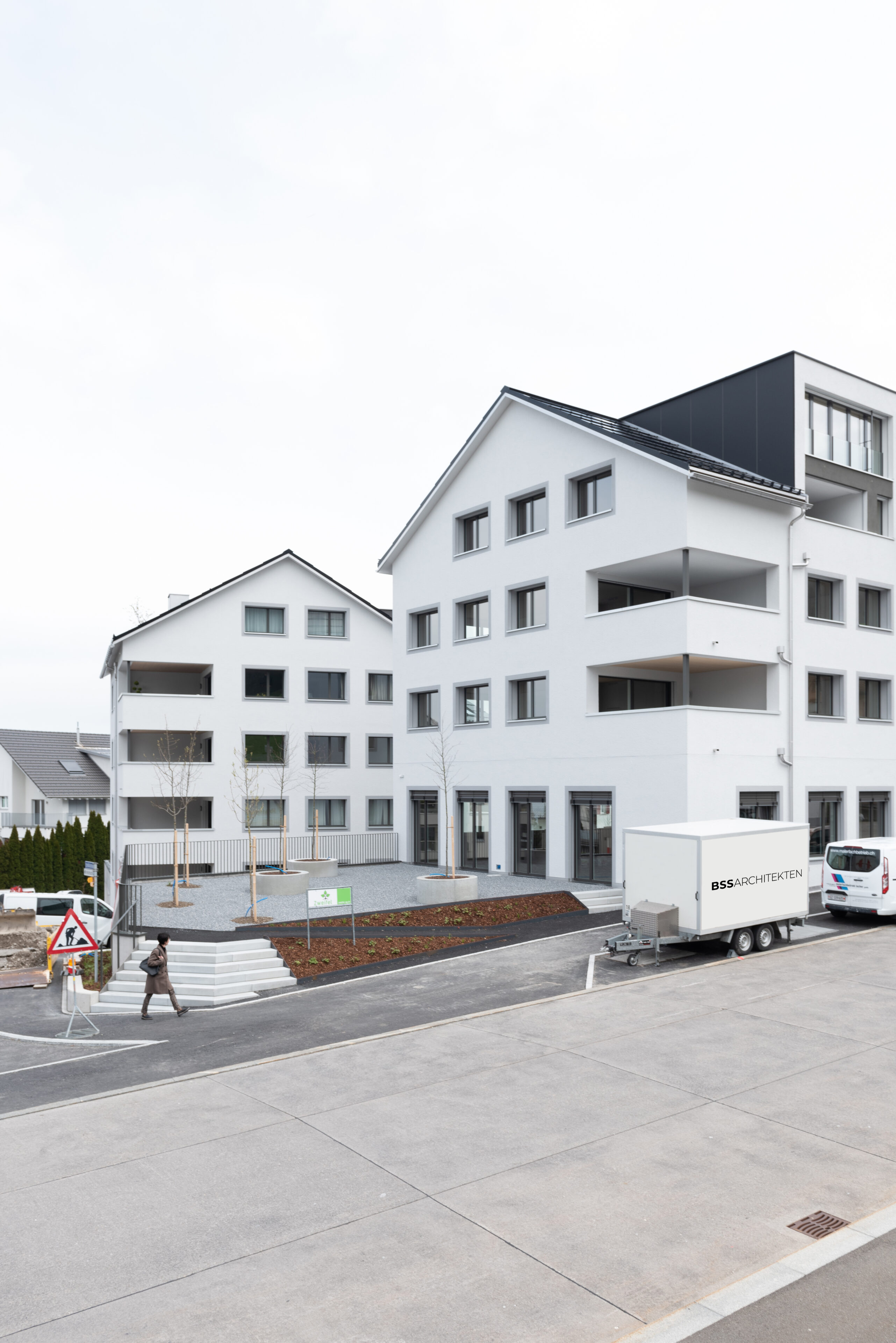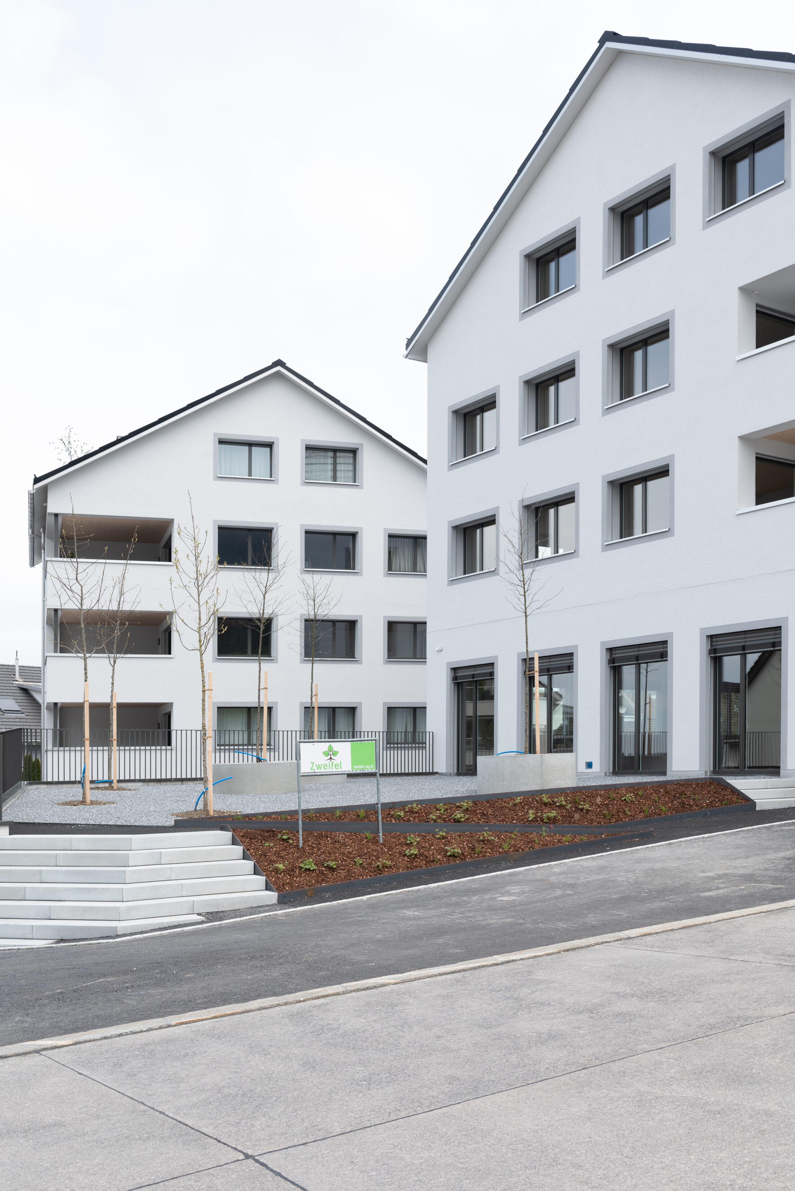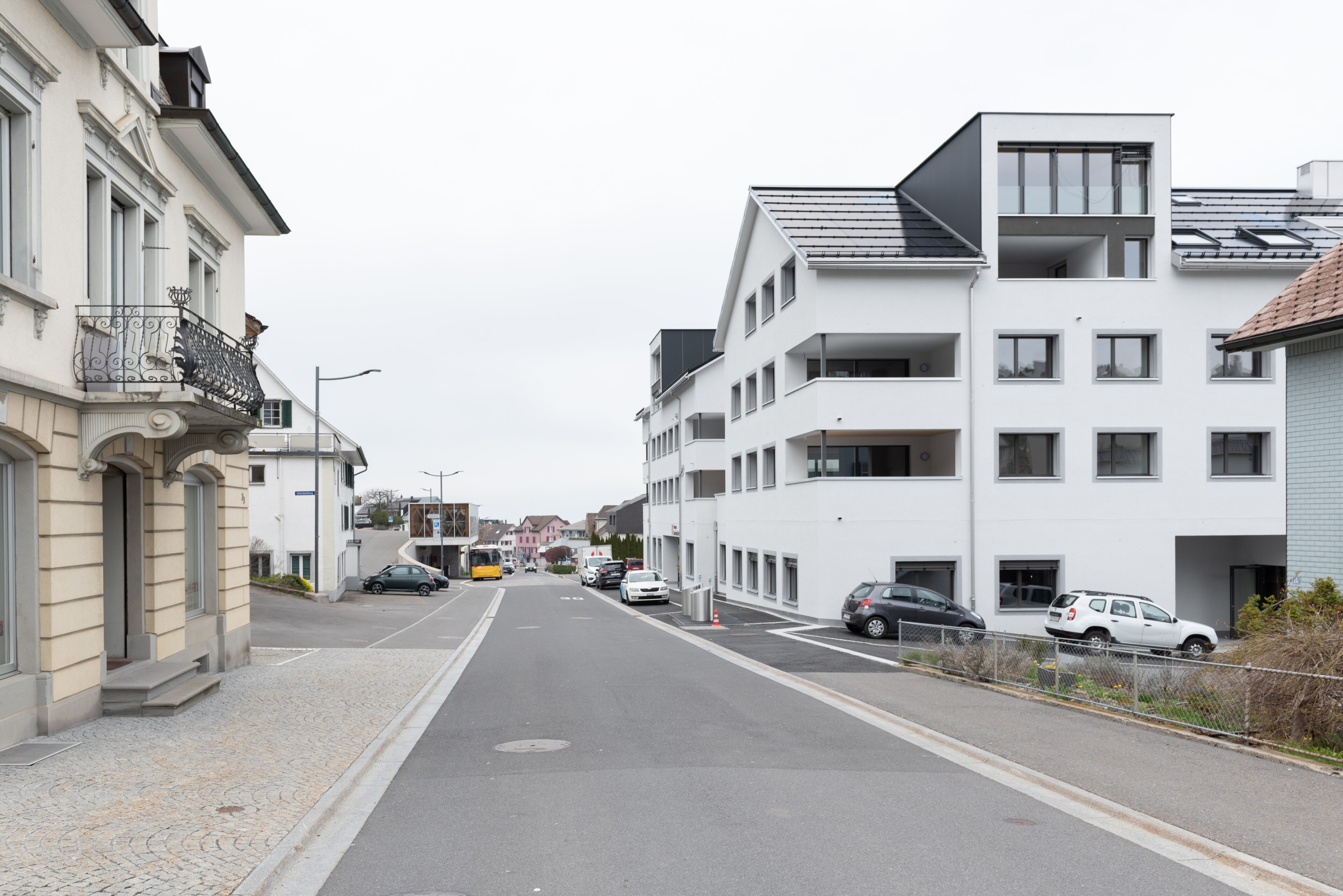 Neben der städtebaulichen Setzung nimmt auch die Erscheinung des Projektes Bezug auf die bestehenden Bauten. Giebeldächer führen das Dorfbild weiter und stehen mal traufseitig mal giebelseitig zur Strasse hin. Entlang der Dorfstrasse sind im Erdgeschoss publikumsorientierte Nutzungen und in den Obergeschossen 26 Mietwohnungen vorgesehen. Durch die zentrale Lage und die gute Anbindung an den öffentlichen Verkehr kann eine durchmischte Bewohnerschaft gefördert werden.