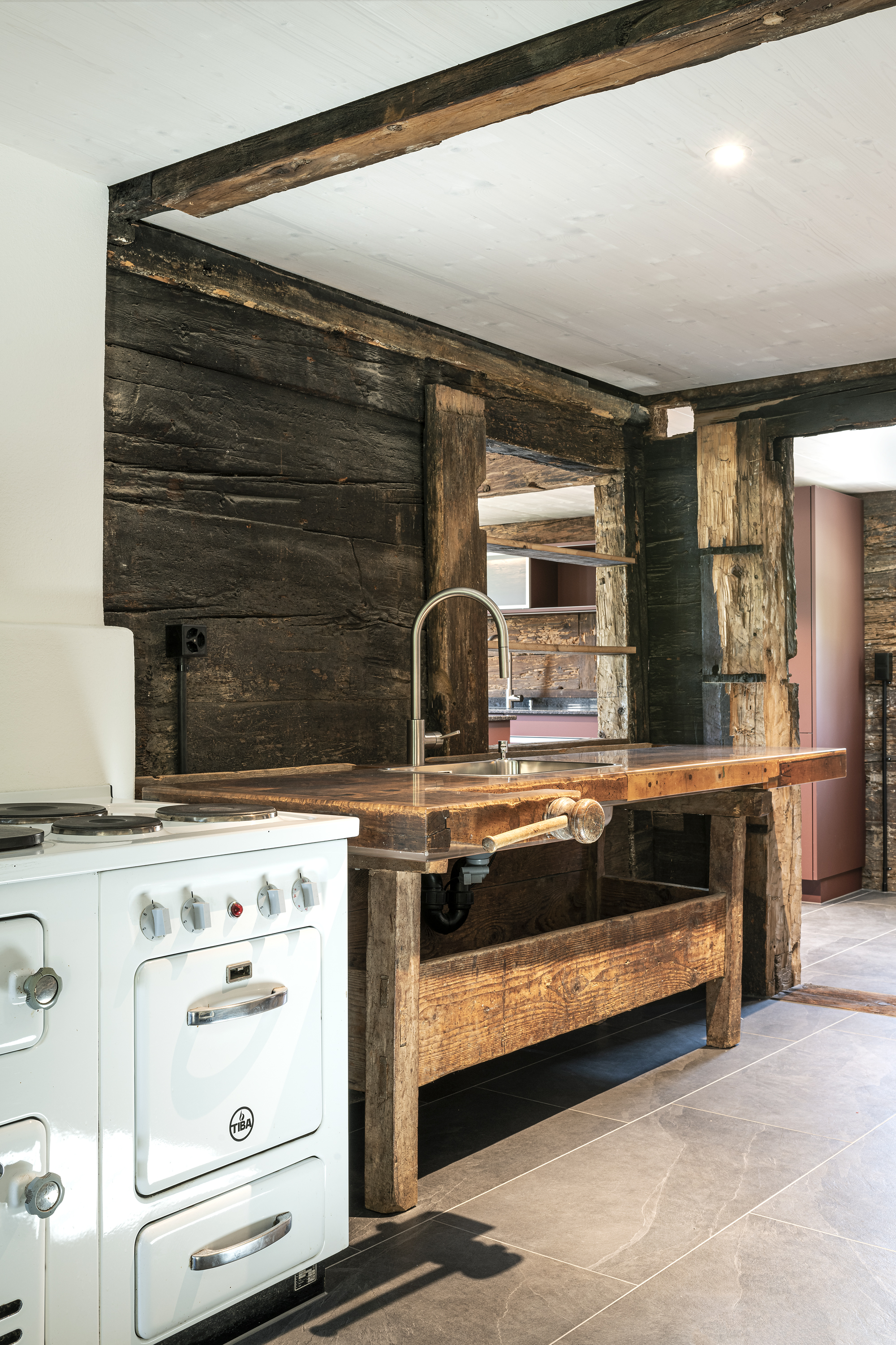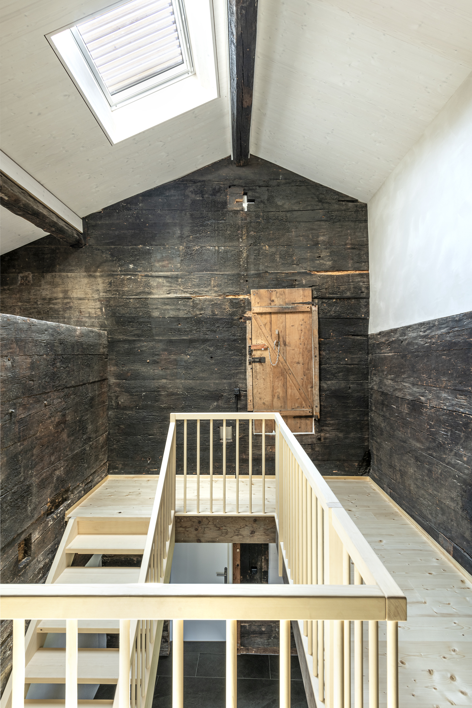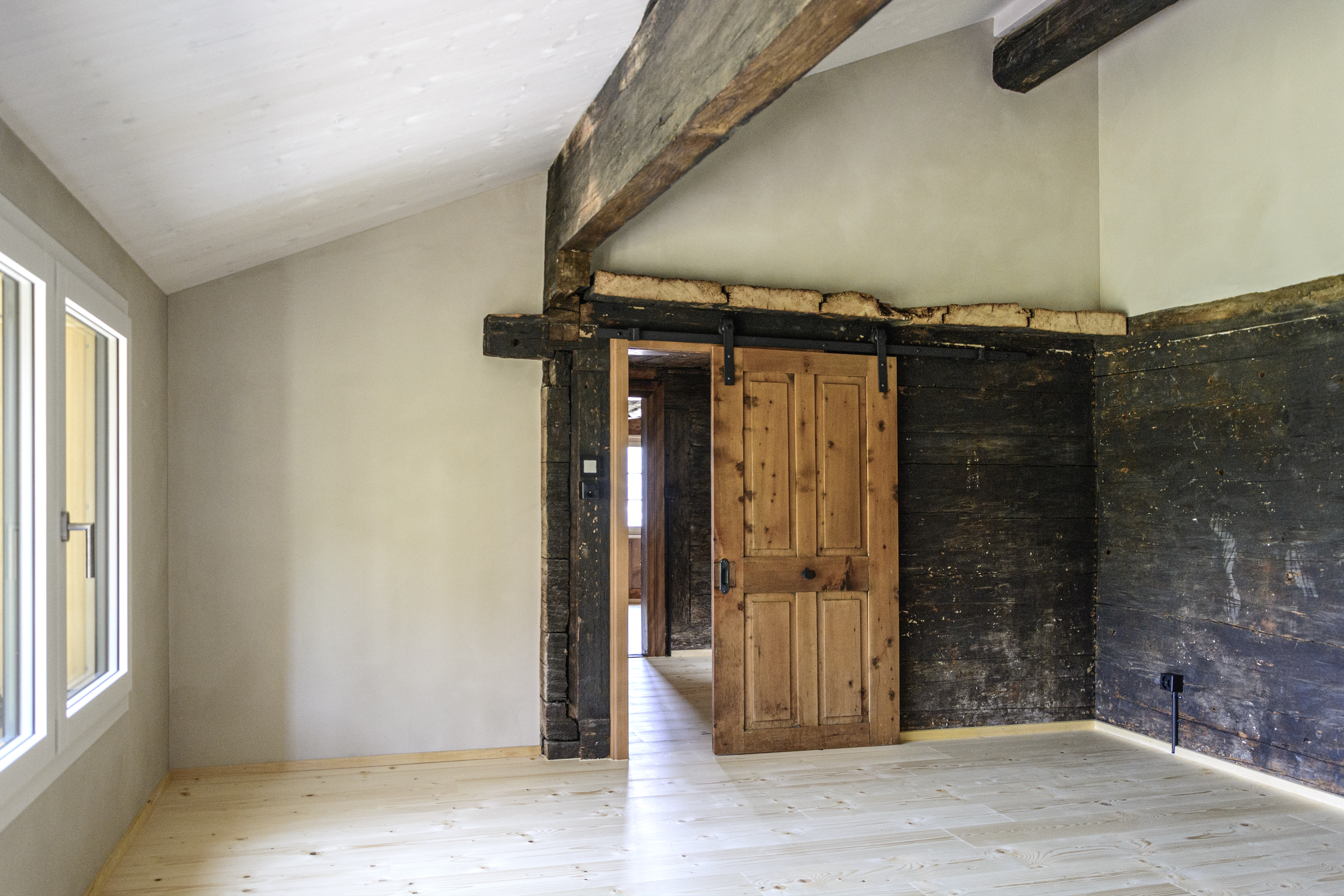Um dem Ursprung des Gebäudes Tribut zu zollen, wurde die Nordfassade von der aktuellen Fassadenoberfläche freigespielt und der dahinterliegende Blockbau wieder bewusst gezeigt. Der südliche Bereich des Gebäudes, welcher zu einem späteren Zeitpunkt ergänzt wurde, ist durch einen neuen Anbau ersetzt worden. Um das Gebäude als eine Einheit zu zeigen, wurde das Volumen des Neubaus dem Bestand angeglichen. Jedoch ist alt und neu gleichwohl voneinander differenziert. Dies ist in der Gestaltung der Fassade ersichtlich. Im bestehenden Bereich des Gebäudes ist die klassische Struktur des Holzverschlags gewählt. Im Bereich des Neubaus hingegen setzt man auf eine eher modernere Form der vertikal ausgerichteten Holzlamellen, welche einen nahtlosen Übergang von der Fassade zum Dach bilden. Im Innern des Gebäudes ist der Bestand so weit wie möglich erhalten und lediglich an den notwendigen Stellen ergänzt. Primär ist die vertikale Erschliessung von Erdgeschoss und Obergeschoss neu ins Zentrum des Gebäudes versetzt. Zusätzlich wurde auf der Ostseite des Gebäudes neu die Parkierung in die Umgebung eingegliedert. Der Bauherrschaft war es wichtig, das Gebäude aktiv unter Denkmalschutz stellen zu lassen, da sie den Grundgedanken dieser Baute aus dem 14. Jahrhundert in seiner Form schützen und den Wert der Zeit in Kombination mit der Moderne beibehalten möchten.