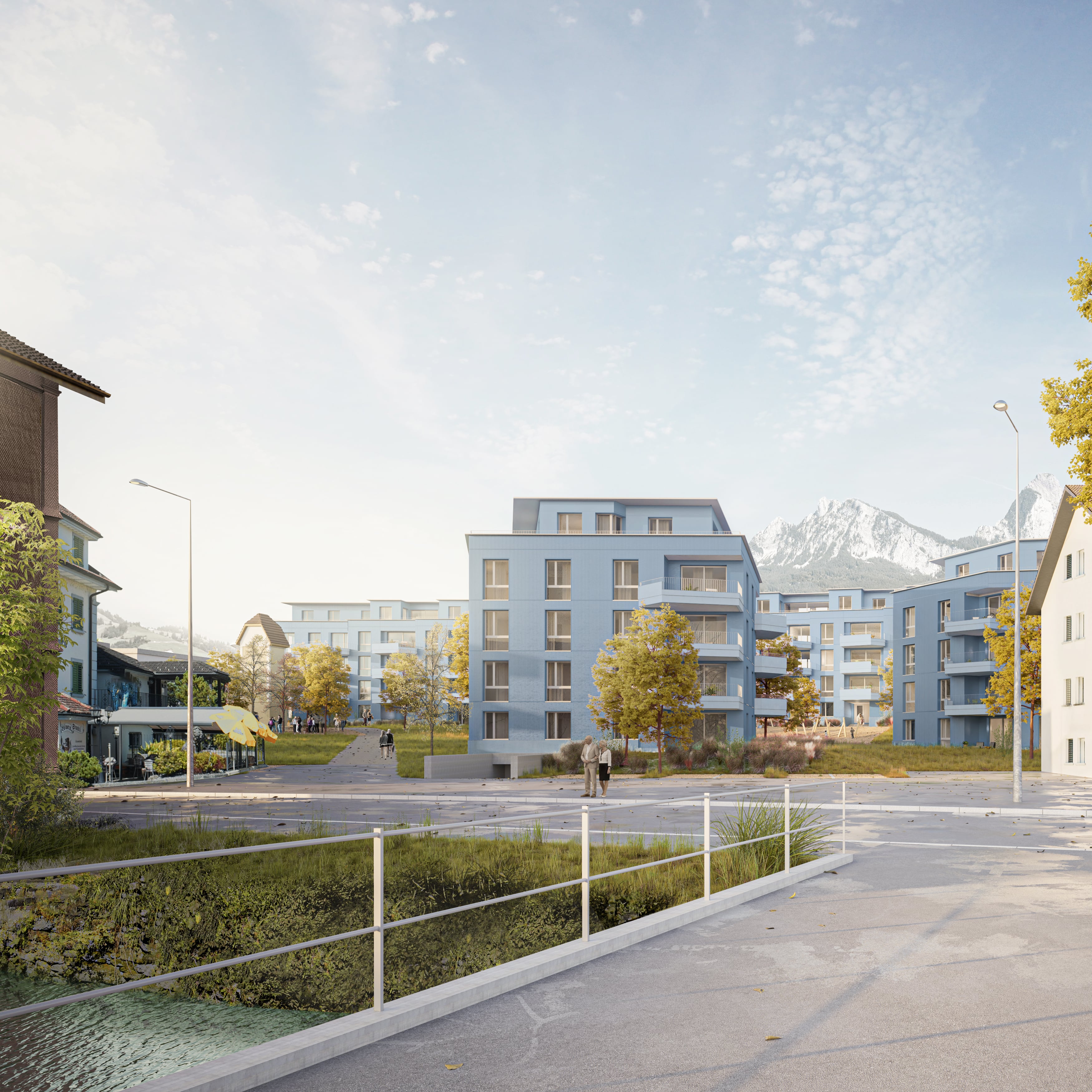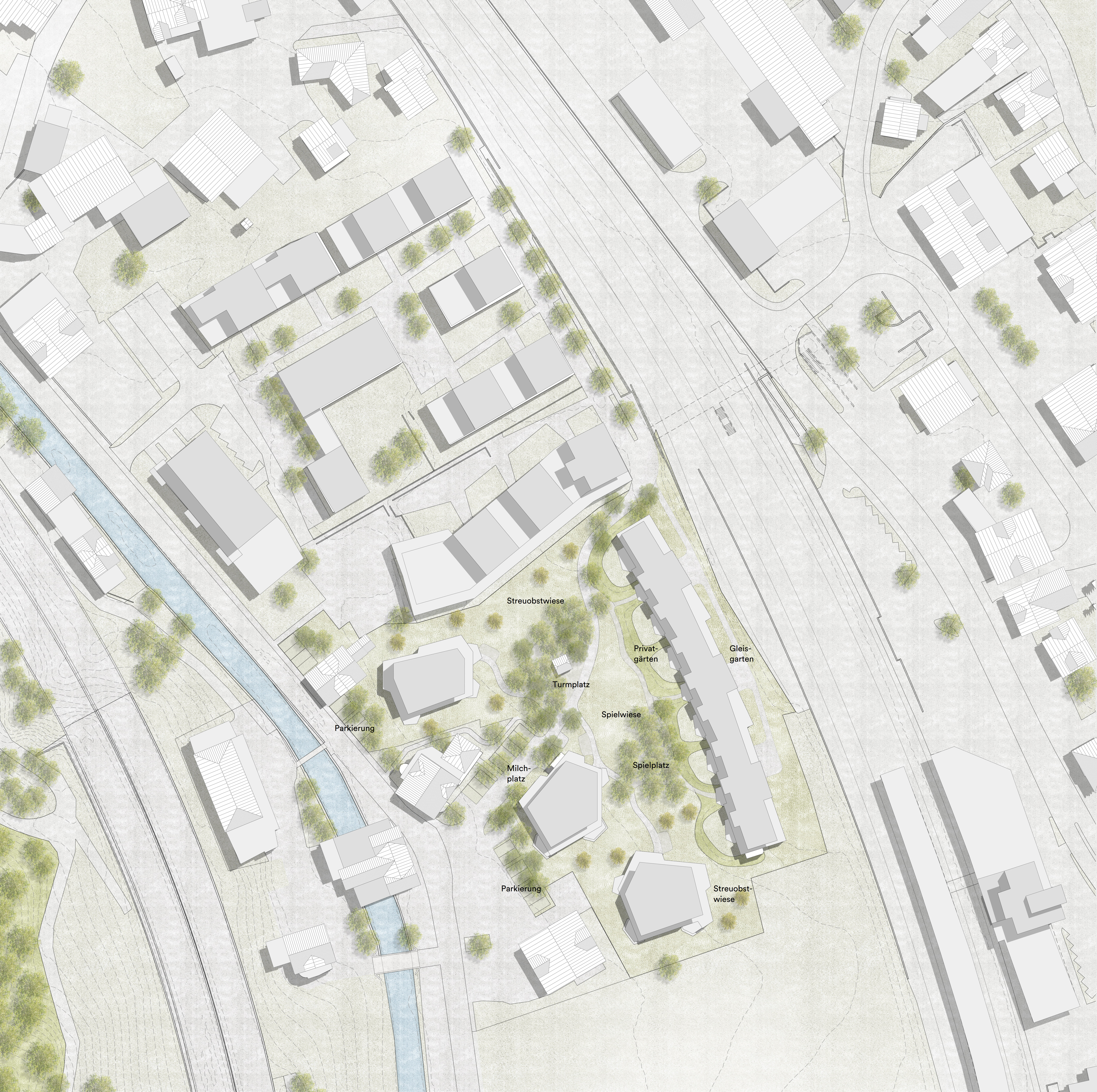 Der Perimeter befindet sich in einem Übergangsgebiet zwischen grossmassstäblichen, linearen Bauten entlang der Gotthard-Eisenbahnstrecke und dem kleinmassstäblichen, historisch gewachsenen Dorfteil entlang der Seewernstrasse. Das Projekt thematisiert den Übergang zwischen diesen verschiedenen Massstäben. Der Riegelbau orientiert sich an den linearen Baukörpern entlang der Eisenbahnstrecke, die Punktbauten fügen sich in die historisch gewachsene Struktur ein und ergänzen diese. Um die historischen Bauten nicht zu konkurrenzieren sind die neuen Punktbauten zur Strasse rückversetzt situiert. Die bestehenden Gebäude werden dadurch in der Erscheinung gestärkt und der Strassenraum wird durch Raumausweitungen in seiner Qualität gesteigert. Der Riegelbau situiert sich entlang der Eisenbahnstrecke und löst damit den Lärmschutz des neu entstehenden Quartiers. Der sich dazwischen aufspannende Freiraum bietet den Bewohnern grosszügige Spiel- und Erholungsflächen. Als identitätsstiftendes und ortsbildprägendes Element bleibt der Trafoturm bestehen. Durch- und Ausblicke schaffen den Bezug zur Umgebung und verbinden das Quartier mit der angrenzenden Grünfläche und dem Alpenpanorama.