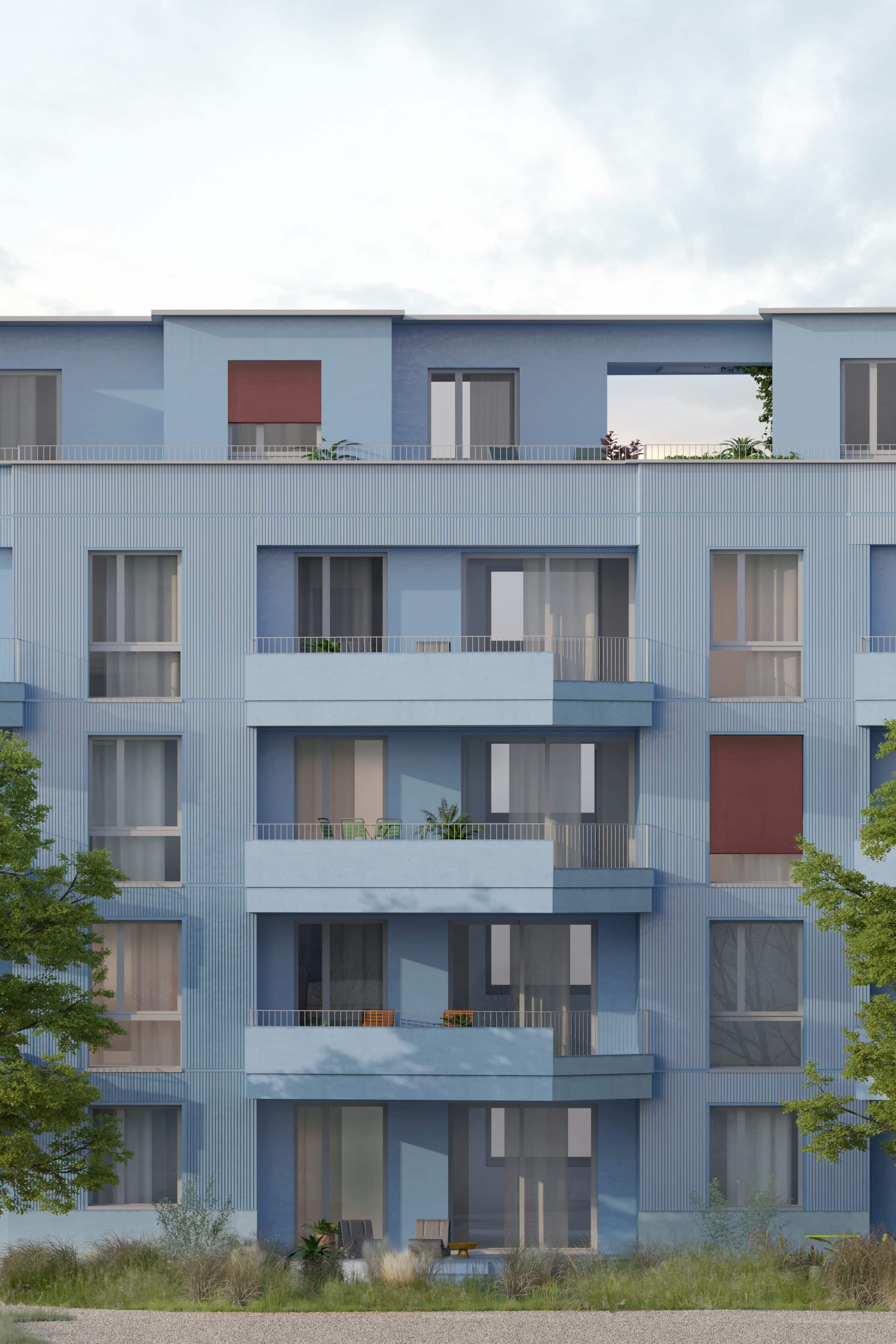 Die Gebäude sind als Dreispänner organisiert und verfügen über ein Erdgeschoss, drei Obergeschosse und ein rückversetztes Attikageschoss. Als Massivbau mit aussenliegender Wärmedämmung und einheitlicher Fassadengestaltung konstruiert, differenziert sich die Putzstruktur vom Erdgeschoss zu den Obergeschossen minimal. Dies, um die Erdgeschosse subtil zu betonen und einen Bezug zum Freiraum zu bilden. Der Sockel variiert je nach Ort in seiner Lage und schützt teilweise die Privatsphäre der Parterrewohnungen. Die Fassade wird durch Balkone, Fenster, Knicke und vertikaler Putzstruktur rhythmisiert. Die Balkonbrüstungen sind in der Höhe versetzt, um einerseits Einblicke zu vermeiden, andererseits um Ausblicke zu ermöglichen. Die blaue Fassadenfarbe bildet einen Kontrast zum pfirsichfarbenen Trafoturm und unterstützt mit der natürlichen Begrünung die Wahrnehmung eines lebendigen Quartiers. Gemeinsam bilden das Gebäudeensemble, der Trafoturm, sowie die Bestandesbauten einen bunten Fleck in Unterseewen.