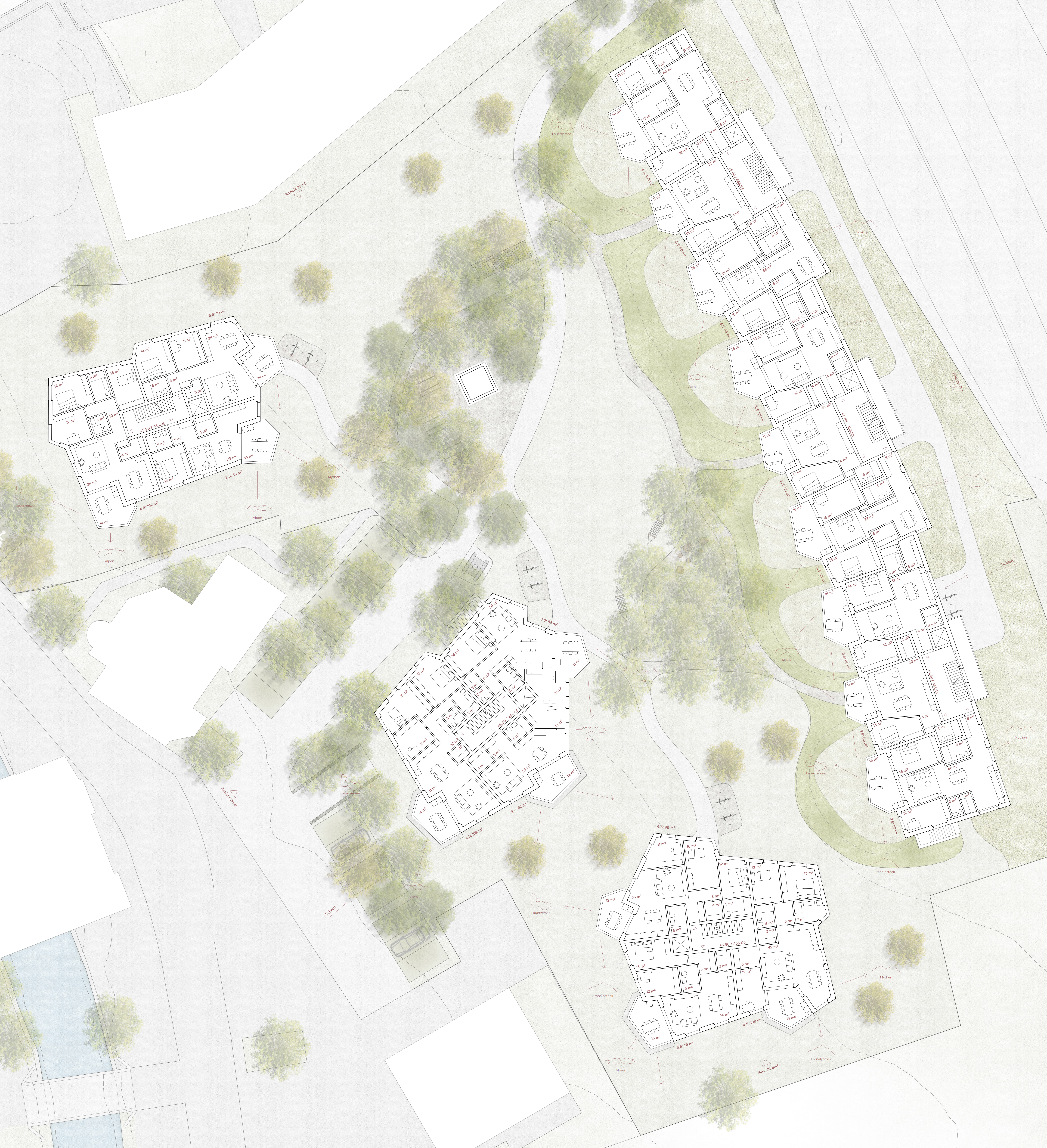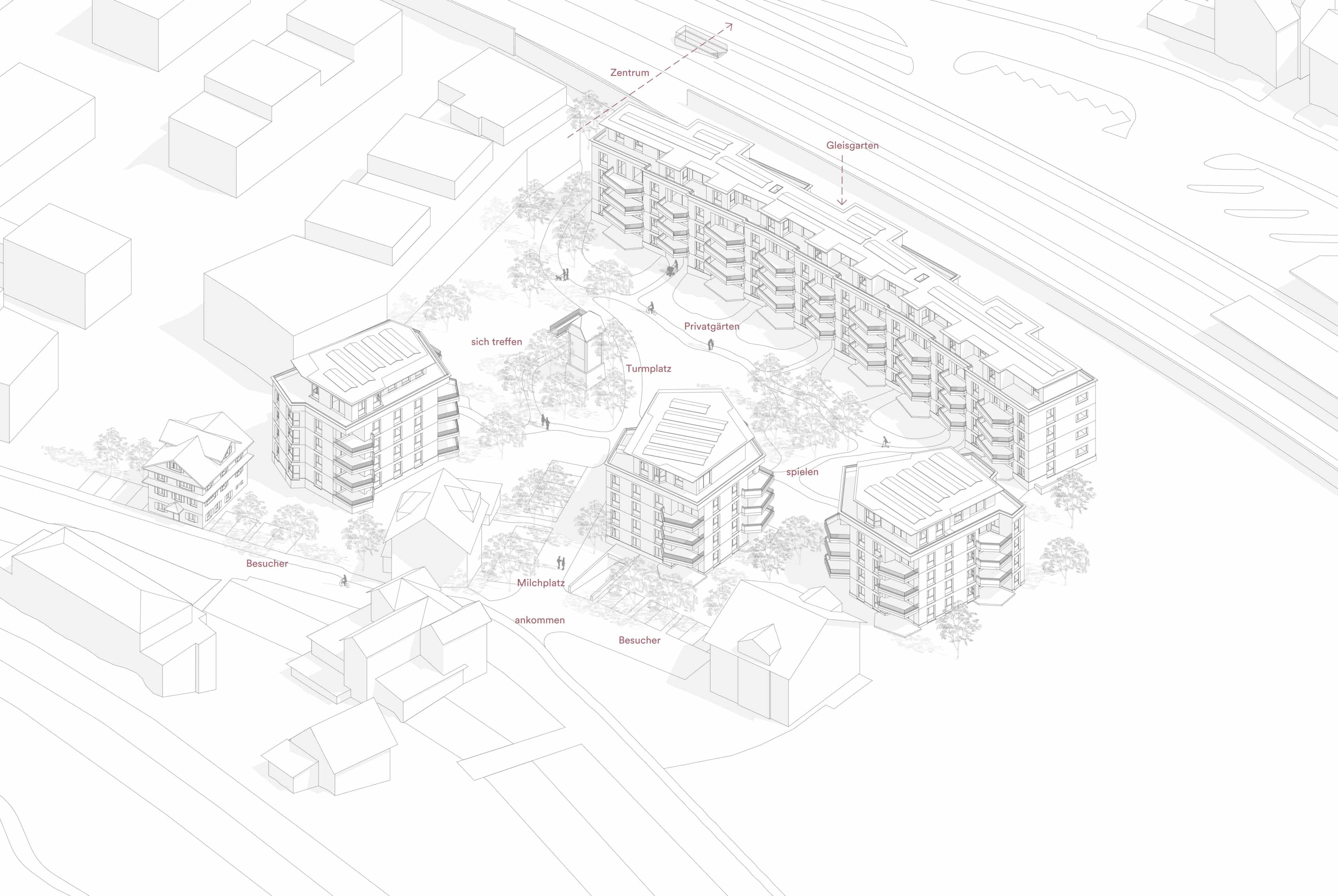 Der Riegelbau steht nahe der Eisenbahnlinie und die drei Punktbauten nahe den historischen Gebäuden. Dazwischen entsteht ein grosszügiger und ruhiger Freiraum mit Spiel- und Treffplätzen sowie einheimischen Grossbäumen und Obstbäumen. Durch die oben erwähnte Entschlüsselung des motorisierten und Langsamverkehrs bleibt das Quartier oberirdisch autofrei. Der öffentliche Wegrodel führt die Spaziergänger durch das Quartier. Der alte Trafoturm wird in seiner Lage leicht versetzt und bildet das Herzstück des Turmplatzes. Er erfährt dadurch eine grössere Bedeutung und ist von der Unterführung und der Seewerenstrasse aus gut sichtbar. Er prägt das Ortsbild des Quartiers. Das ansteigende Terrain zum Riegel hin ermöglicht eine intensive Bepflanzung mit grossen Bäumen. Die halböffentlichen Wege werden mit verschiedener Vegetation von den privaten Aussenbereichen abgetrennt.